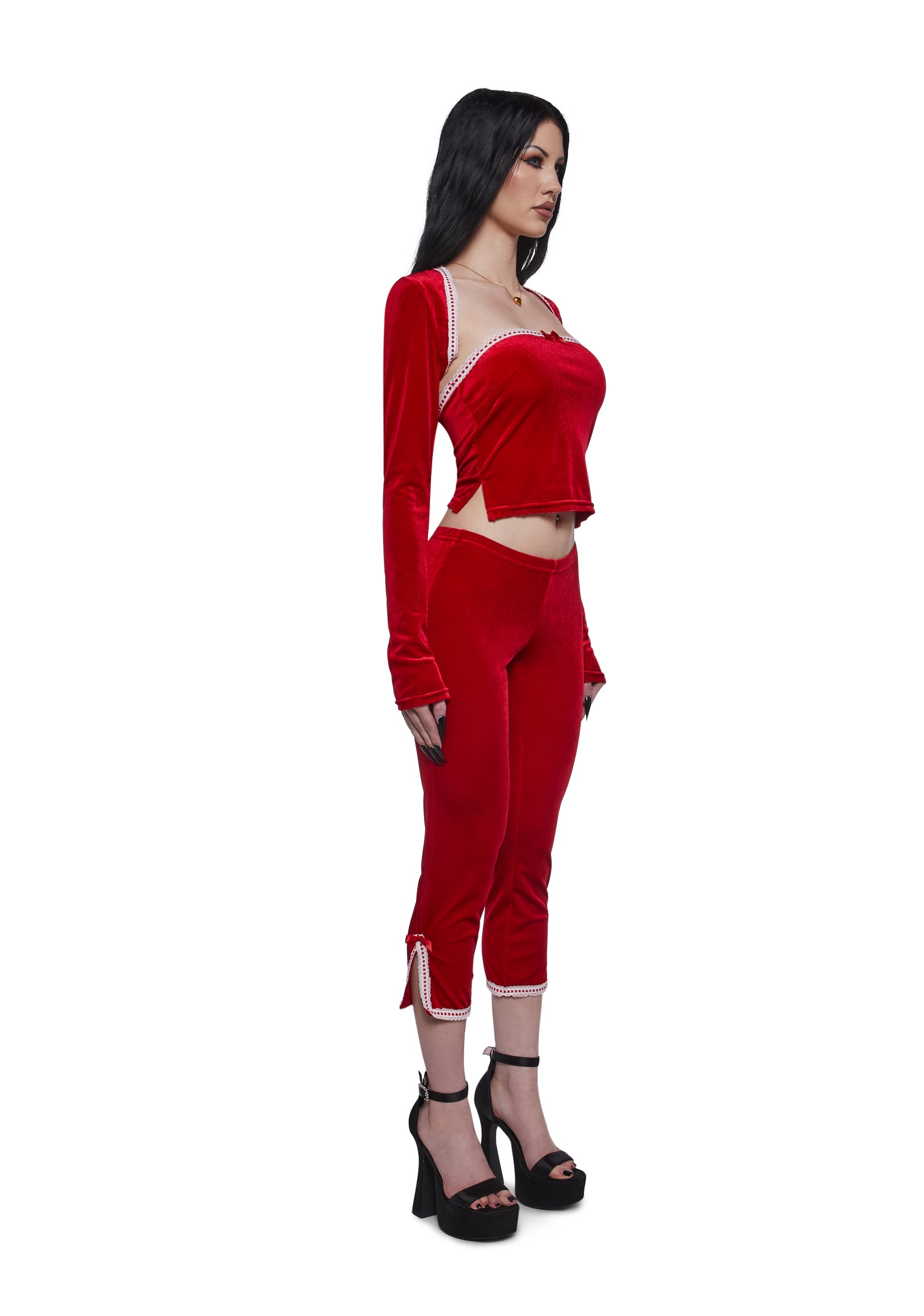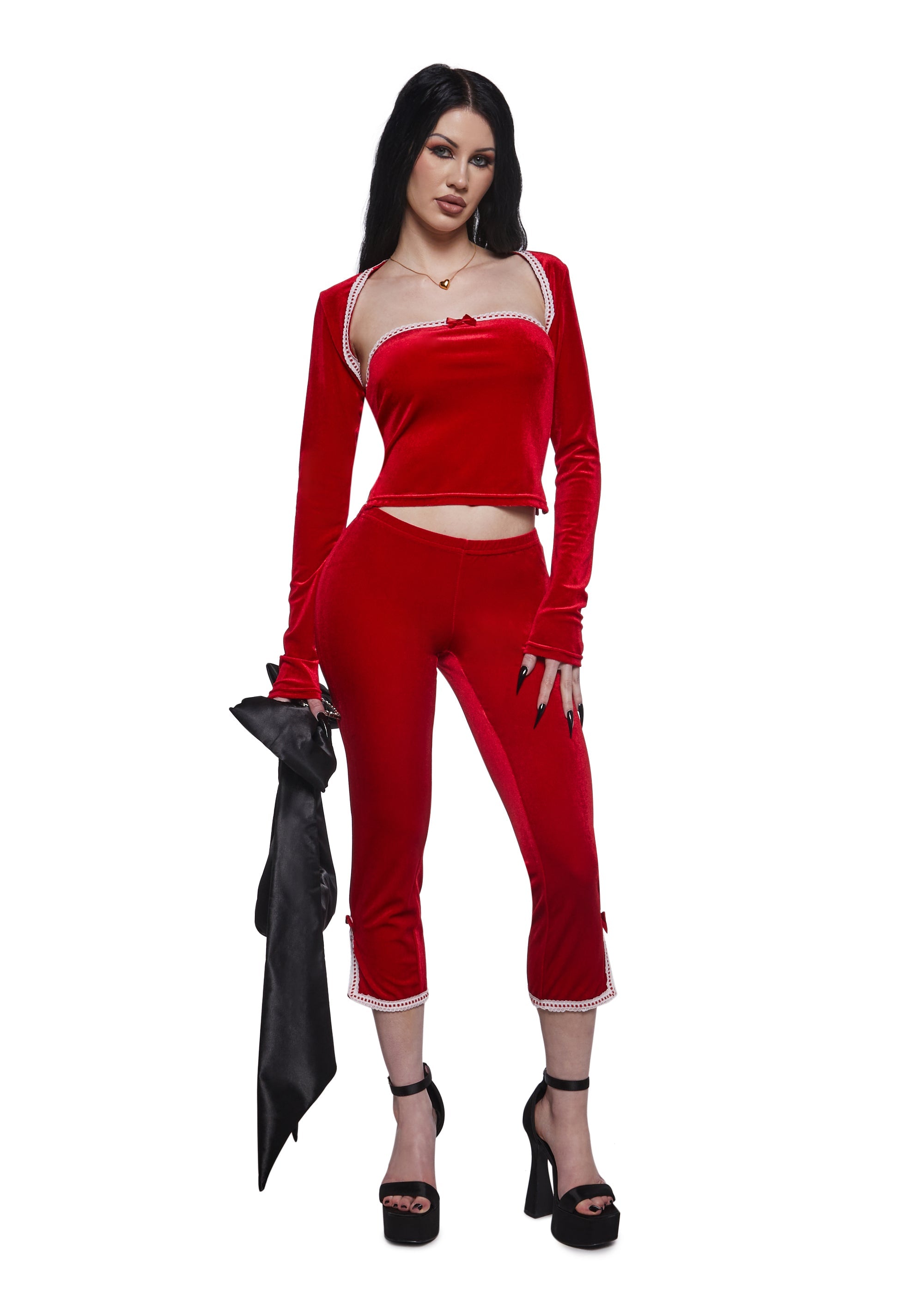 This set is comprised of a tube top that has a velour construction, an interlocking satin ribbon design, a decoraitve bow, a cropped fit, matching long sleeved shrug, and matching capri-length pants that are body-hugging and finished with coordinating white trim and small bow details near the ankles.