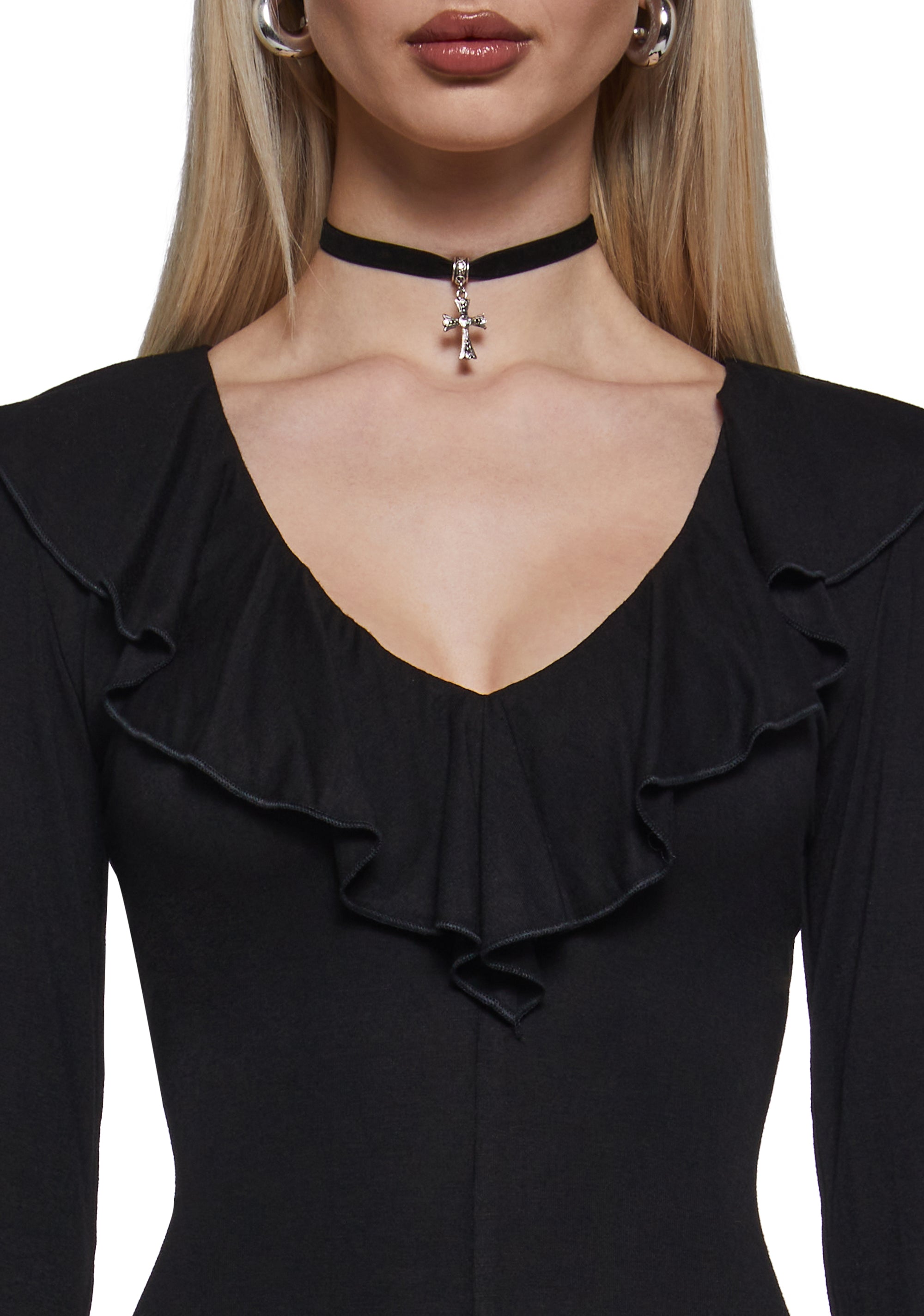 This romper has a stretchy rayon construction, long flared sleeves, a V-neckline, and ruffled details along the neckline.