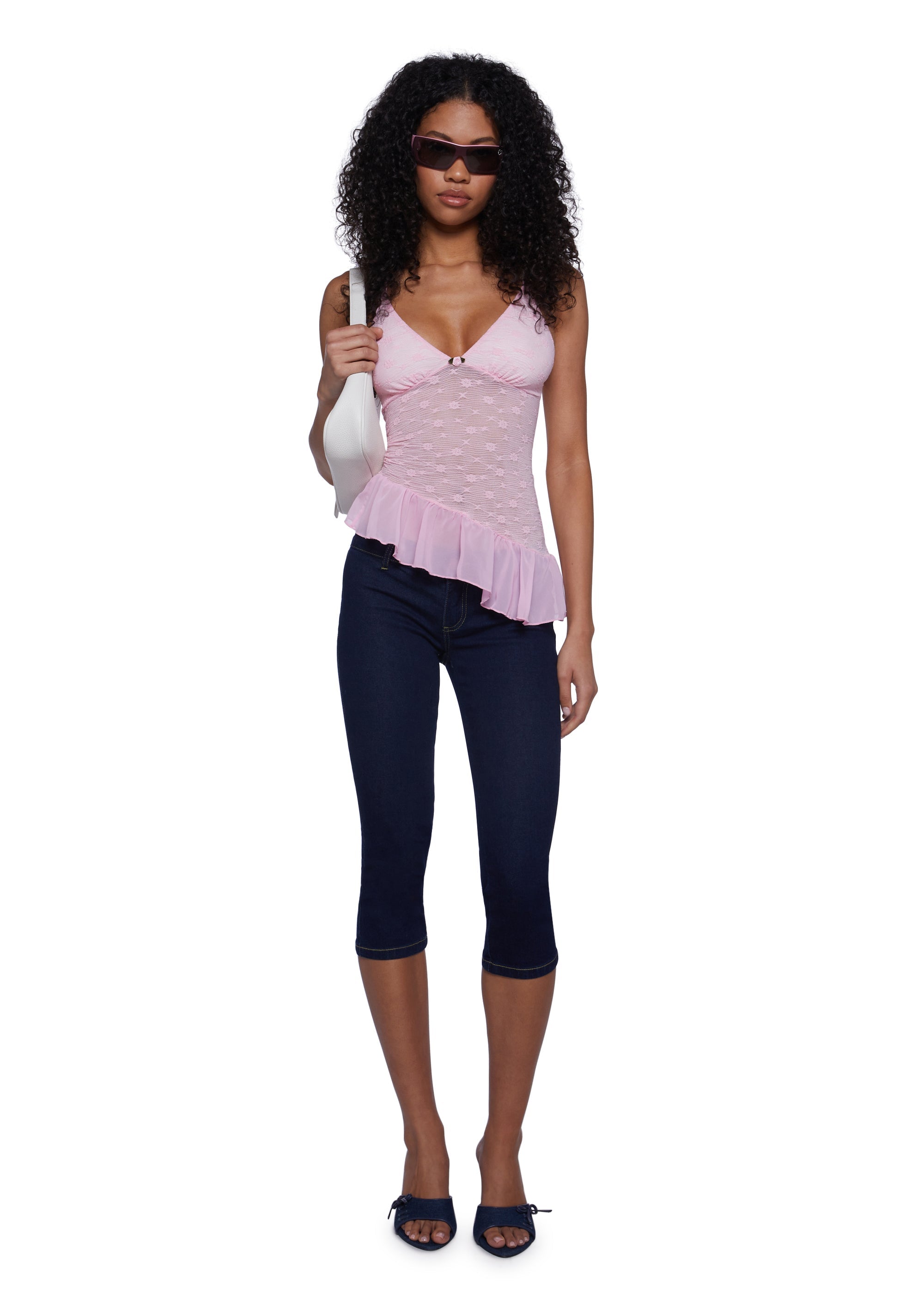 This top has a sheer textured puckered lace construction, a lined bust, a decorative rosette in the center, adjustable criss cross straps, a V-neckline, and an asymmetrical chiffon hem.