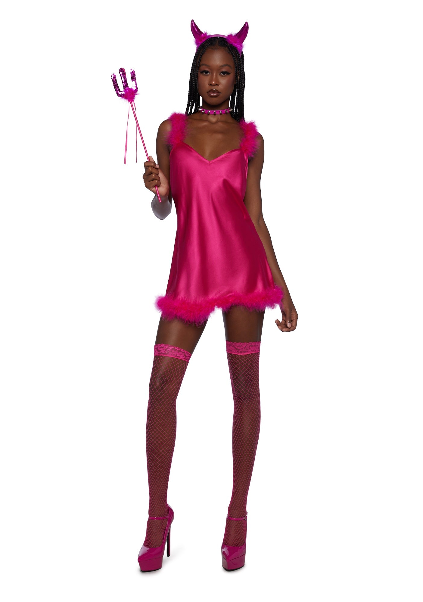 got ya up close N' personal with evil. Submit to Satan in this hellishly hottt mini dress costume set that has flirty faux fur trim, adjustable straps and comes with a fiery pitchfork, fishnet thigh-highs and a horny headband.