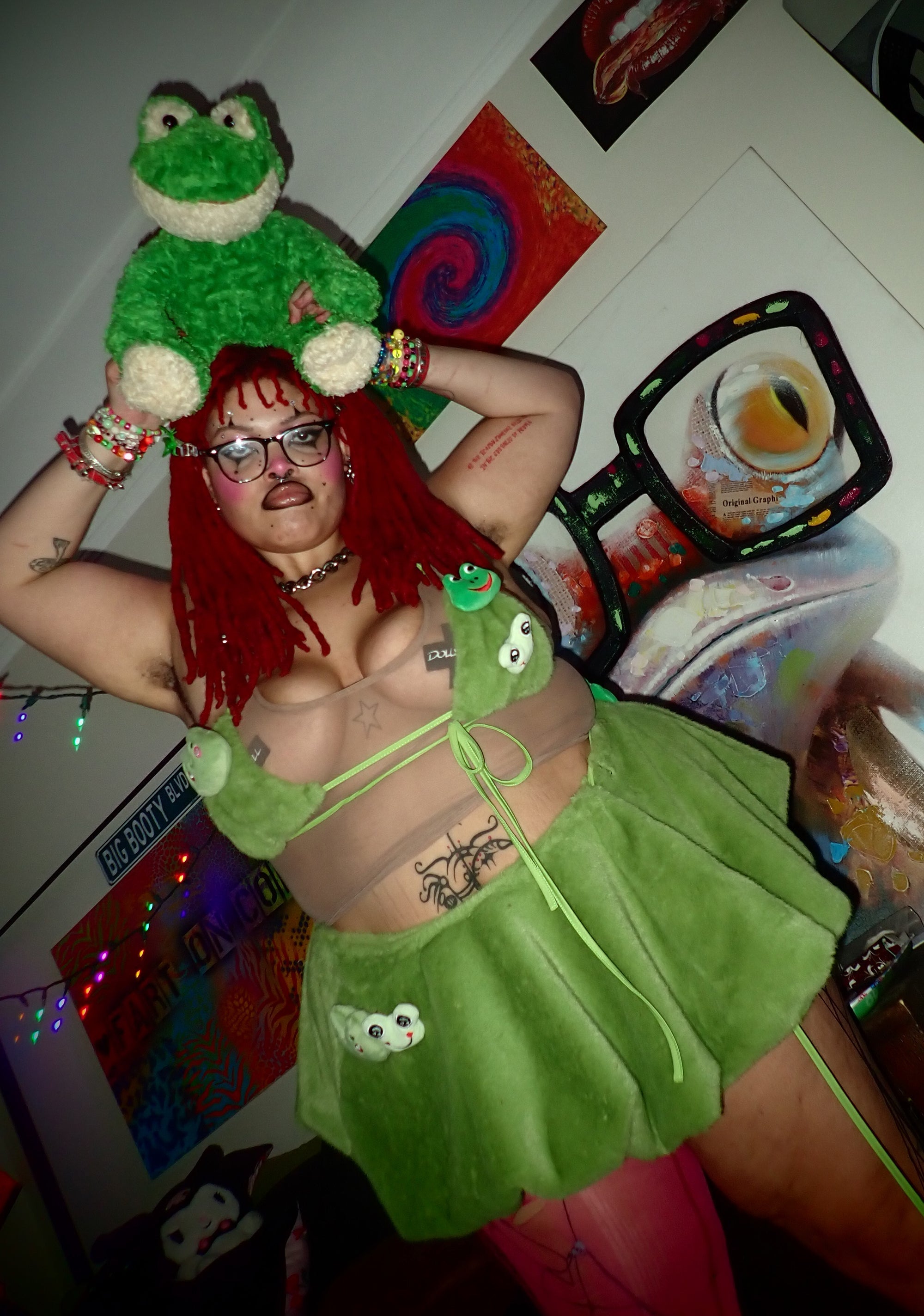 Show your love of frogs with this triangle bra top that has a faux fur construction, frog plushies on the cups, adjustable back tie closures, and a matching skirt with adjustable side tie closure.
