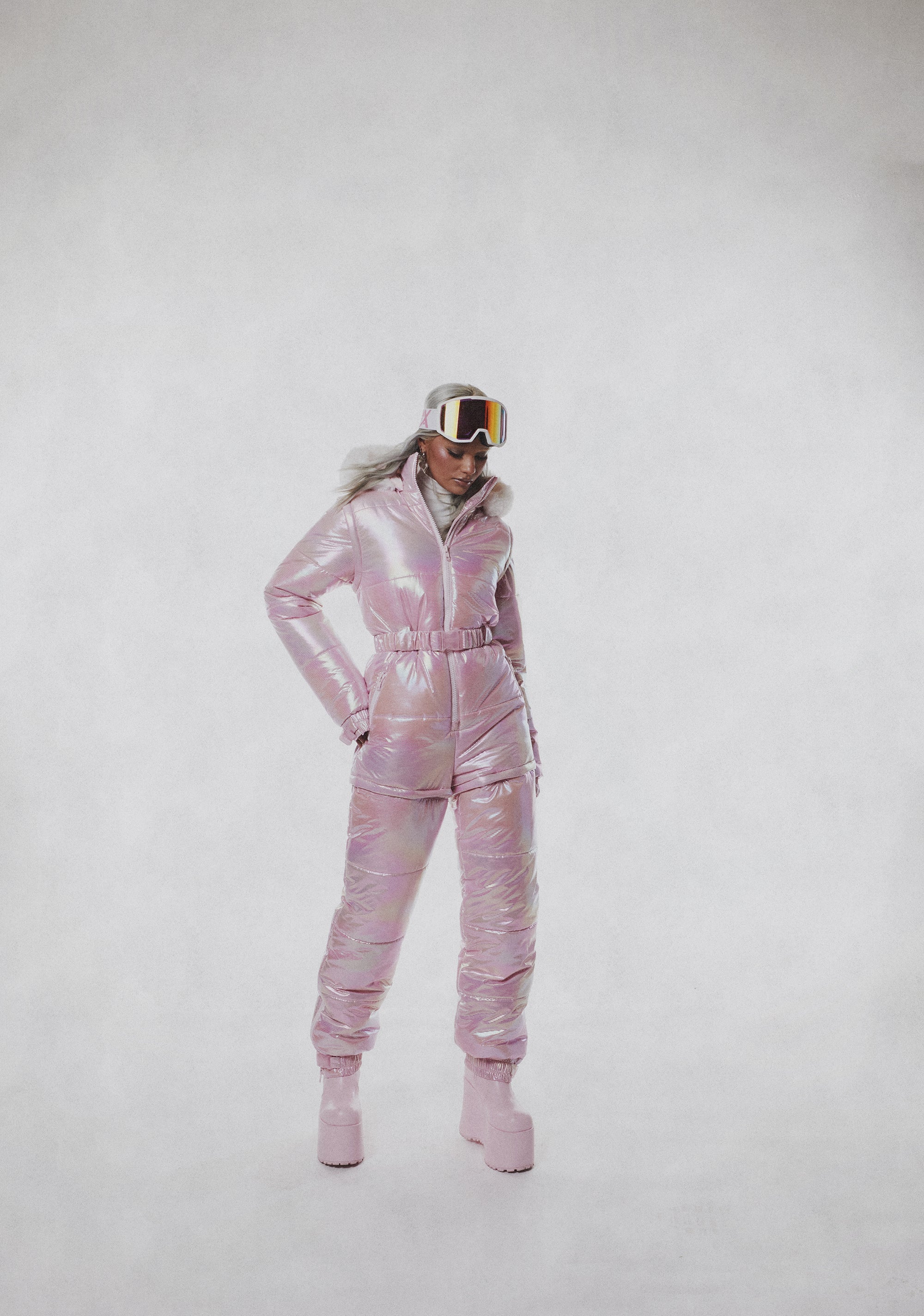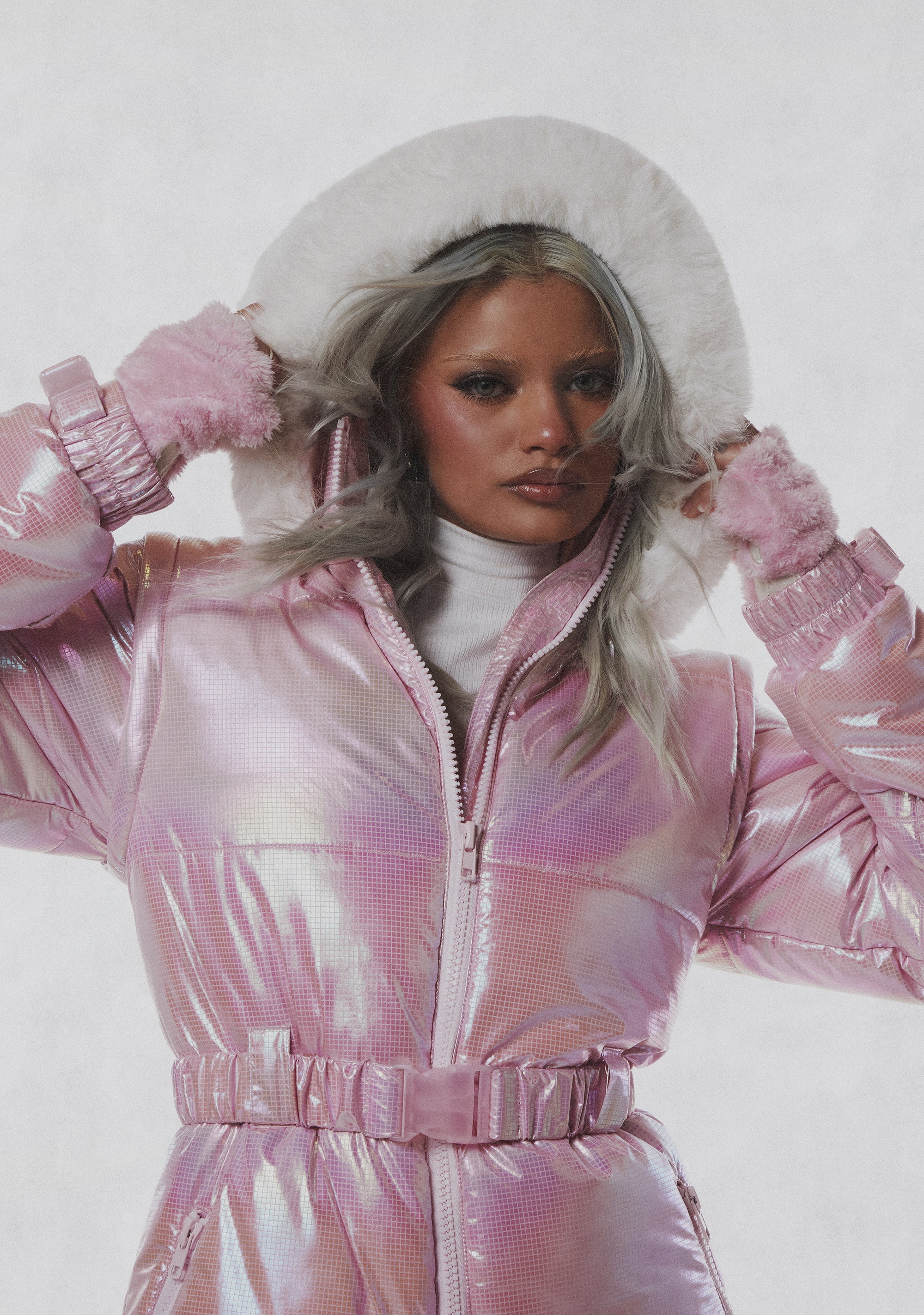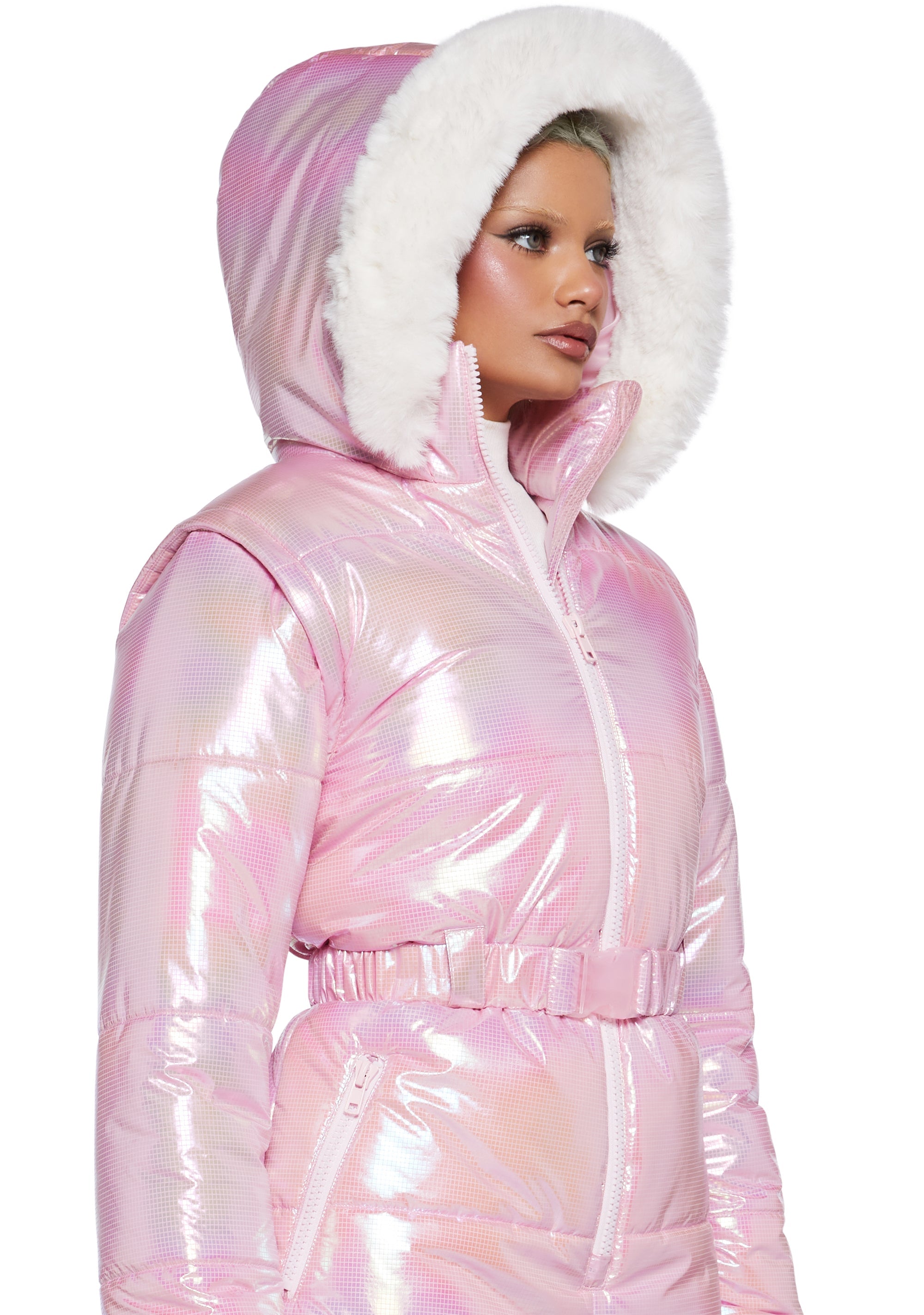 This snowsuit has a nylon construction with an iridescent sheen, a tiny grid pattern, an attached hood with faux fur trim, elastic cuffs, a removable elastic belt with a buckle closure, side zippered pockets, and removable arms and legs with zipper closures, all finished with a front zipper closure.