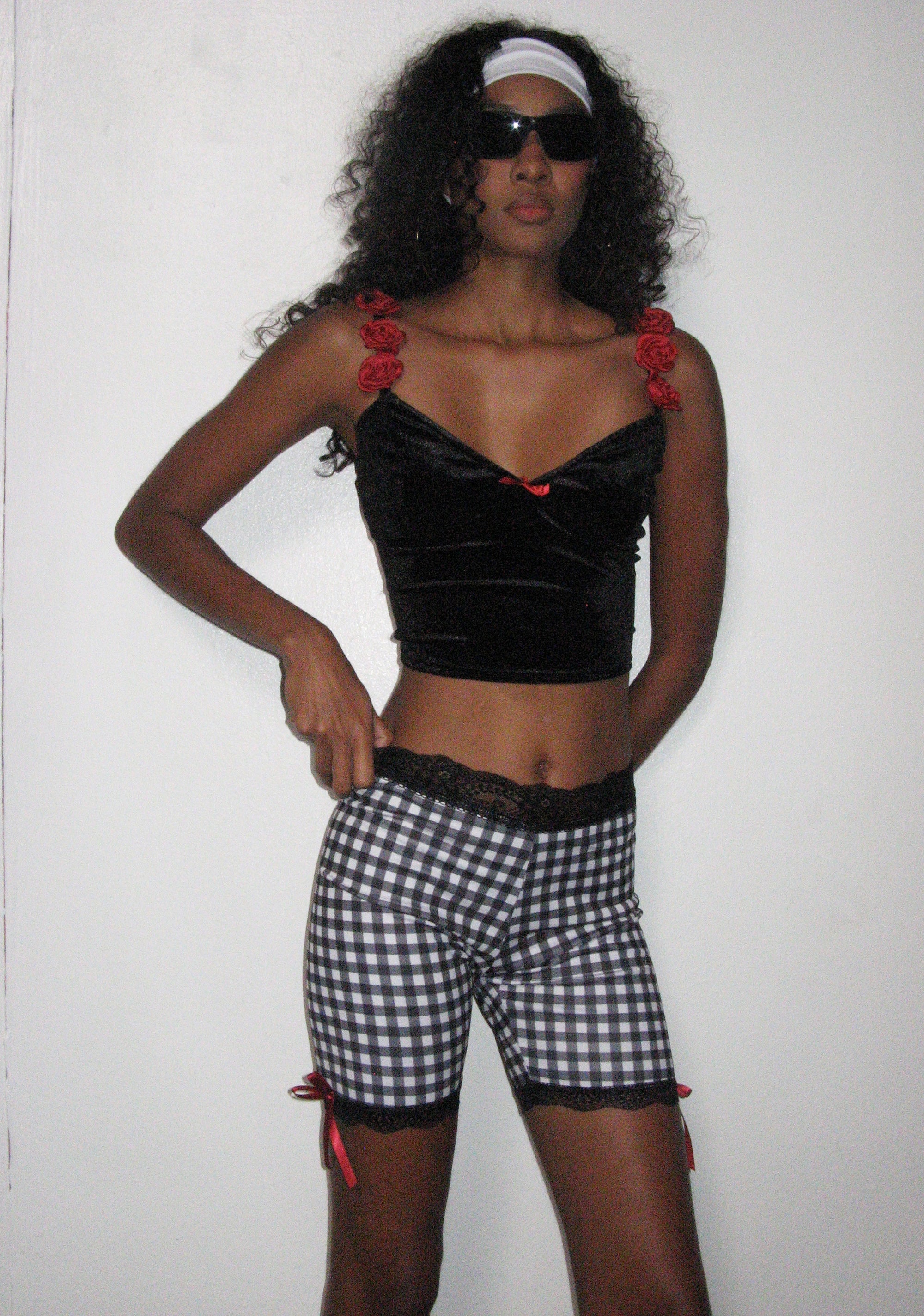 This corset top has a stretchy velour construction with a shirred back, a front bow applique, and adjustable shoulder straps adorned with rose appliques.