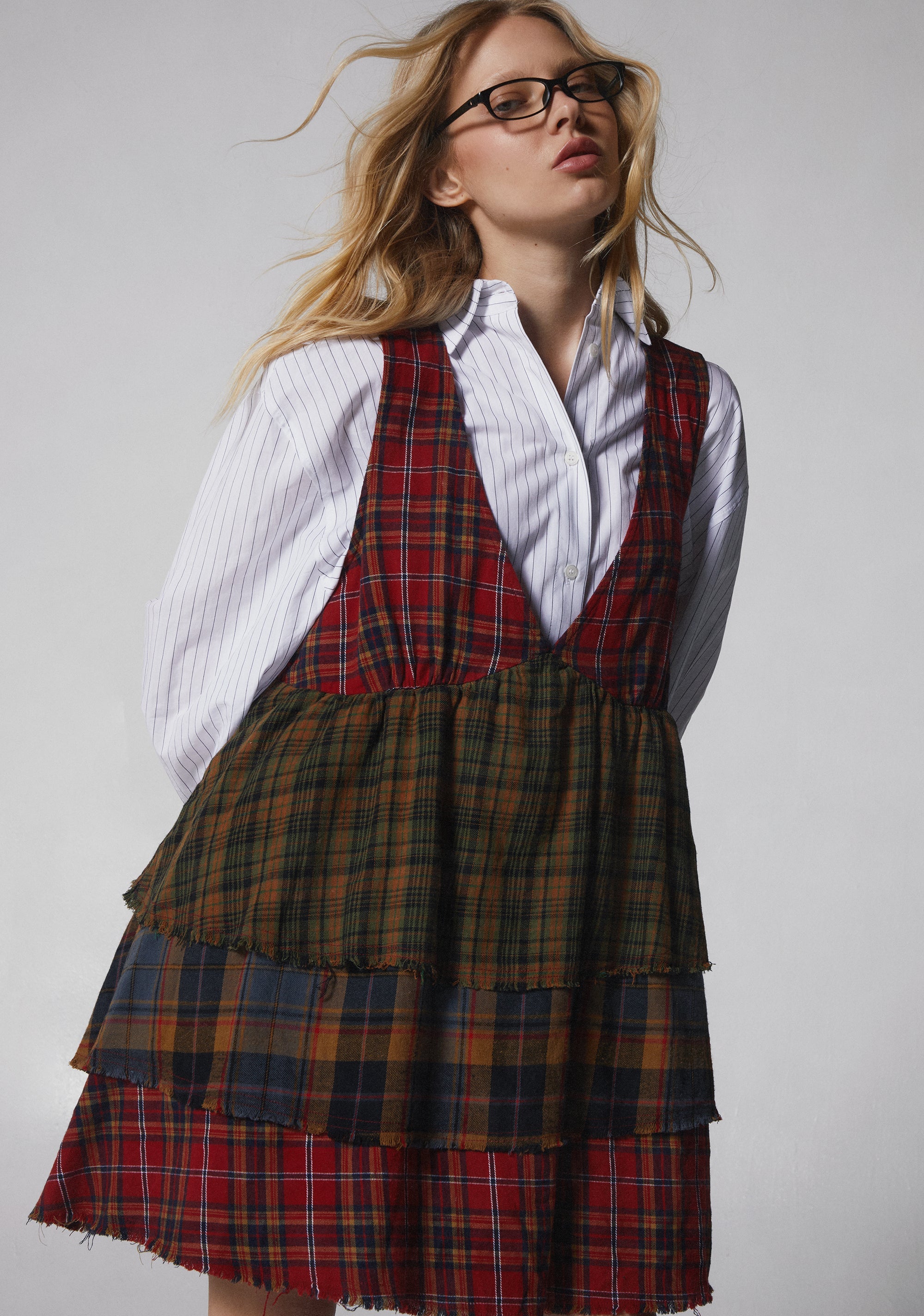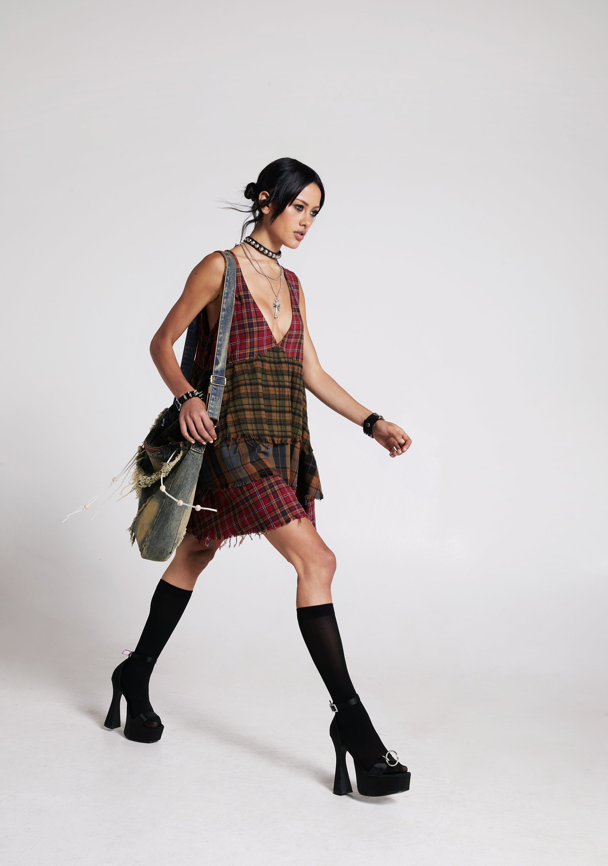 This babydoll dress has a mixed flannel construction with a tiered design, a deep v-neckline, and a raw hem.