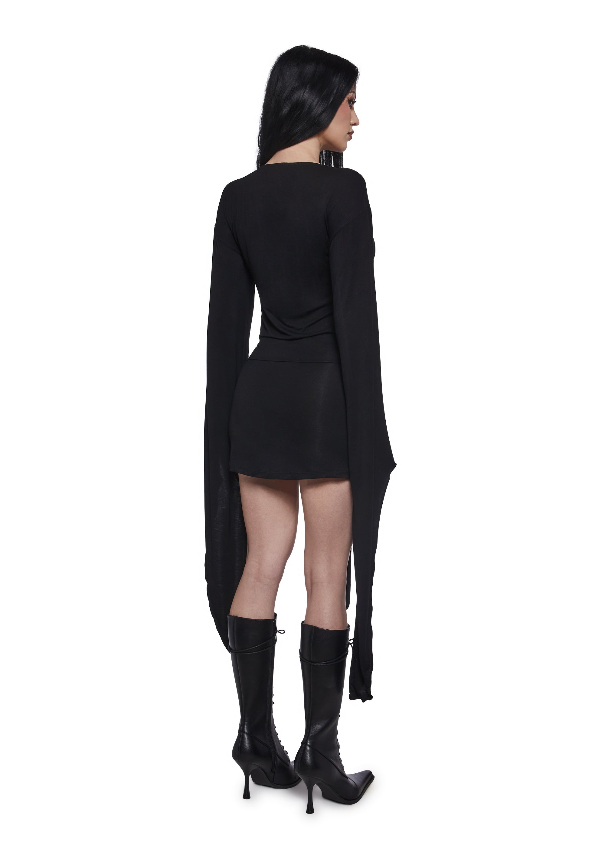 Own the night in this bold mini dress featuring a deep plunging neckline, dramatic long draped sleeves, and a sleek wrap-front tie that cinches the waist for a striking silhouette.