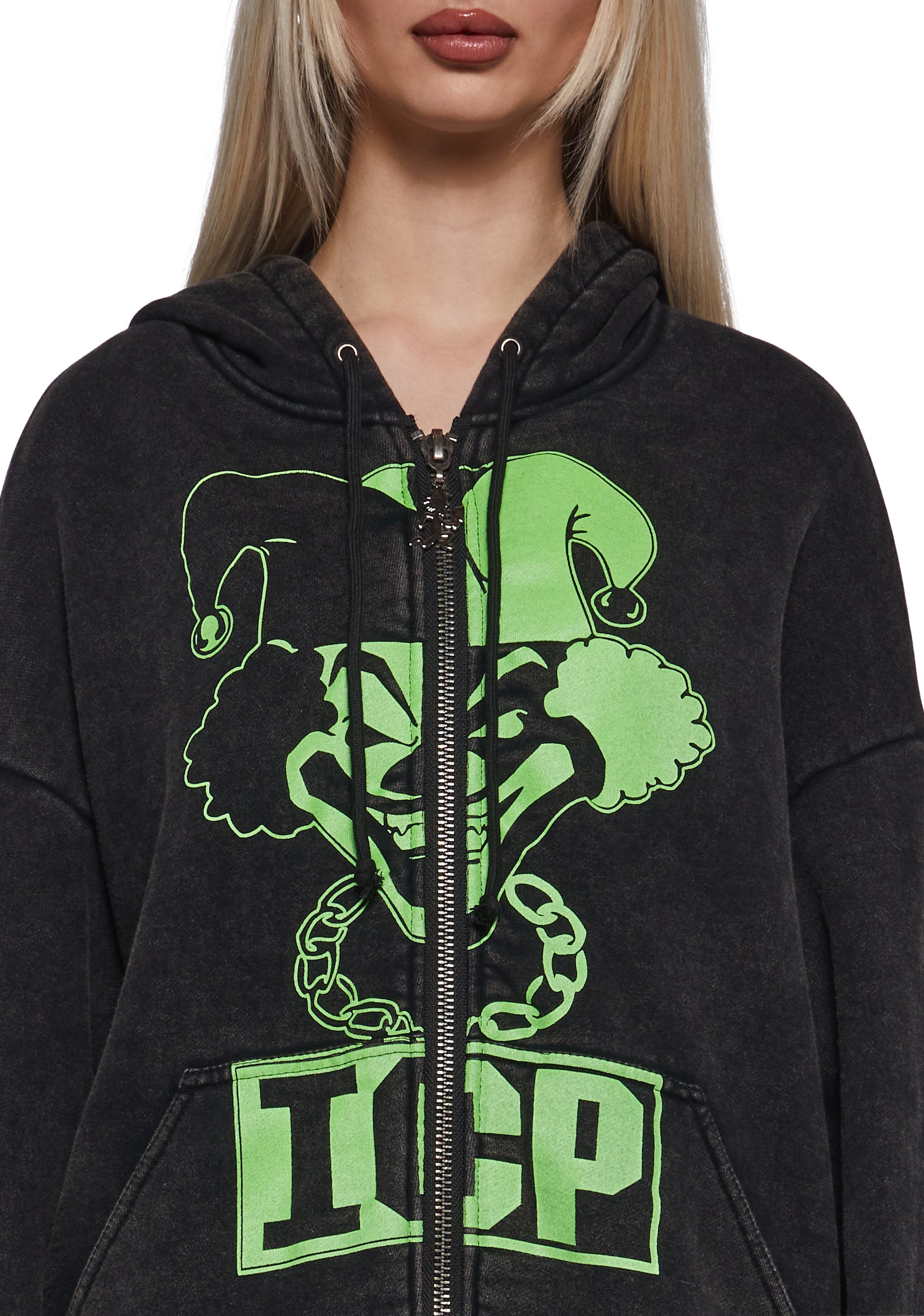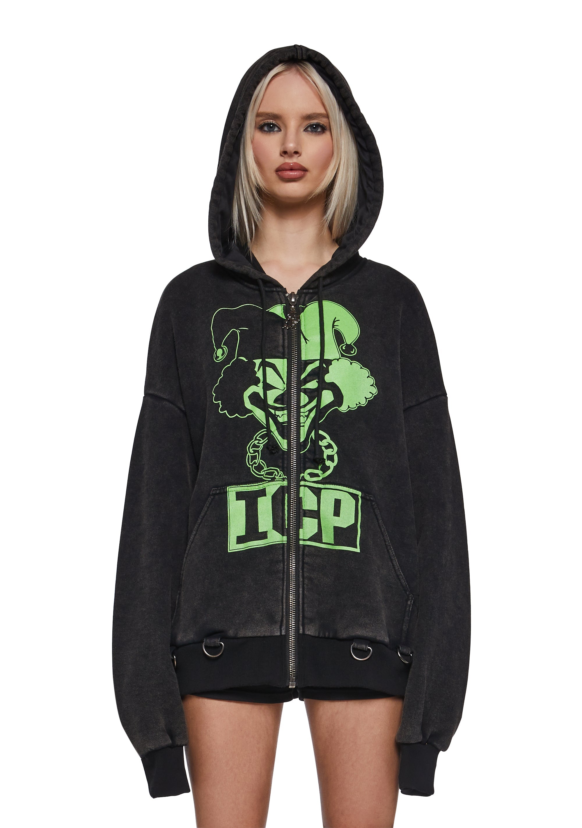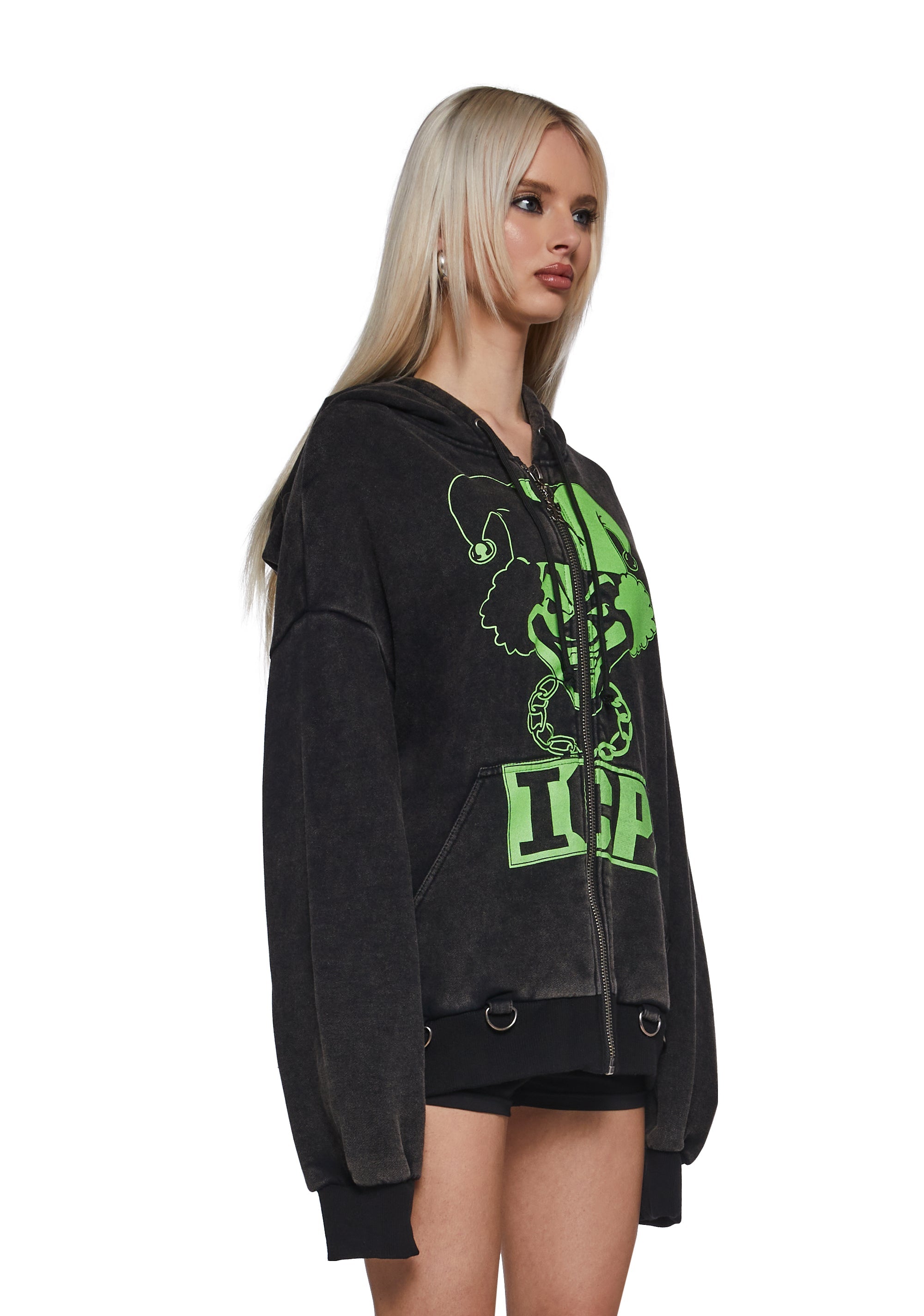 This hoodie has a washed cotton construction, glows in the dark, Carnival of Carnage album logo printed on the front, D-ring hardware, kangaroo pockets, attached hoodie with faux fur pom poms, adjustable ties, an oversized fit, and a front zipper closure.
