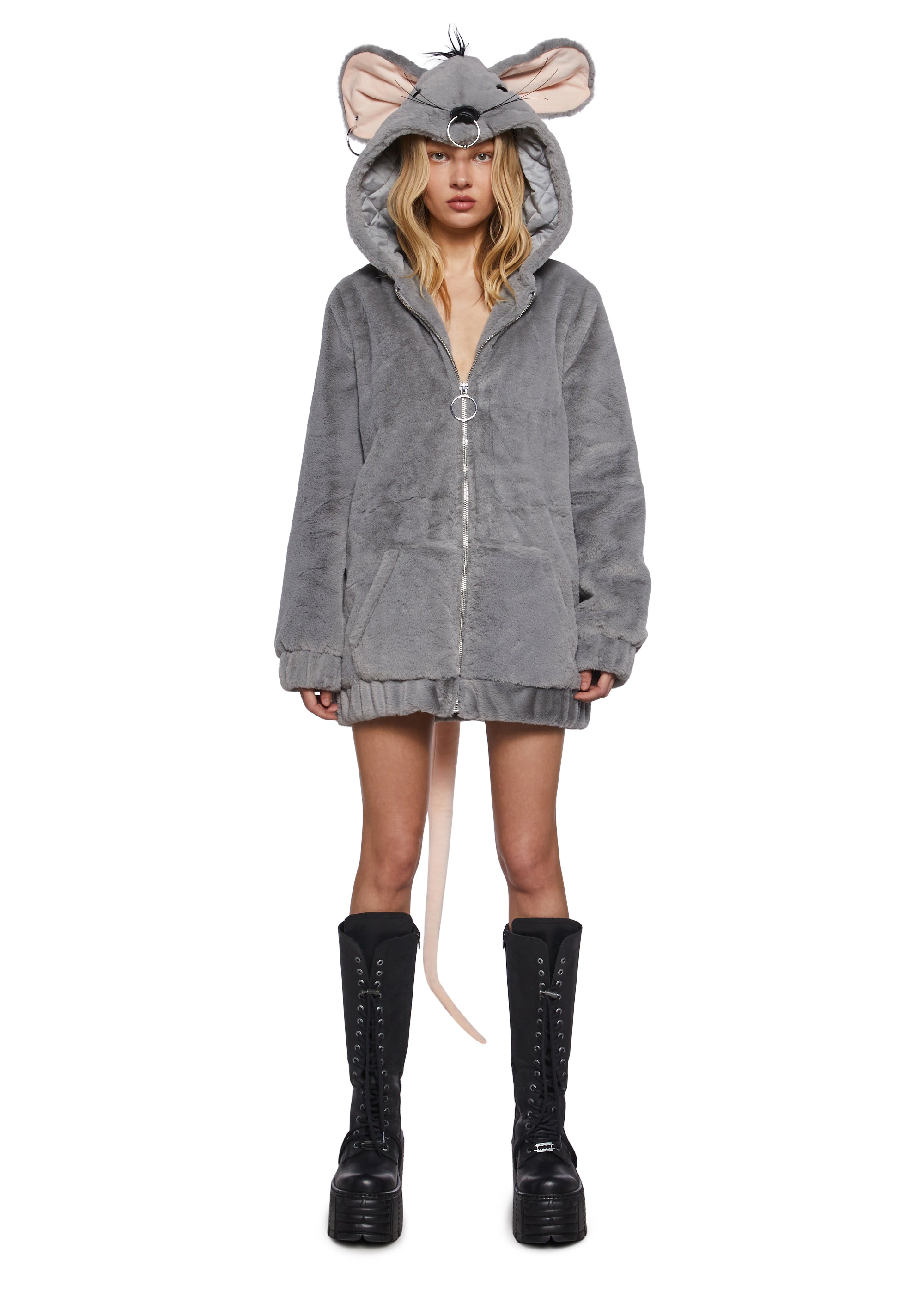 Rule the city in this zip-up jacket featuring a faux fur construction, kangaroo front pockets, and an attached hood with rat eyes, a nose, ears, and O-ring hardware, complete with a front zipper closure.