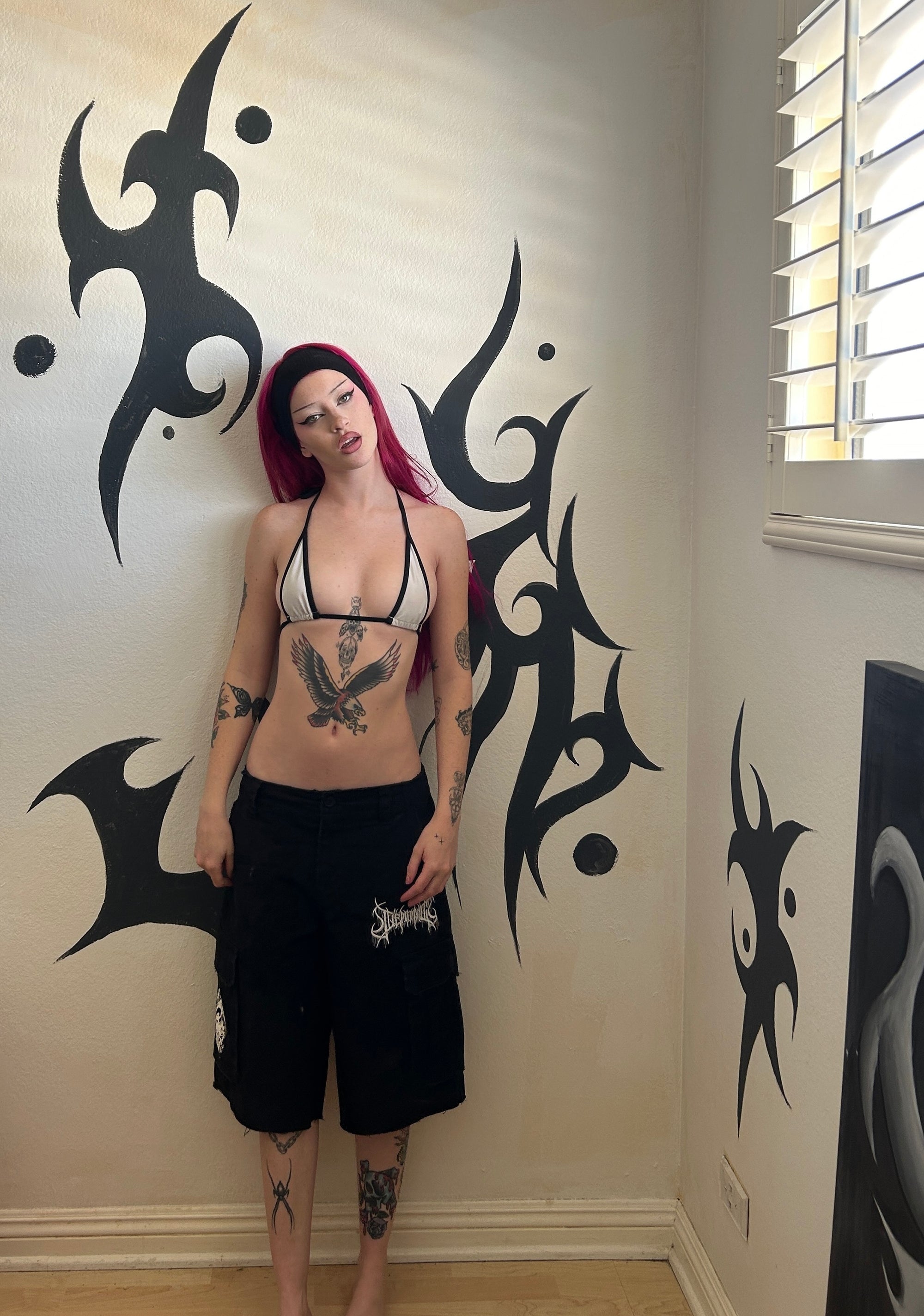 These shorts have a twill construction, a distressed look, front and back pockets, cargo pockets with flap closures, embroidered and printed goth designs on the front and back, a low rise fit, and a front button and zipper closure.