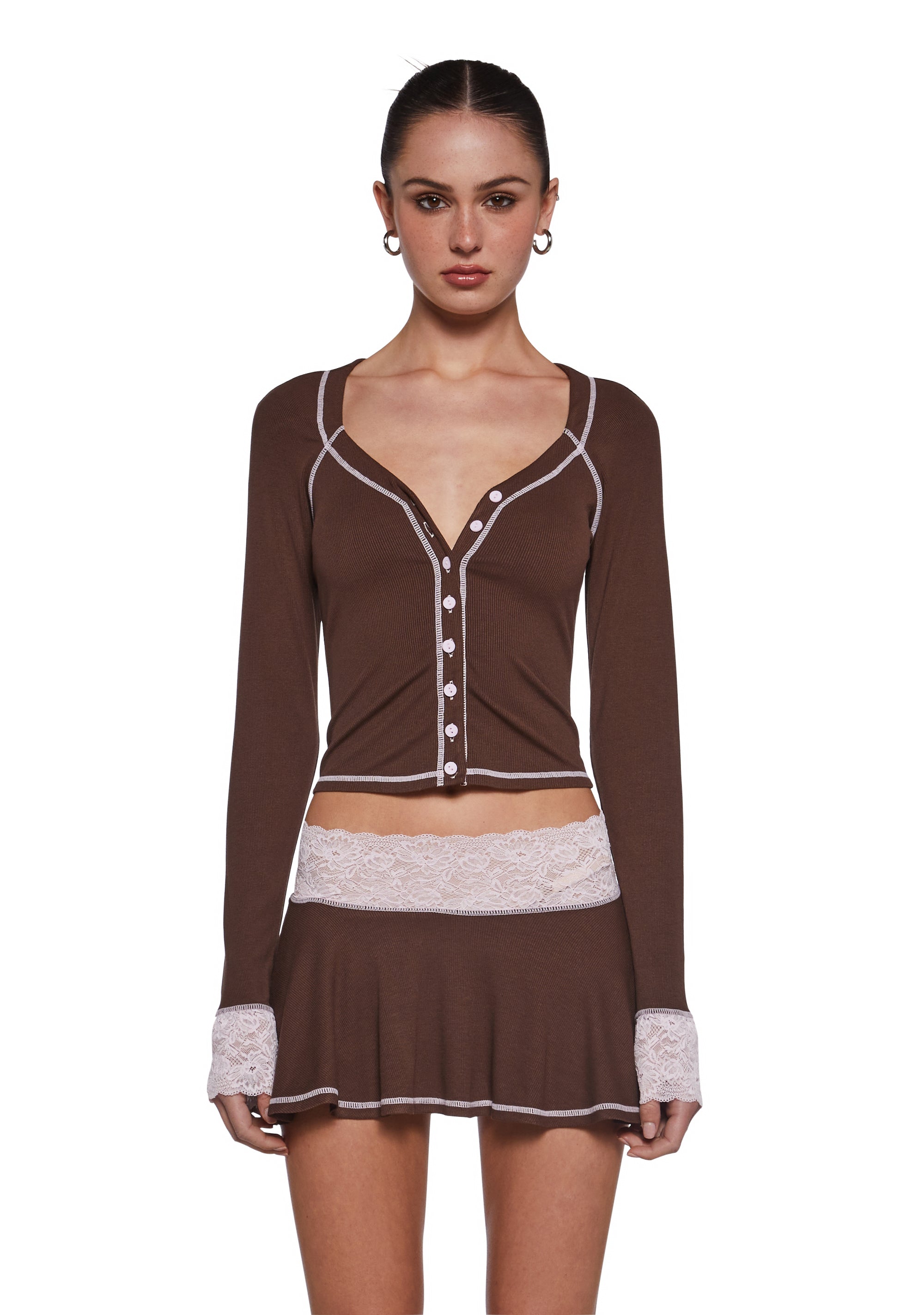 This set includes a long sleeve top that has a ribbed construction, contrast colored stitching, lace trimmed cuffs, a plunging neckline with front button closures, and a matching skirt.