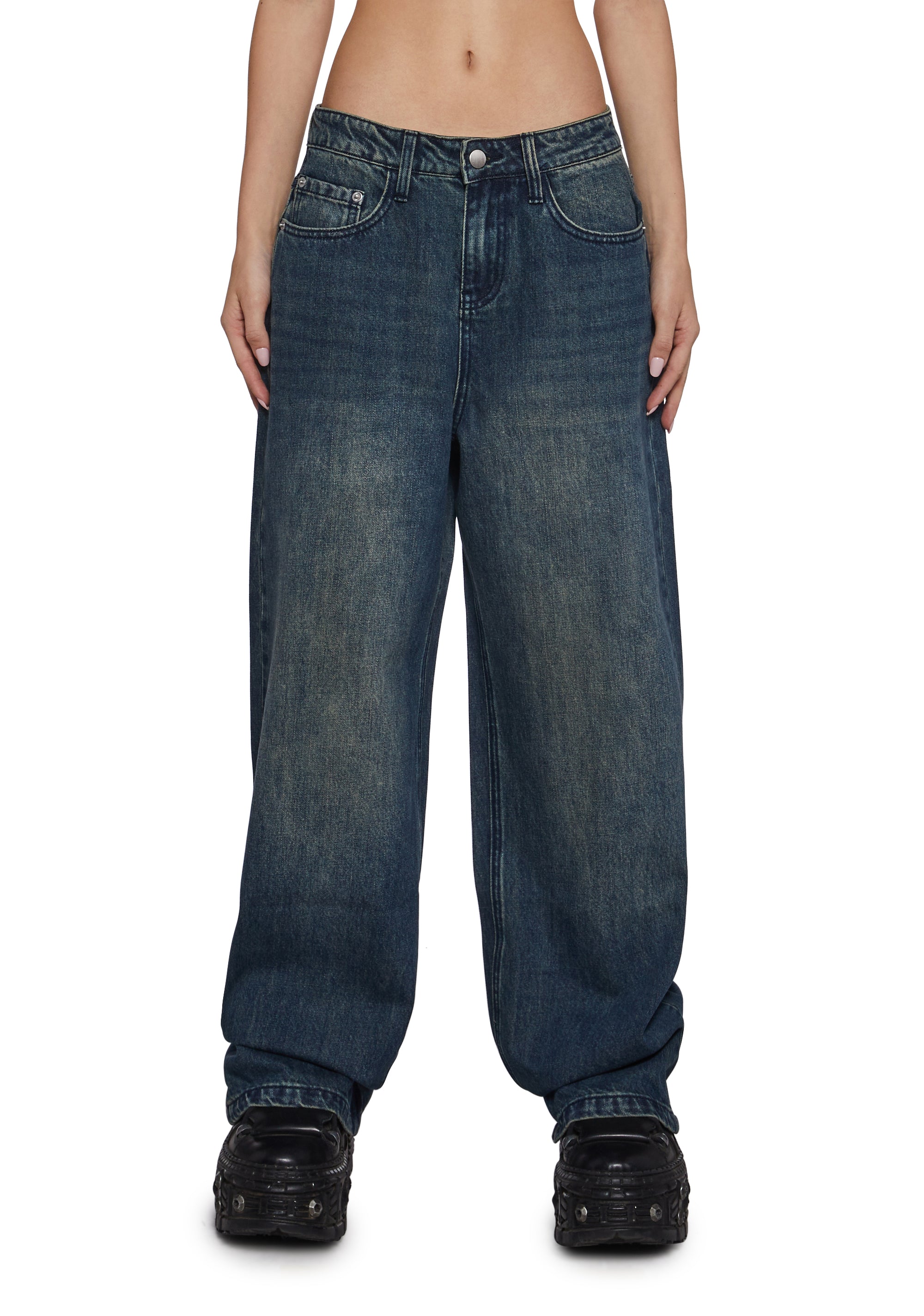 These jeans have a denim construction, a wide leg silhouette, angel wing graphics on the back, front and back pockets, and a front button and zipper closure.