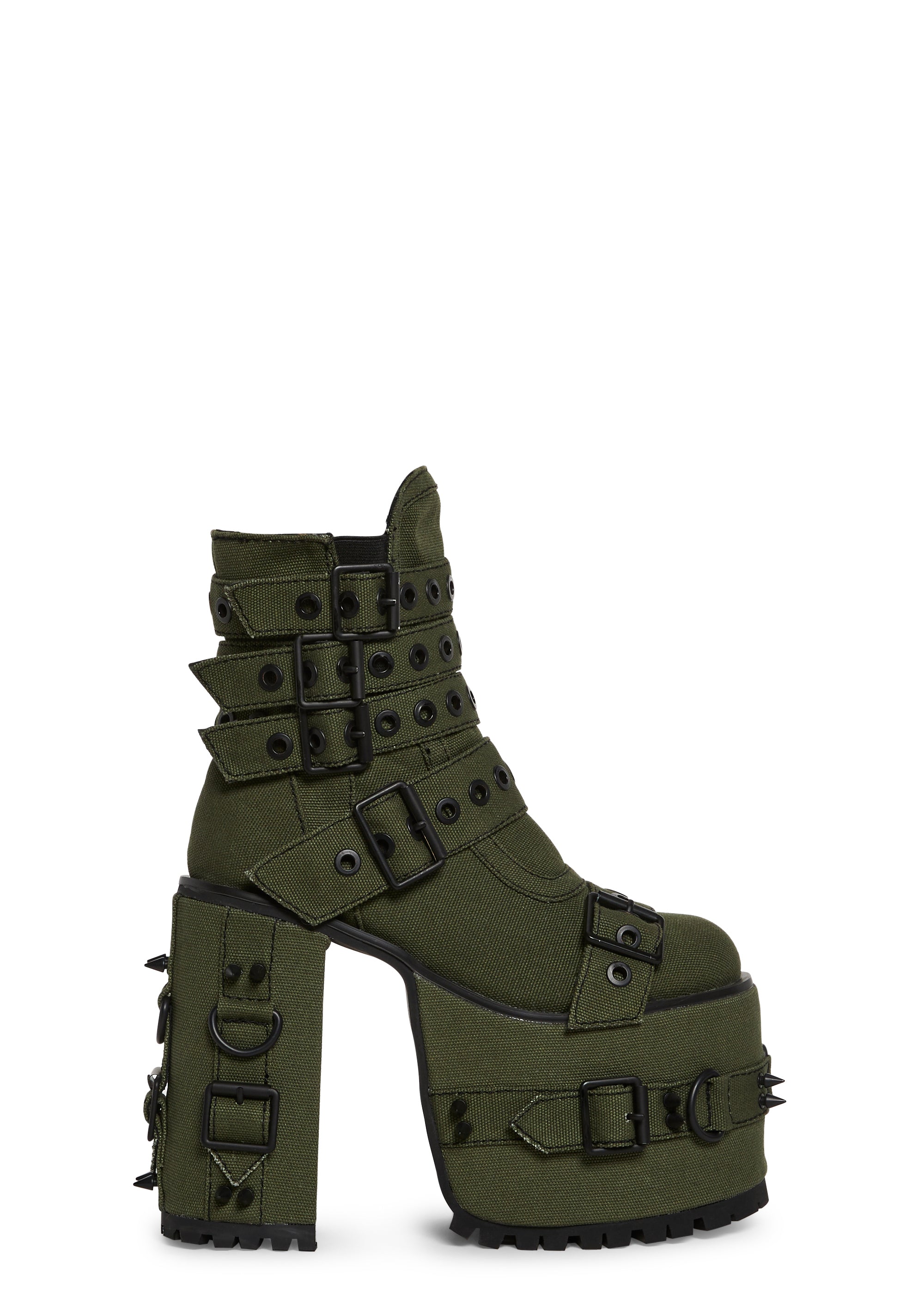 These boots have a canvas construction, spiked studs and D-ring buckle details on the heels and platforms, a round toe design, adjustable buckles, and side zipper closures.