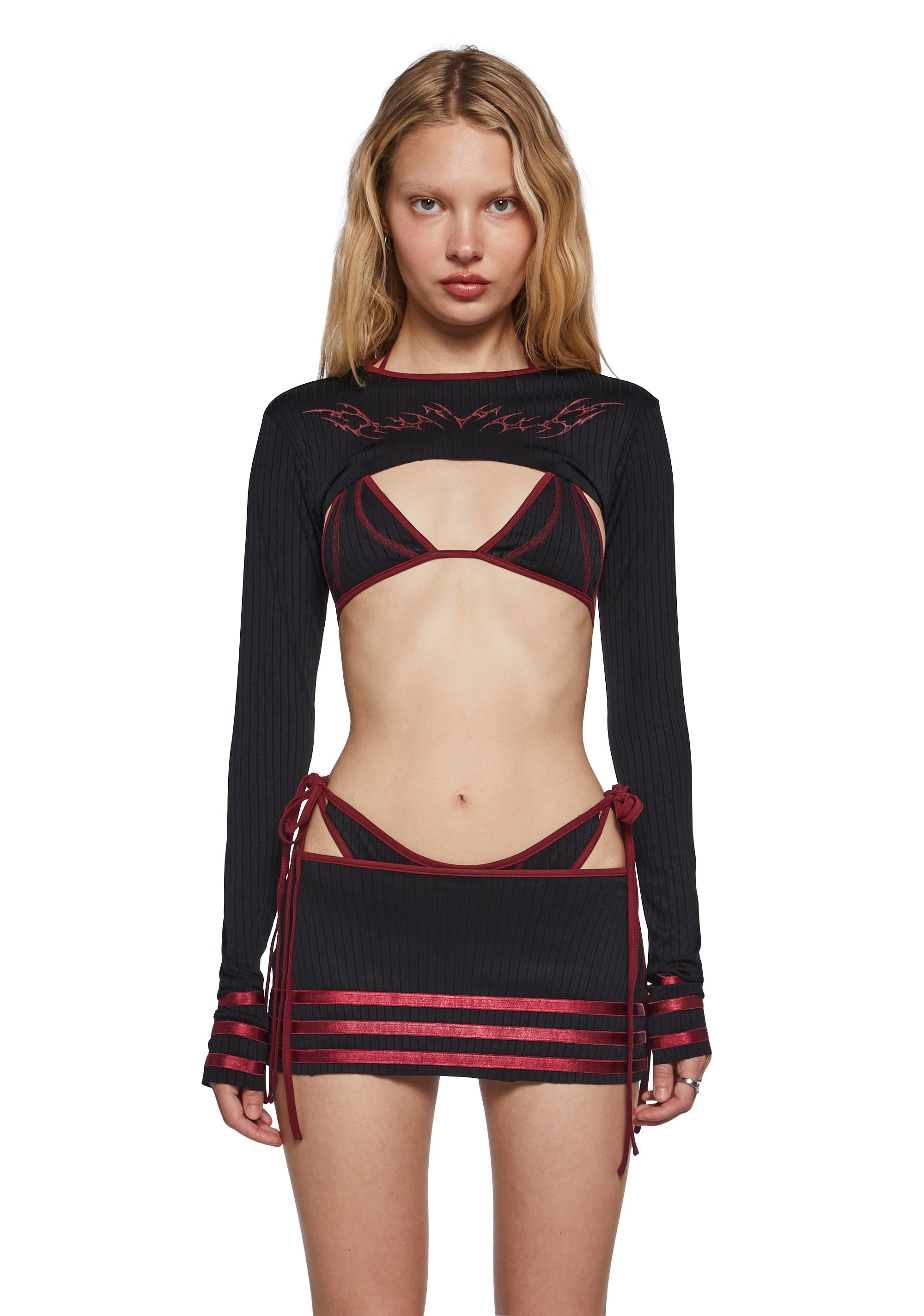 This set features a triangle bra top that has a ribbed construction, contrast colored stitching, back tie closures, and a matching shrug with front graphic designs, and ribbon appliques on the cuffs.