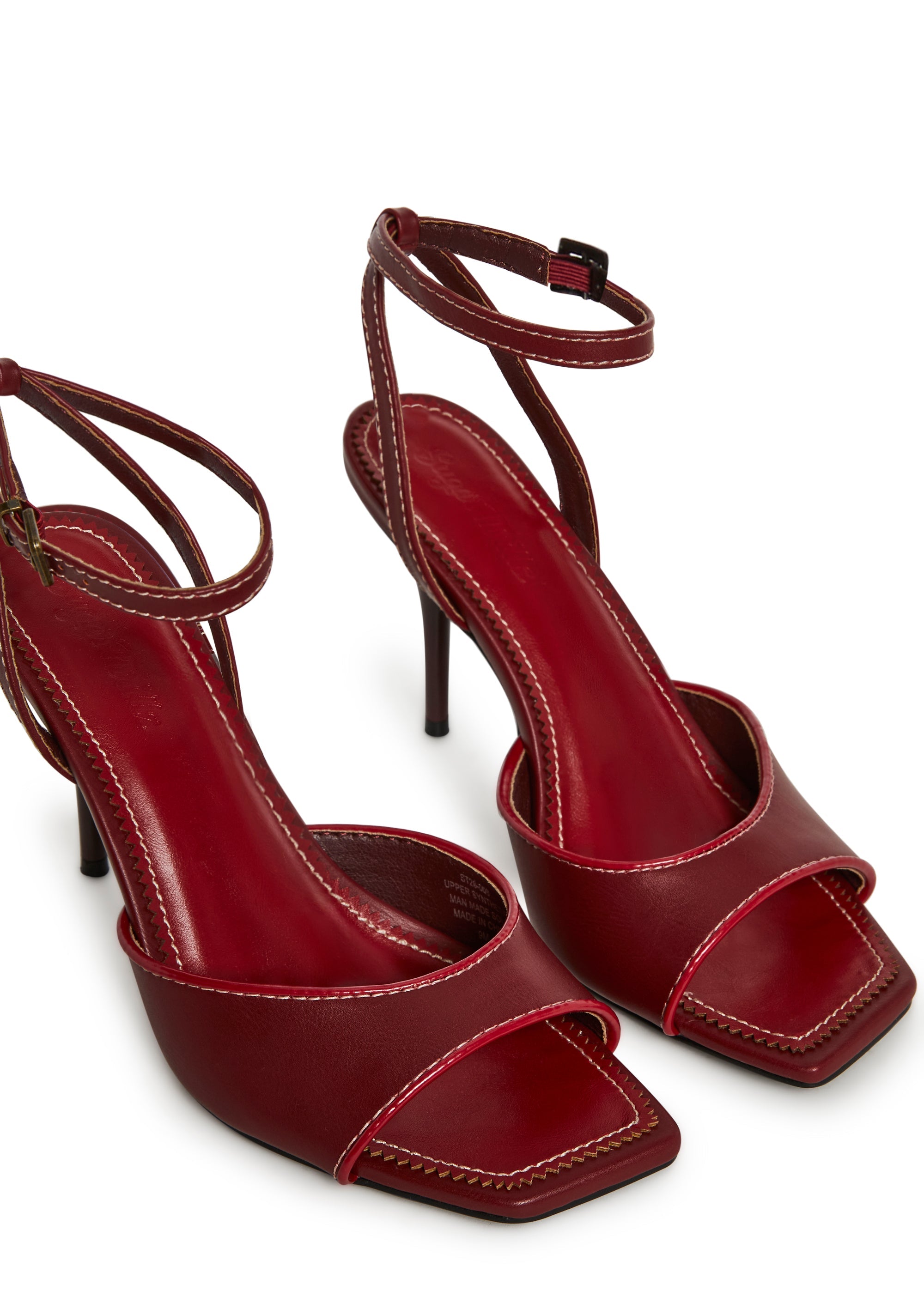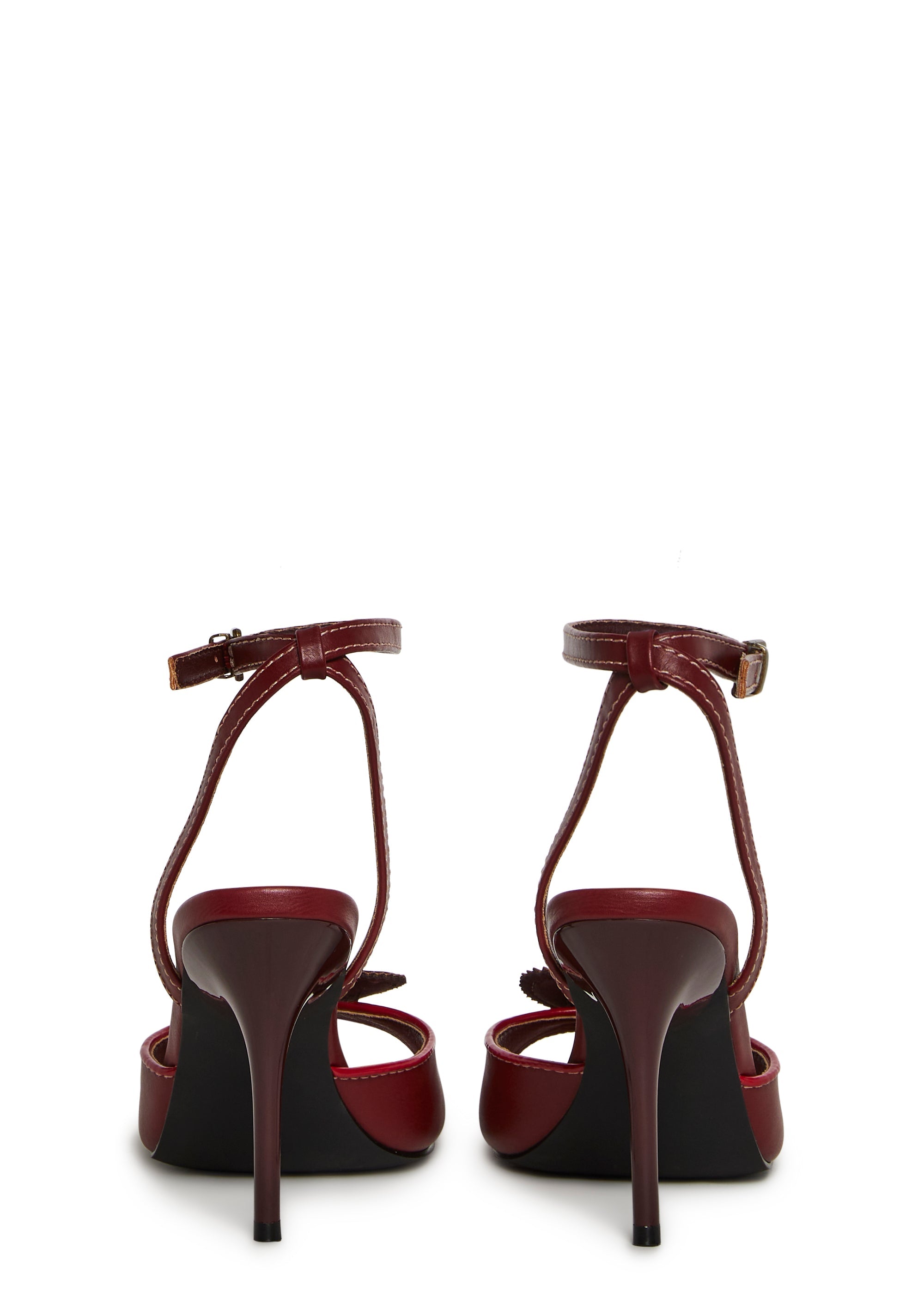 Make an unforgettable entrance with these fiery red heels designed for the daring and unapologetically confident. Crafted with smooth leather and accented by contrast stitching, this pair features a playful heart embellishment on each shoe, complete with cheeky script detailing. Each heart piece is fully removable, giving you the option to switch between a bold statement look or a sleek, minimalist finish.