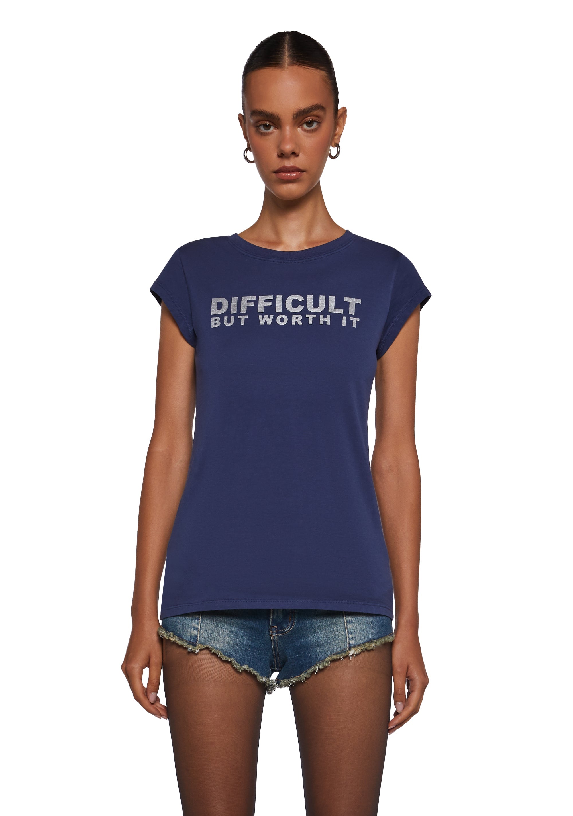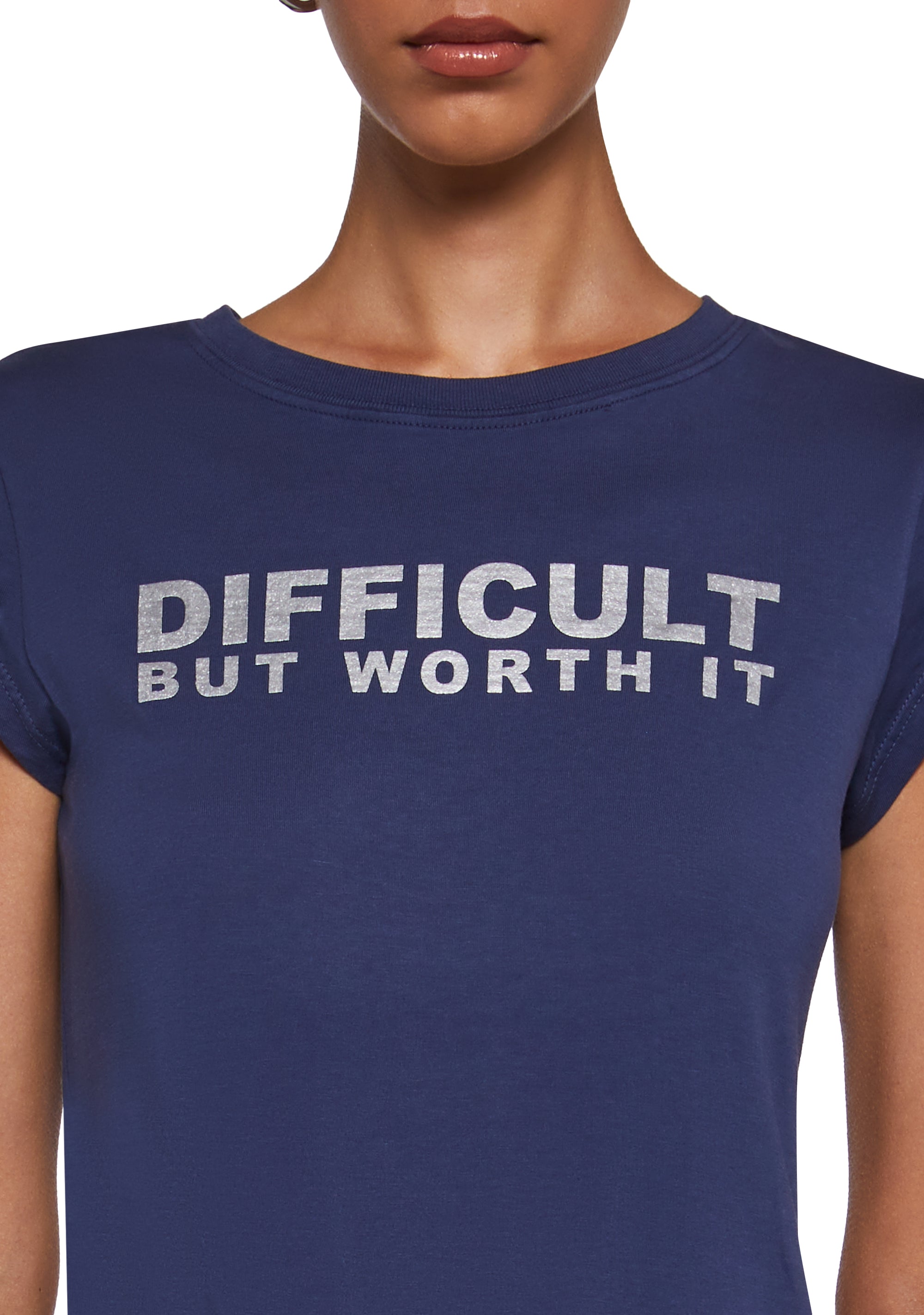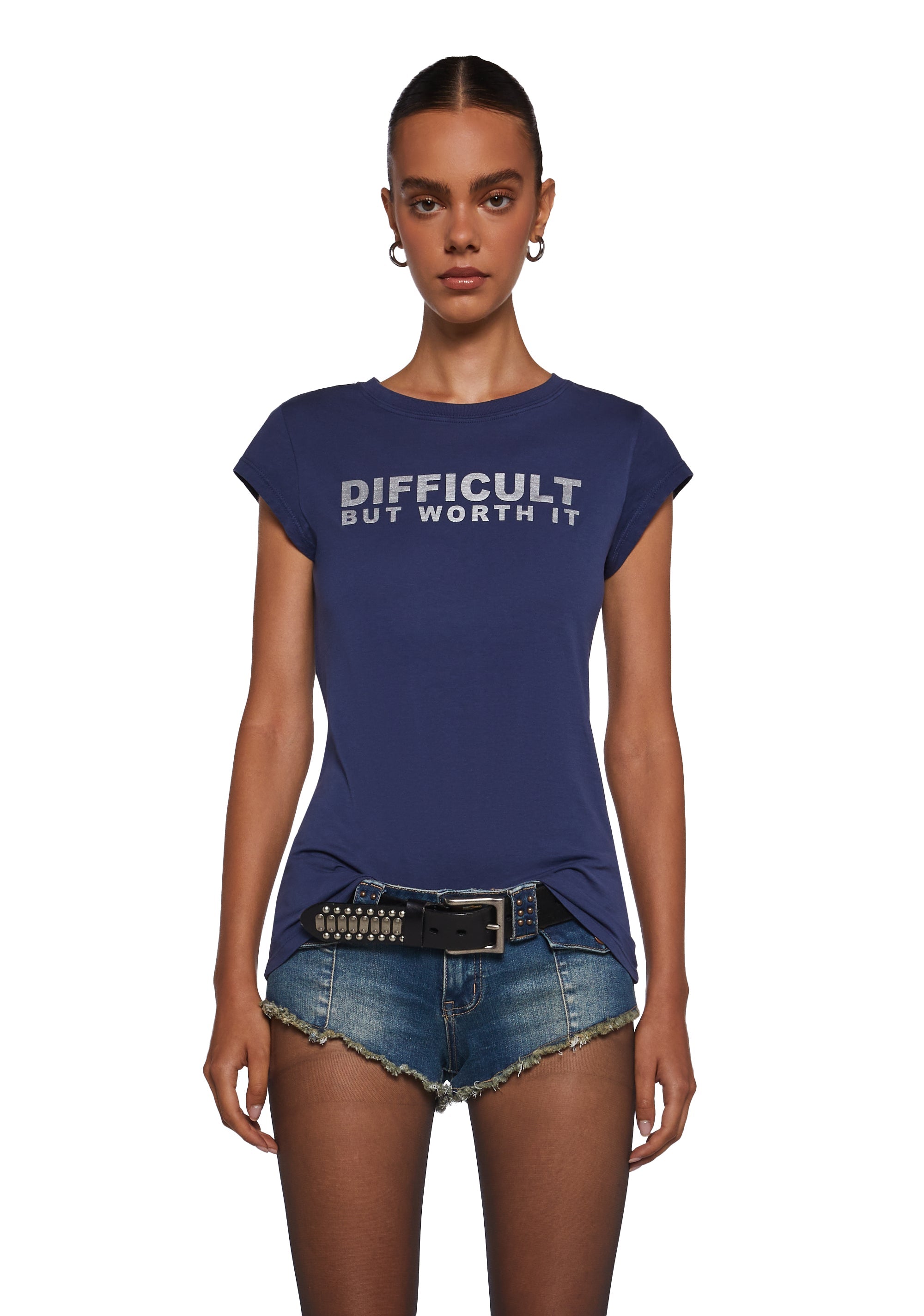 This tee has a stretchy cotton construction, a crew neckline, short sleeves, and "Difficult But Worth It" printed on the front.