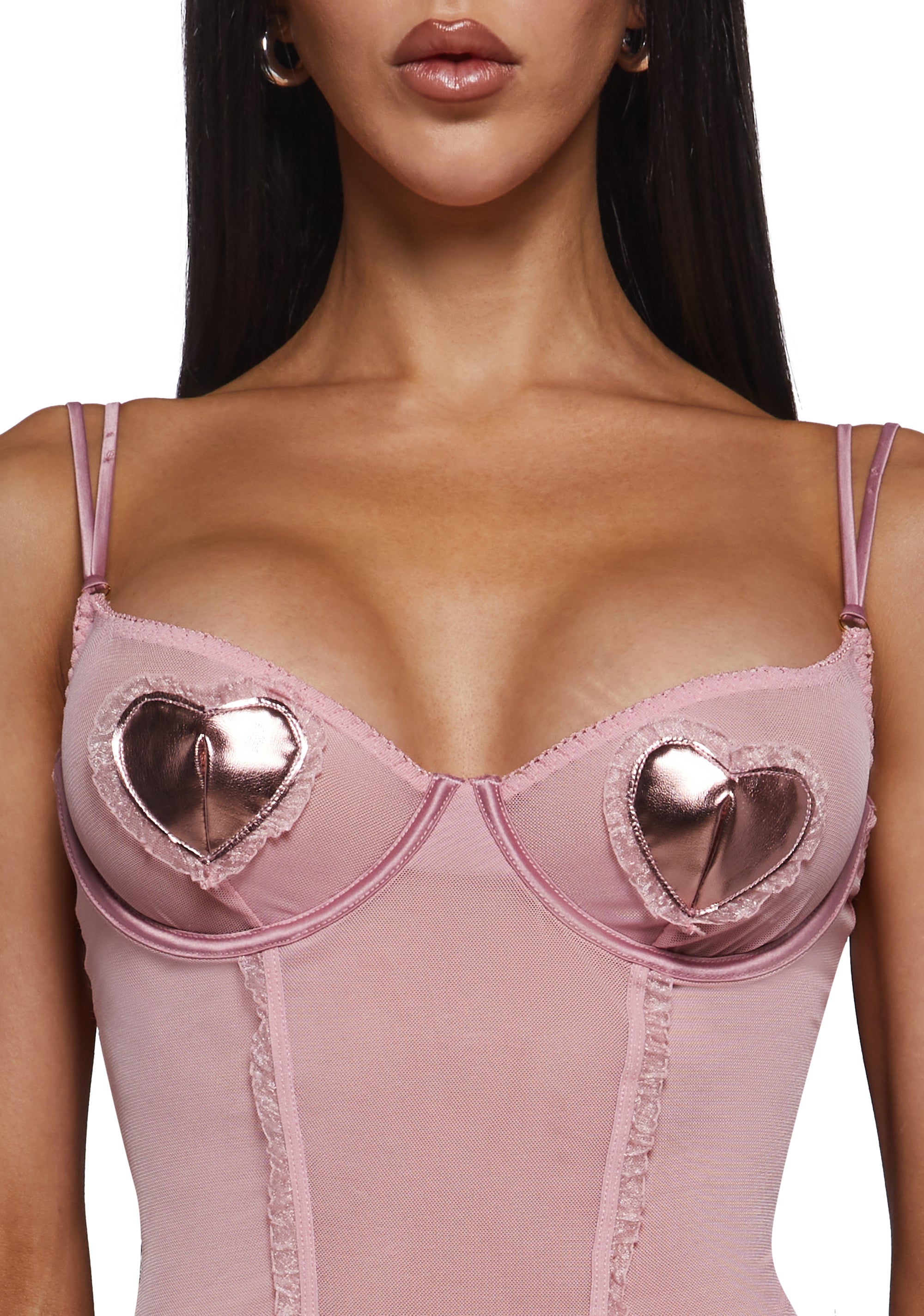 Turn up the romance with this 2-piece sheer mesh chemise set, featuring underwire cups adorned with metallic faux leather heart appliqués and delicate ruffle trim. Finished with stretch satin double spaghetti straps and paired with a matching thong panty for a bold, irresistible look.