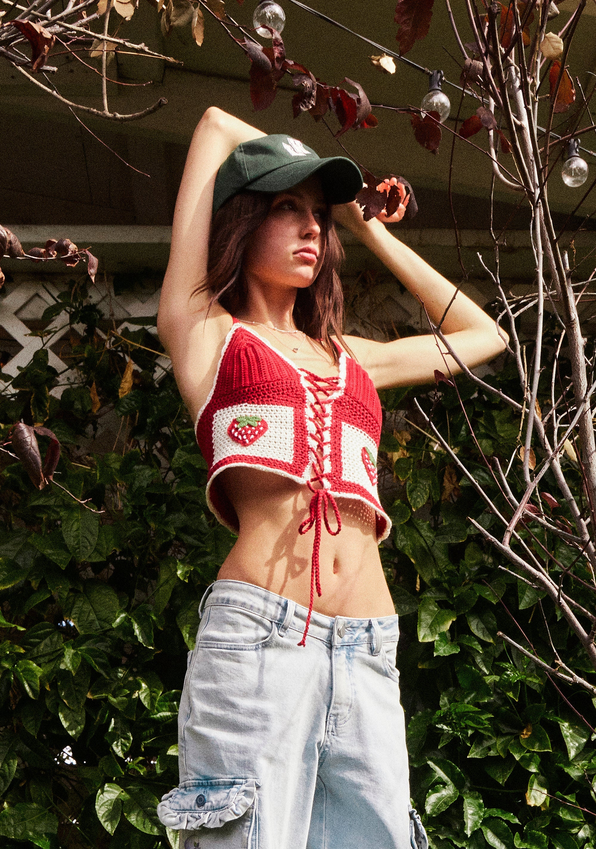 This tank top has a crochet construction, strawberry designs on the front, adjustable shoulder straps, a cropped fit, and front adjustable lace-up closures.