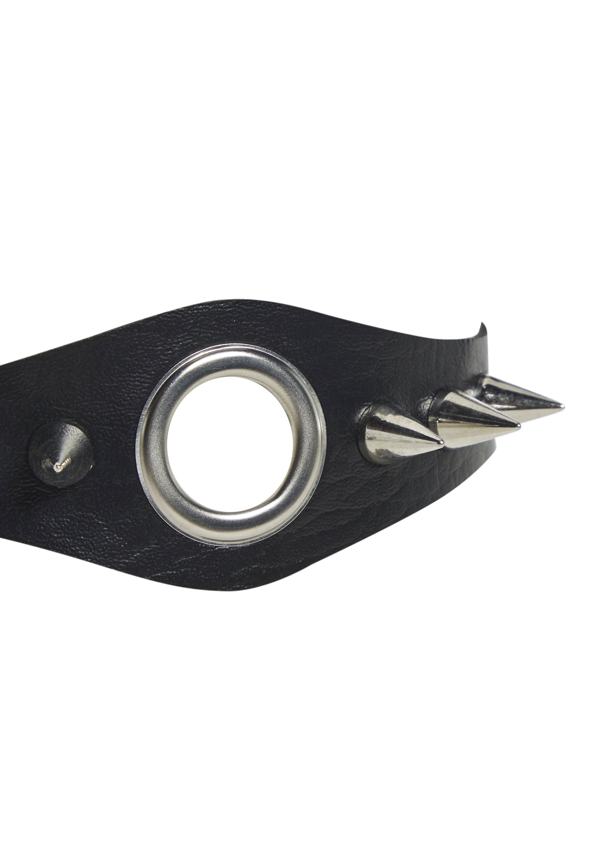 This choker has a vegan leather construction, O-ring hardware and spiked details.