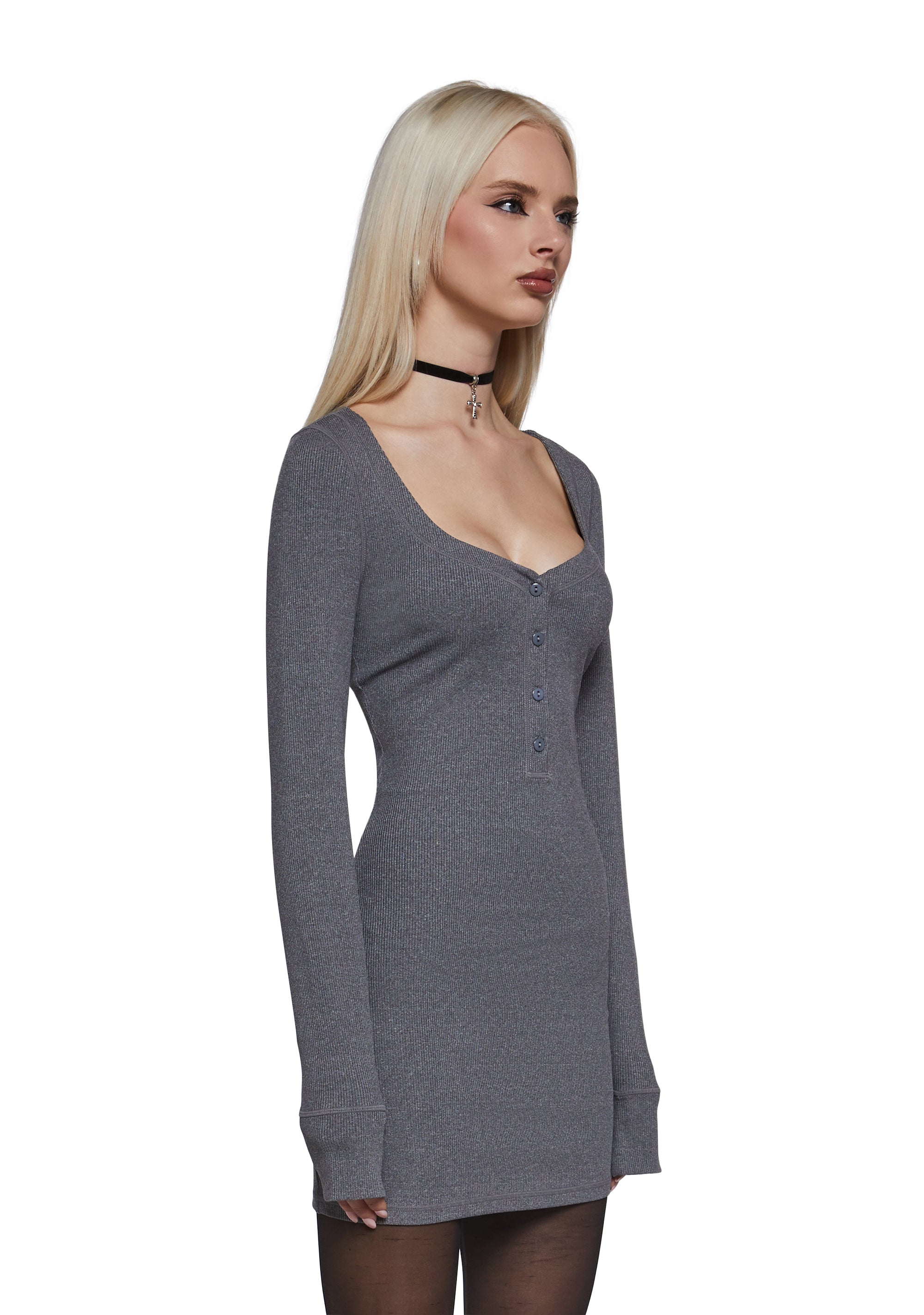 This henley dress has a ribbed construction, a v-neckline, long sleeves, contrast colored stitching, and front button closures.