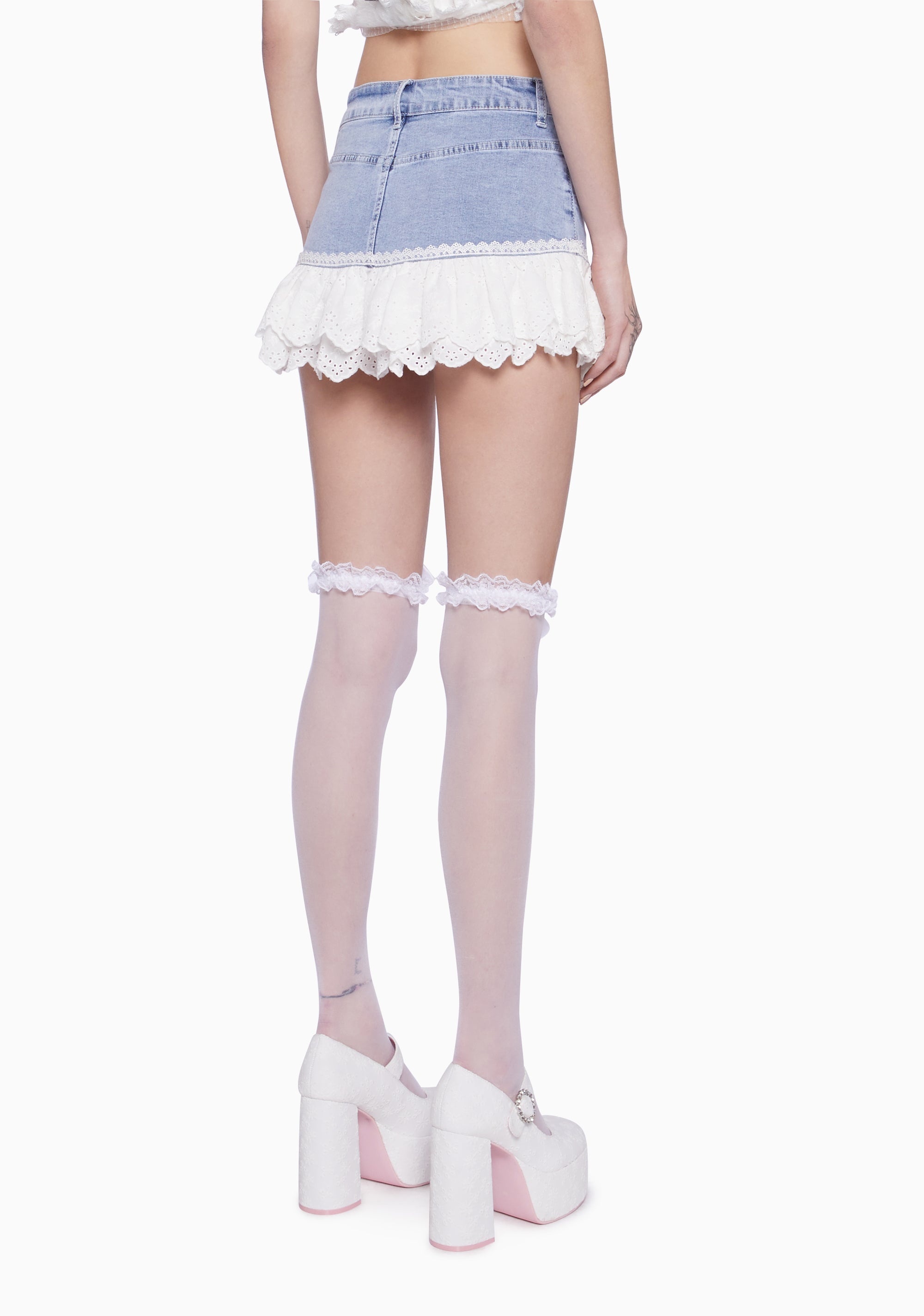 to wander through your outdoor adventures. This mini skirt has a denim construction, eyelet tiers, front pockets, a front button and zipper closure, and belt loops.