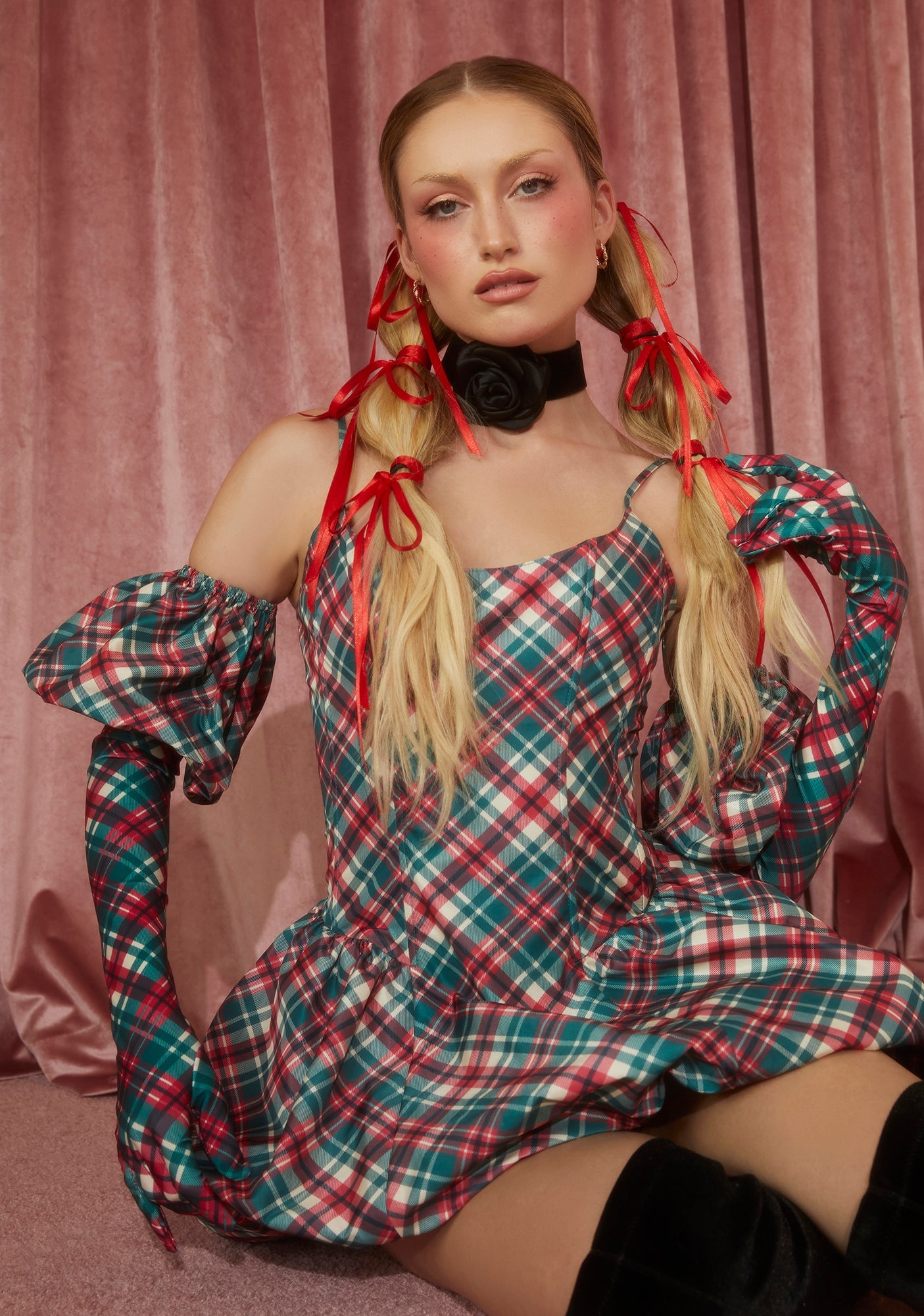 cuz you’re ready to win best dressed.This mini dress has an all over plaid pattern, a taffeta construction,structured boning, adjustable shoulder straps, a puffy skirt, a back lace up design, a side zipper closure, and comes with matching gloves.