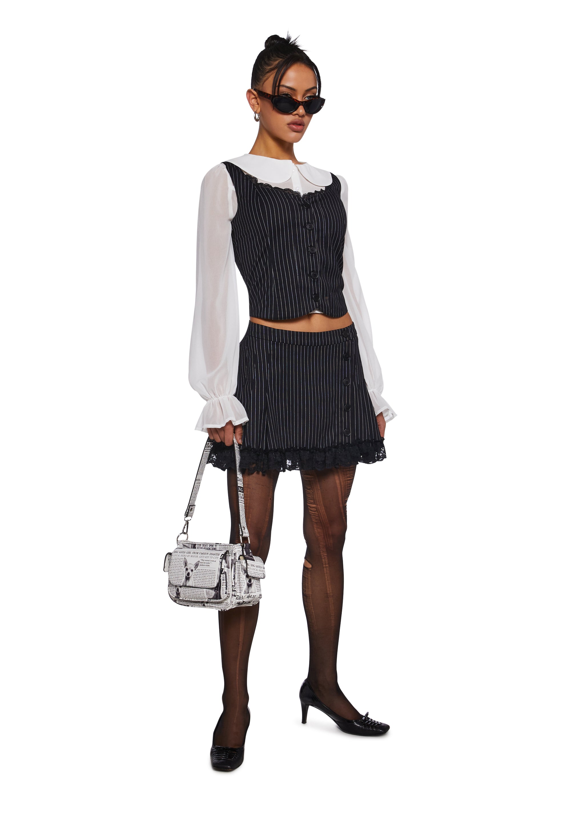 This mini skirt has a twill construction with a pinstripe design, ruffled lace trim, and front button closures.