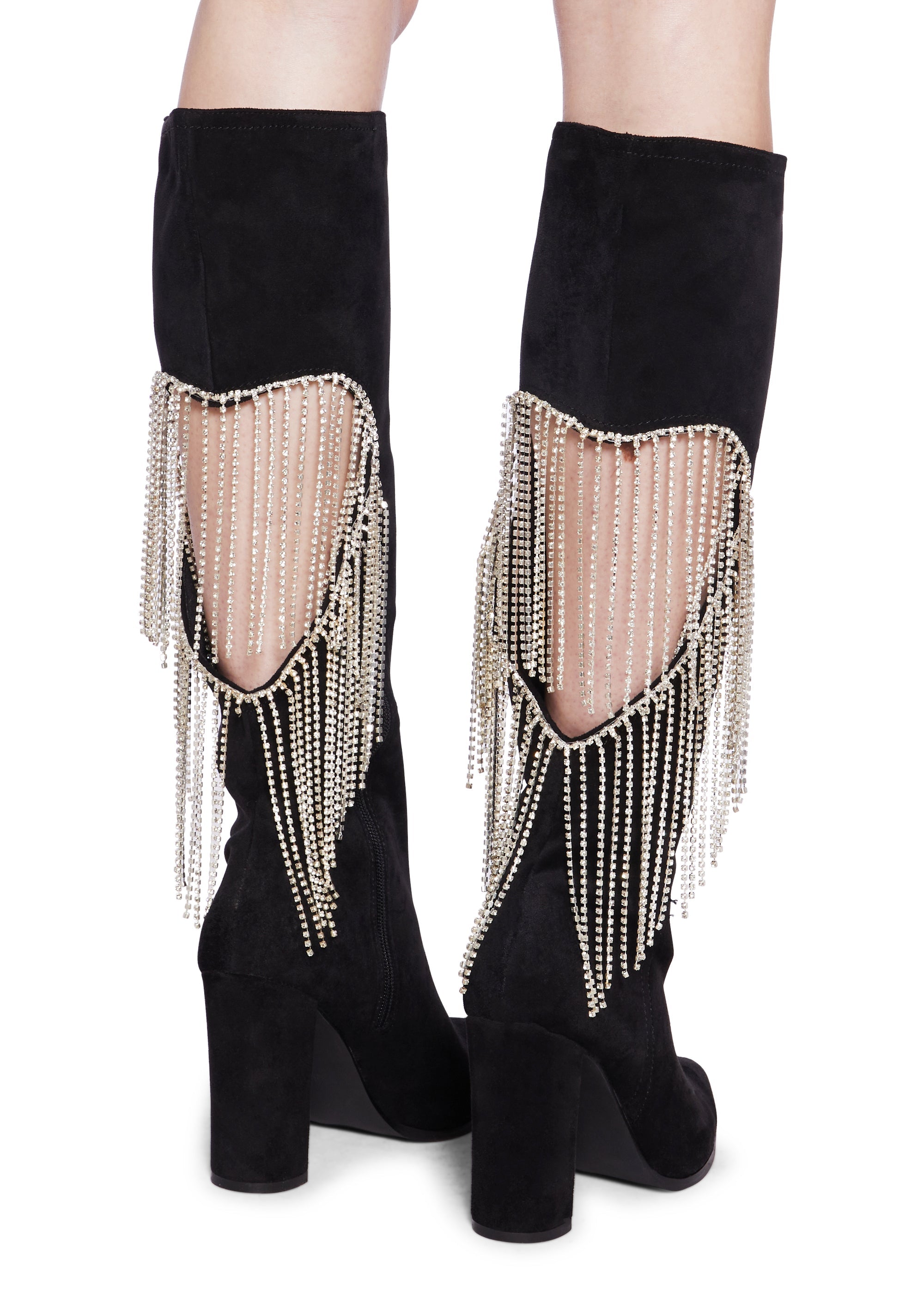 cuz let's party. These boots have a faux suede construction,a cut out heart design with rhinestone fringe on the back, a pointed toe design, block heels, and side zipper closures.