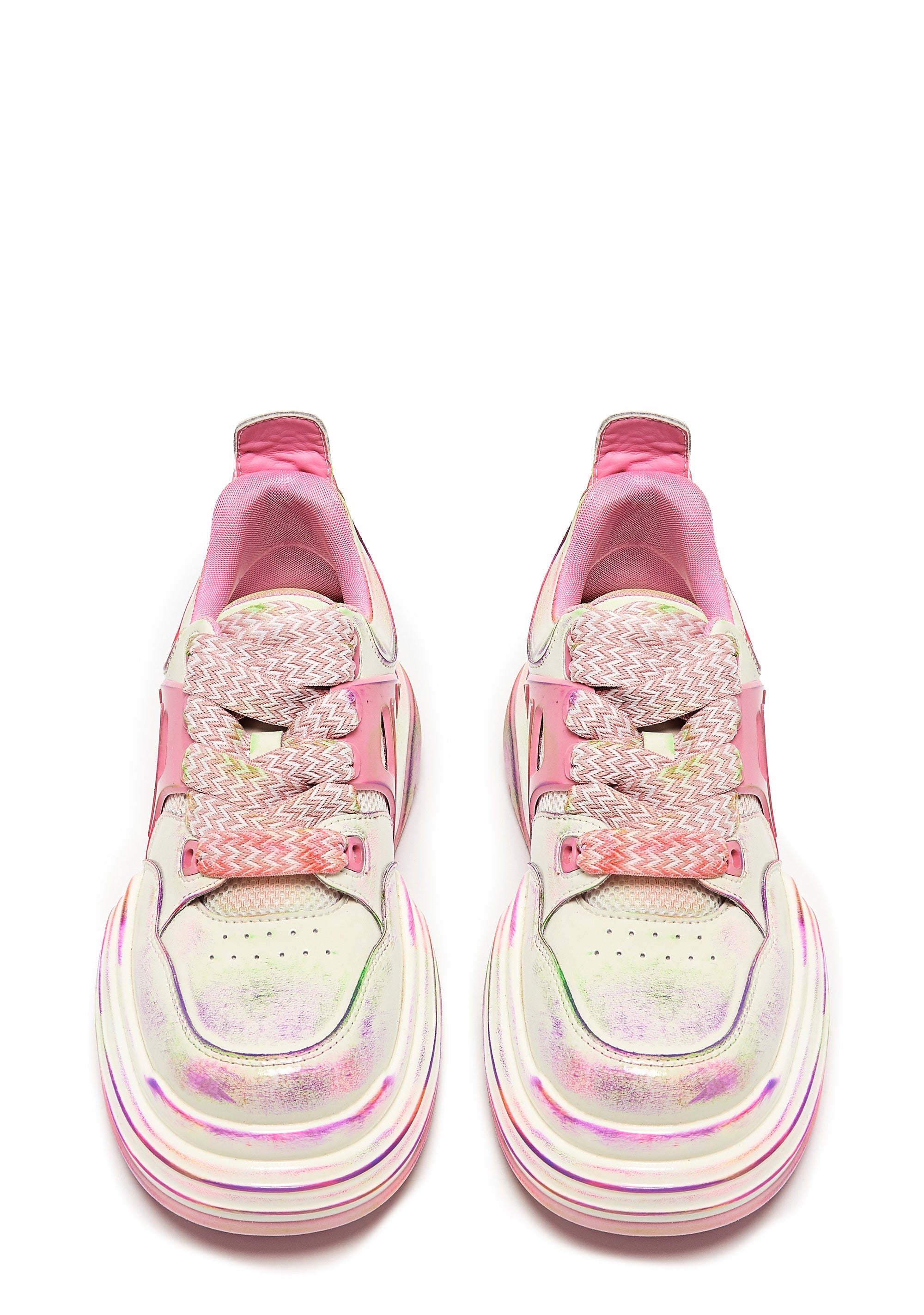 These sneakers have a vegan leather construction, spray painted pastel uppers,a glossy finish, rainbow washed platform soles, padded collar and tongue, and extra wide chevron printed lace up closures.
