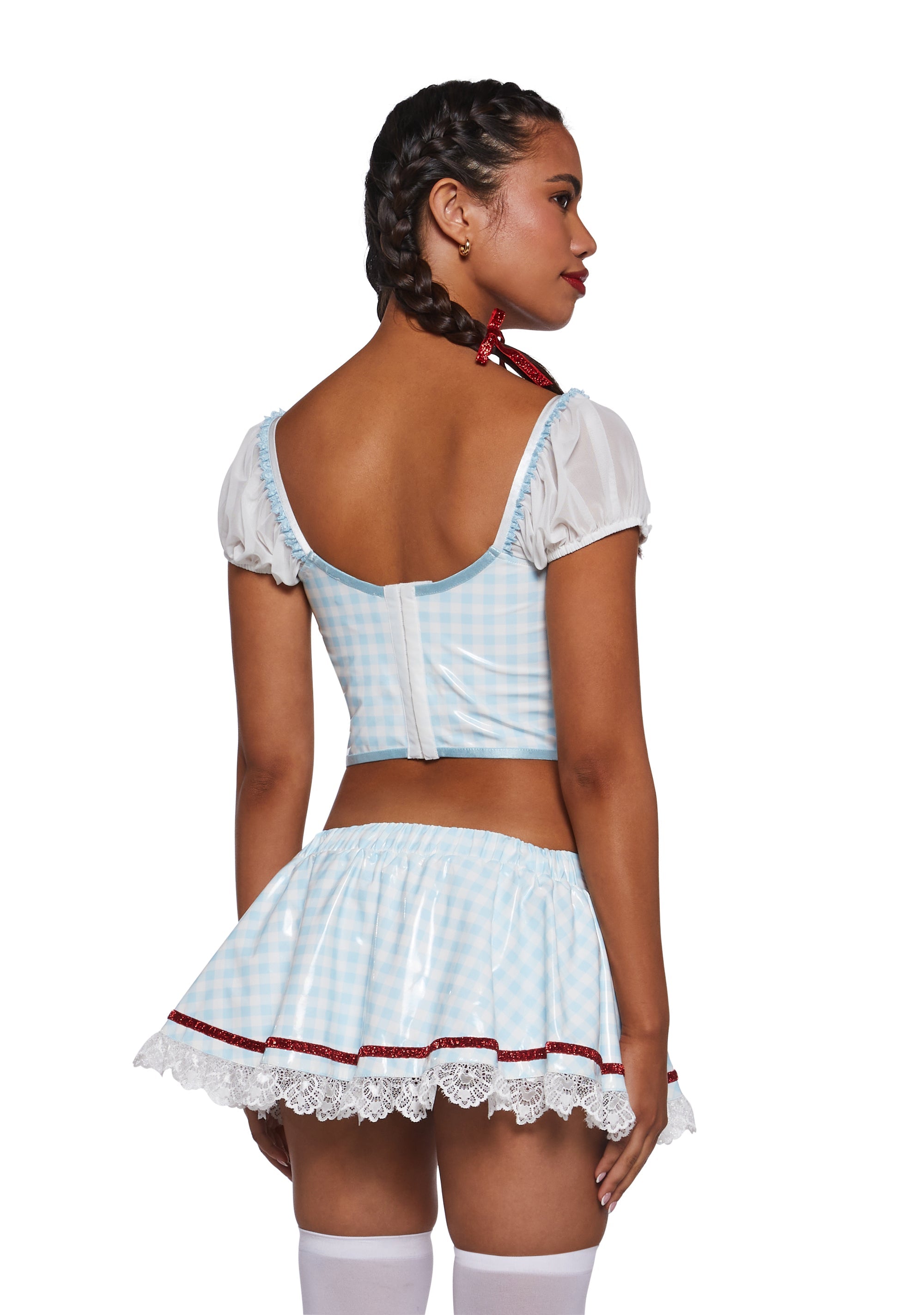 This Dorothy inspired costume is a flirty and fun outfit, perfect for Halloween, cosplay, or themed parties. It features a blue gingham crop top with puff sleeves, a white bust, and red lace-up ribbon detail for a playful touch. The matching mini skirt has a classic gingham print, trimmed with red ribbon and white lace for a sweet yet sexy look. Paired with pigtail braids and stockings, this Dorothy costume is a cute and eye-catching choice for anyone wanting a modern twist on the classic fairytale character.
