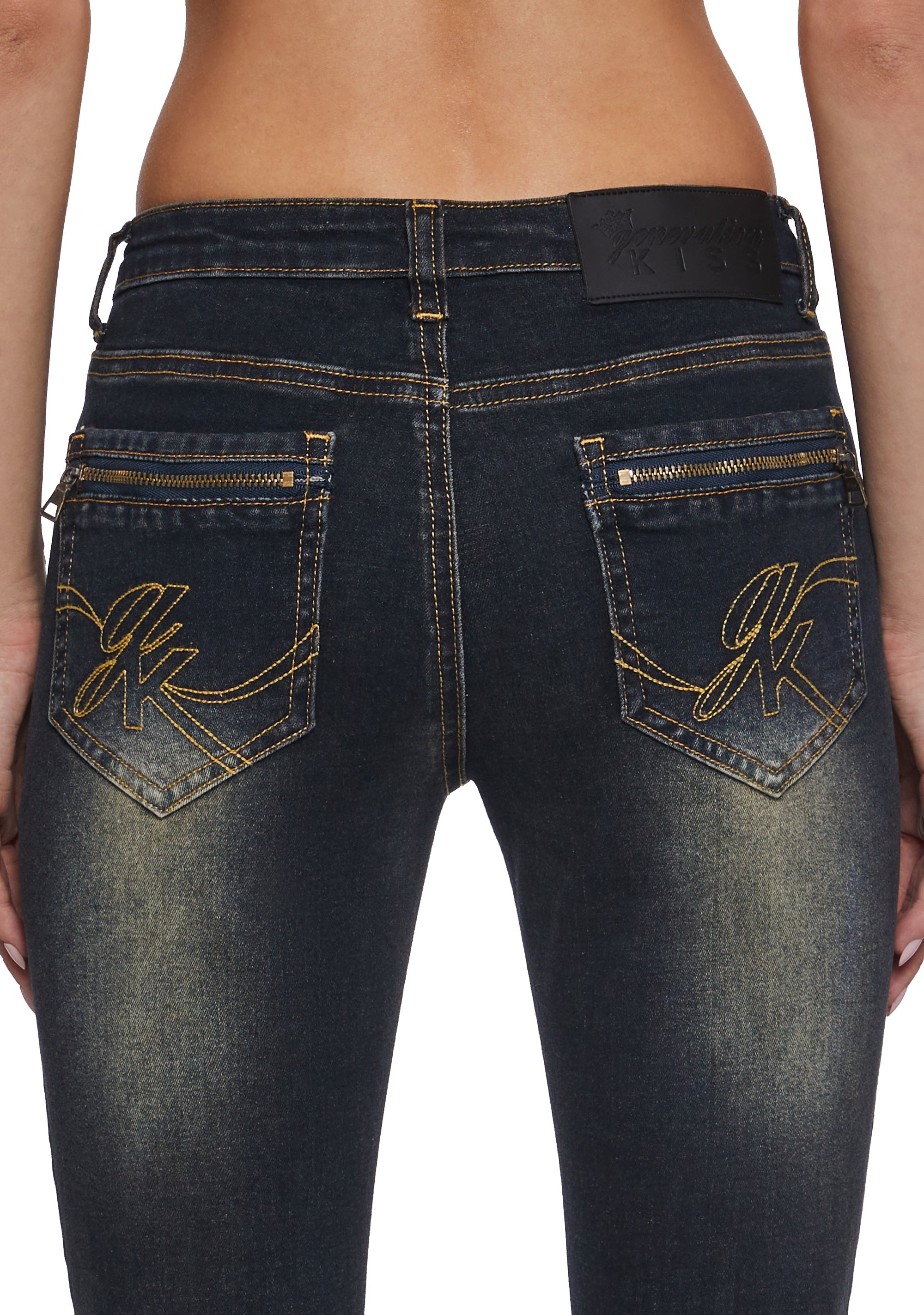 These dark-wash jeans are designed with a classic five-pocket construction and a sleek, body-skimming fit for an effortlessly flattering look. Finished with subtle fading, they offer everyday versatility with a polished edge.