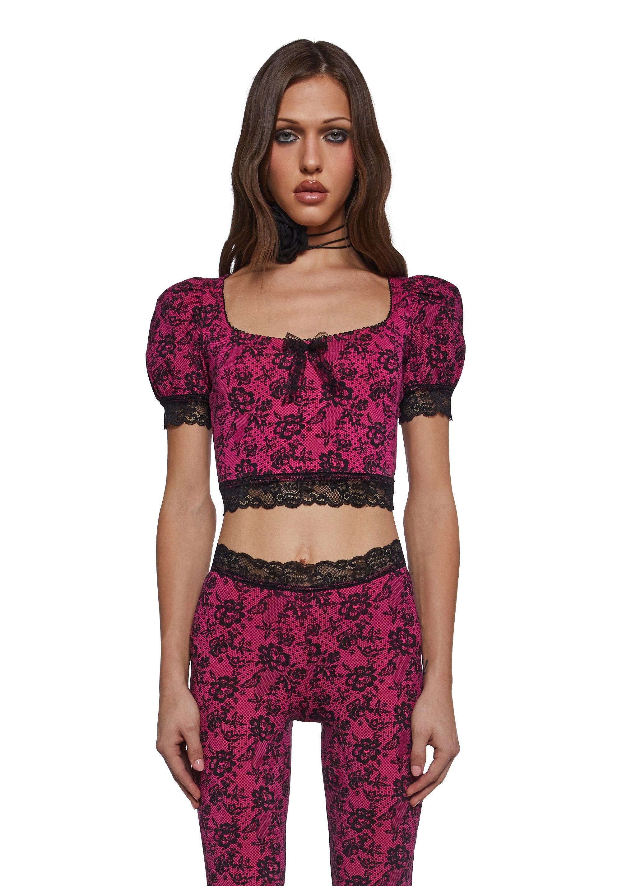 This top has an all over floral lace print, a contrast lace scallop hem, puffy sleeves, a cropped fit, and a decorative lace bow on the front.