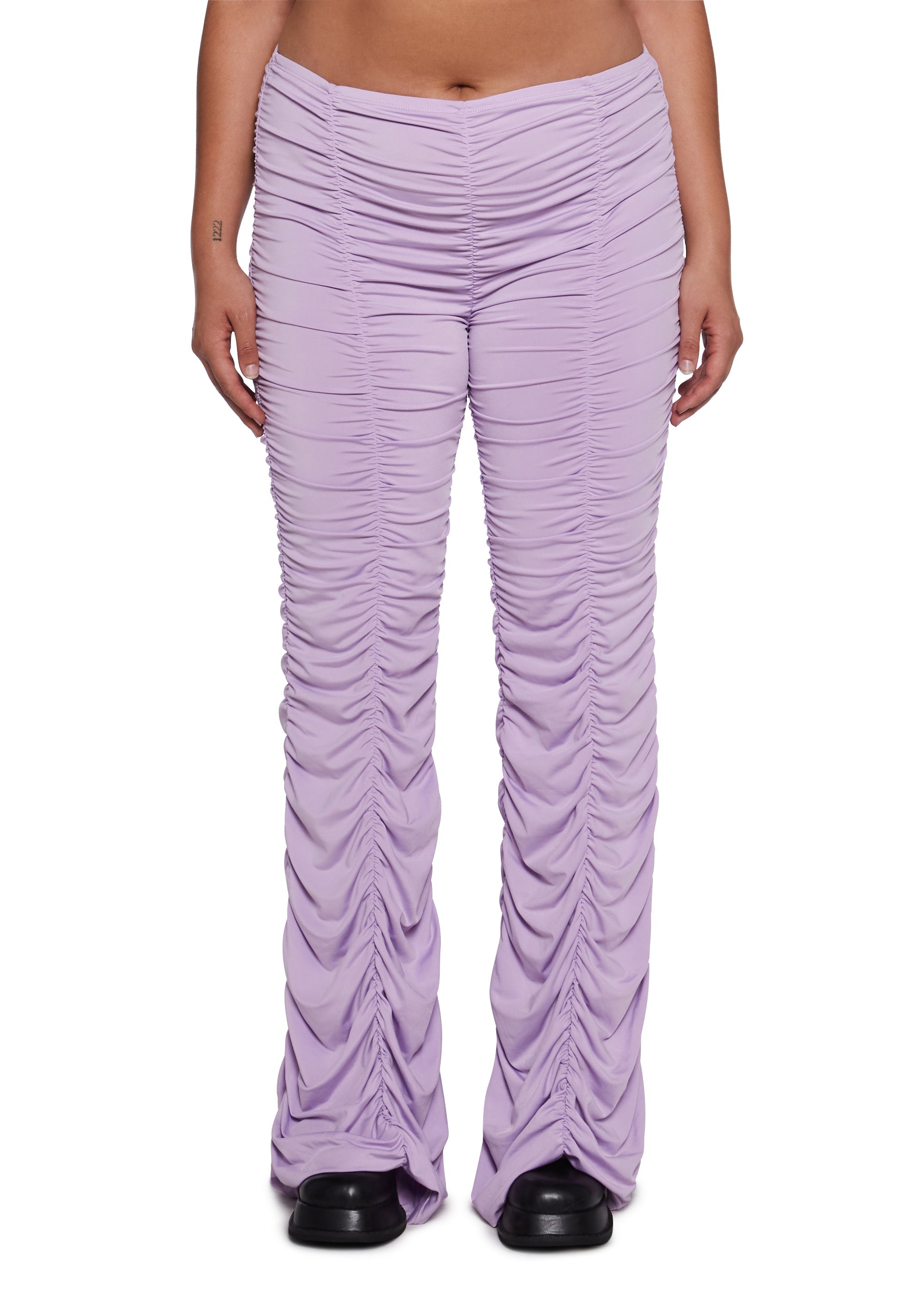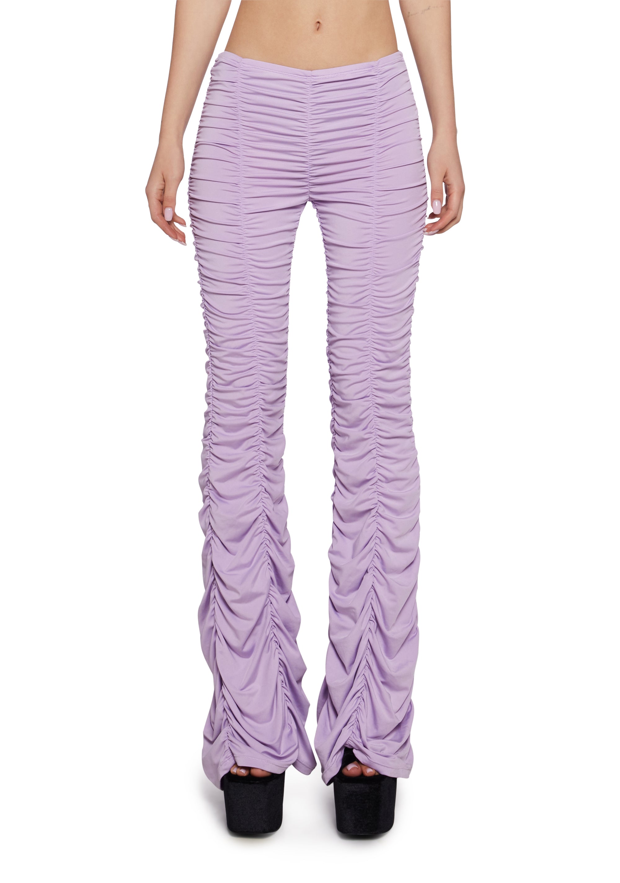 cuz show up and show out. These pants have stretchy ruched construction, a flare leg, and a slip on fit.