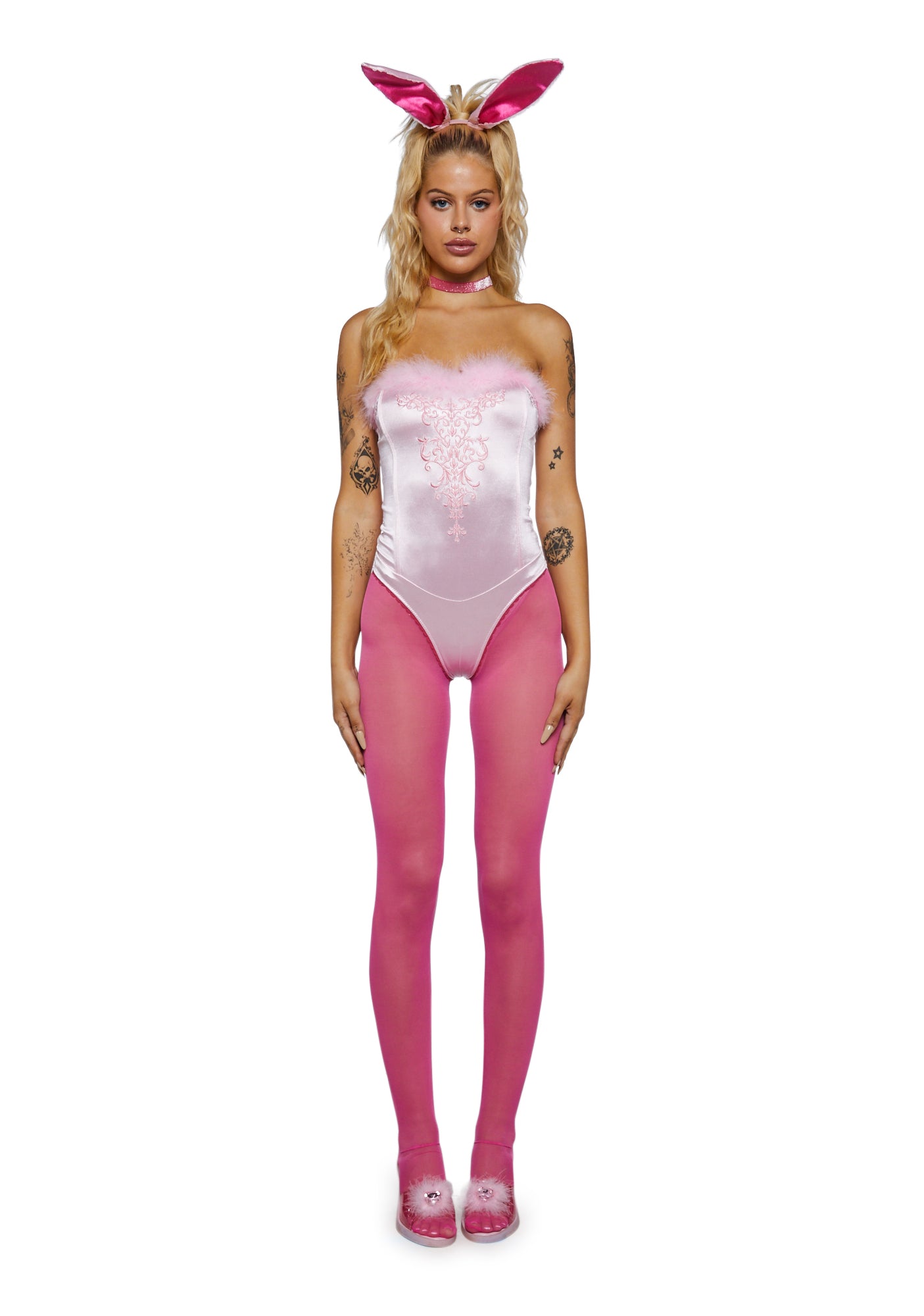 cuz you feel comfortable using legal jargon in everyday life. This law school comedy movie costume comes with bunny ears, a choker, pink tights, and a fluffy trim bodysuit with a tail on the back.