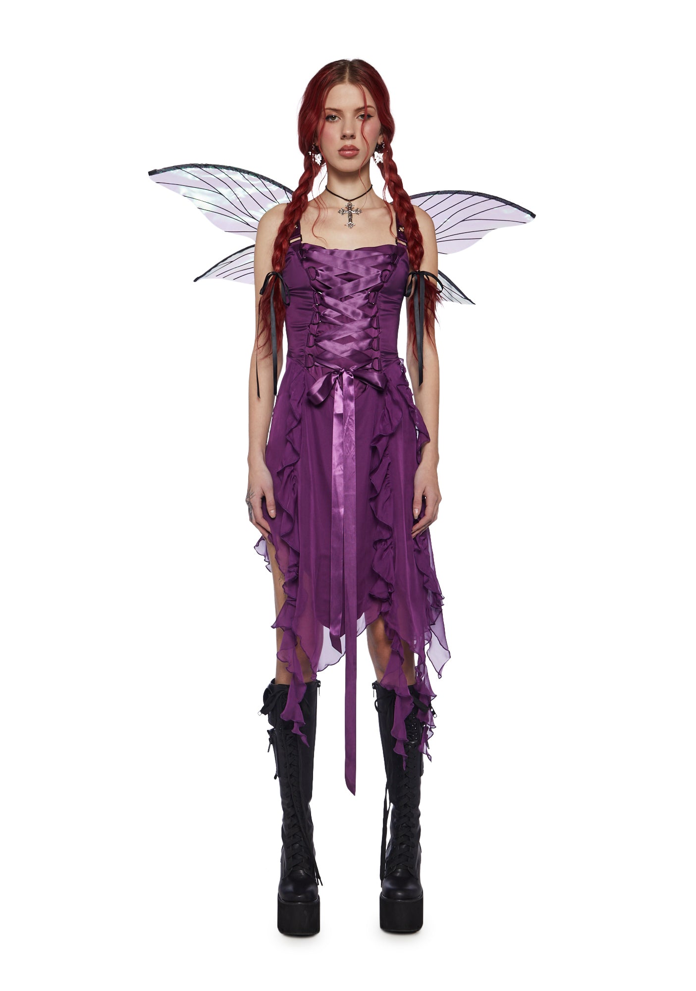 but don't spoil the ending. This midi dress has a stretchy satin and chiffon construction, lace-up ribbon ties with D-ring hardware, adjustable grommet shoulder straps, a side zip closure, and an asymmetrical ruffled hem.