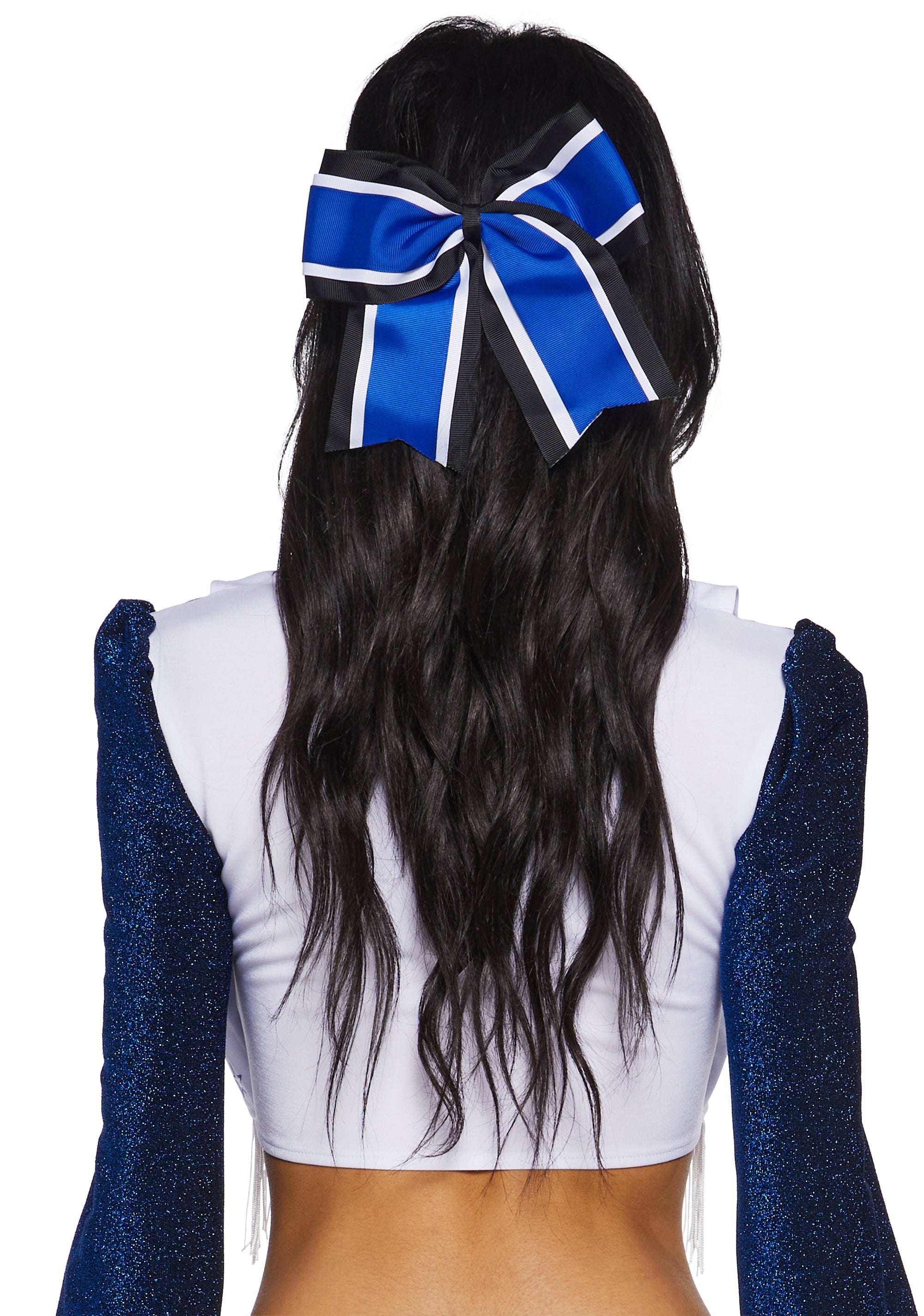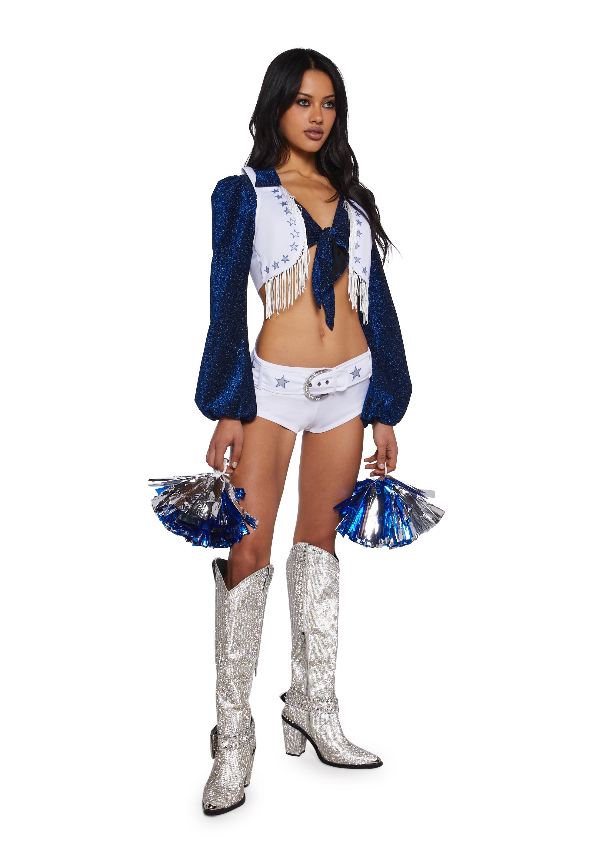 This costume set includes a stretchy metallic knit collared crop top with long sleeves, elastic cuffs, a knit fringed vest with a star print design, and a pair of stretchy knit shorts with a front belt design with a rhinestone buckle. Includes tinsel cheerleader pom-poms and a striped ribbon hair clip.