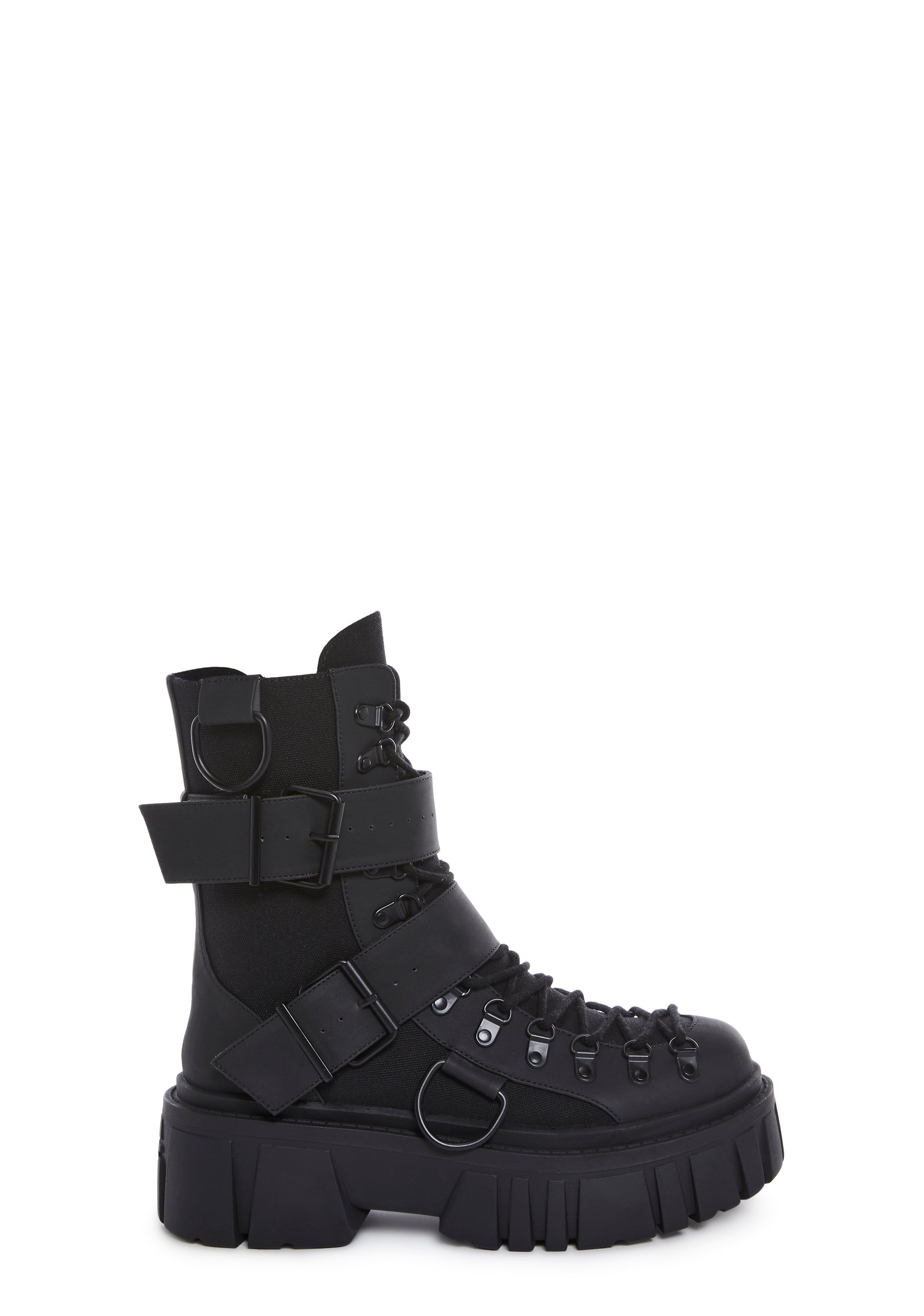 cuz once ya do a double-cross, ya gotta be ready to fight! Get gnarly in these chunky combat boots that have a canvas twill and vegan leather construction, adjustable lace-ups, D-ring hardware, double buckled straps, and side zip closures.