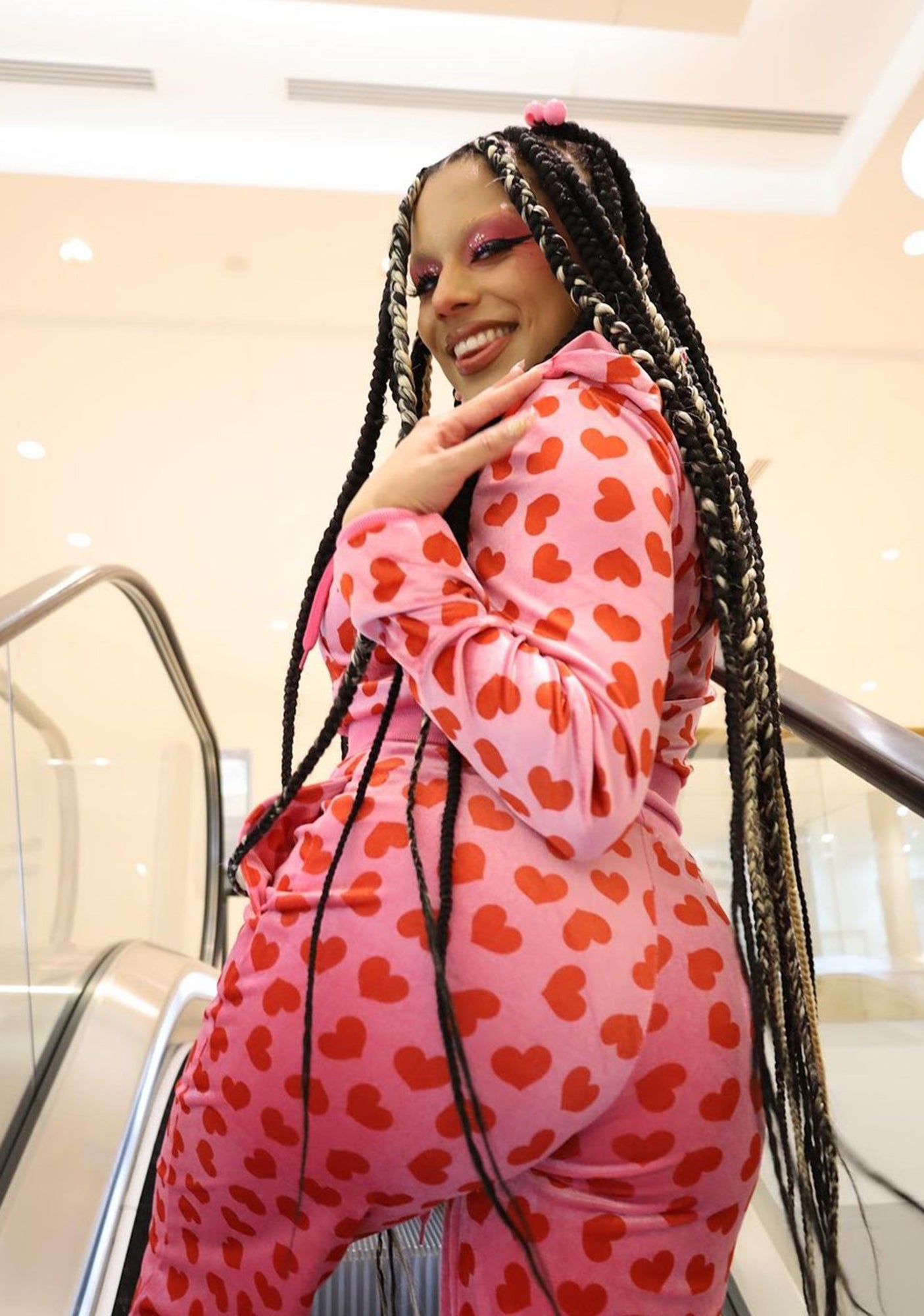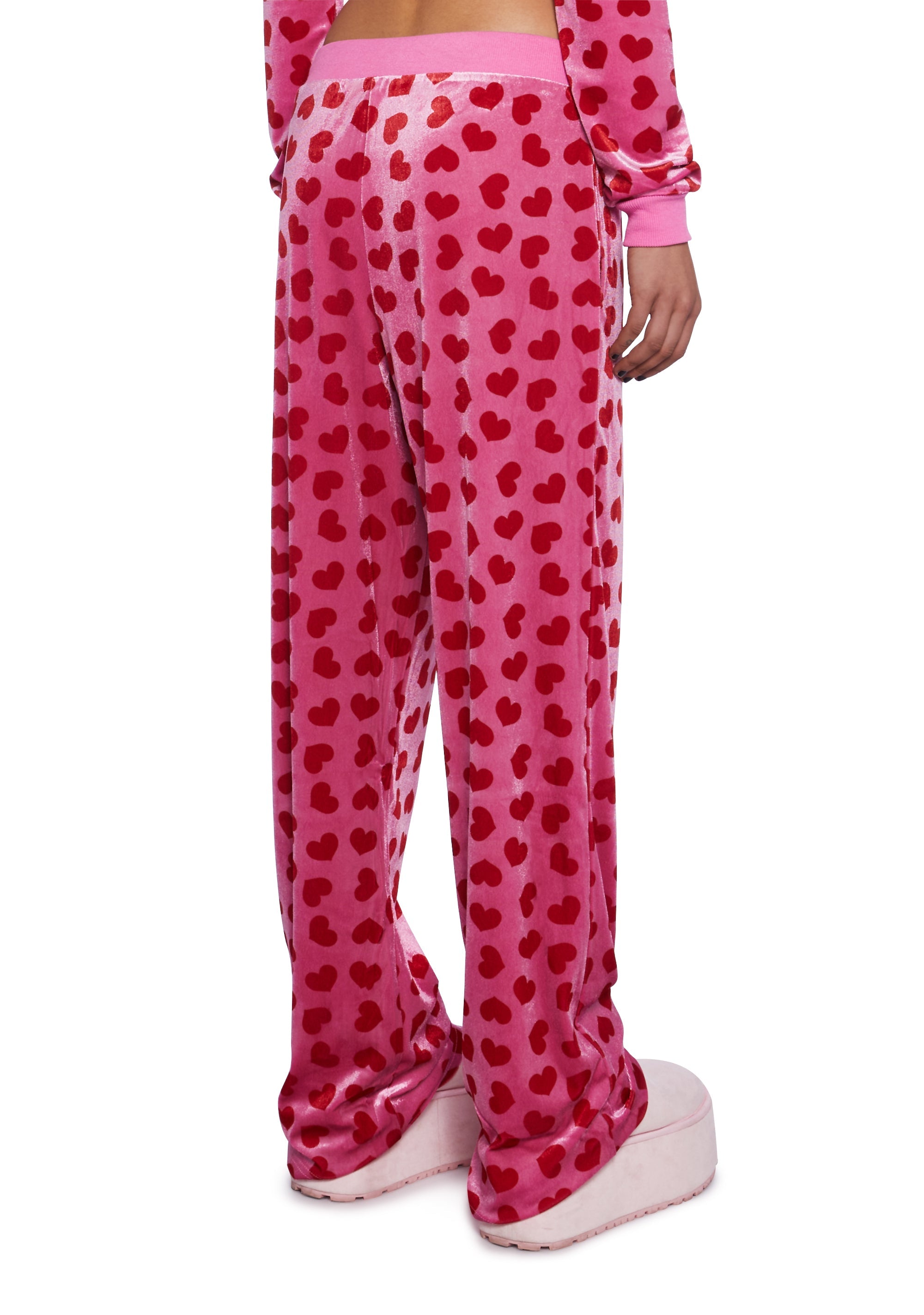 cuz all the men are under Jennifer's spell. Make the ultimate sacrifice in these velour sweatpants that have a heart print, flare bottom and drawstring waistband.