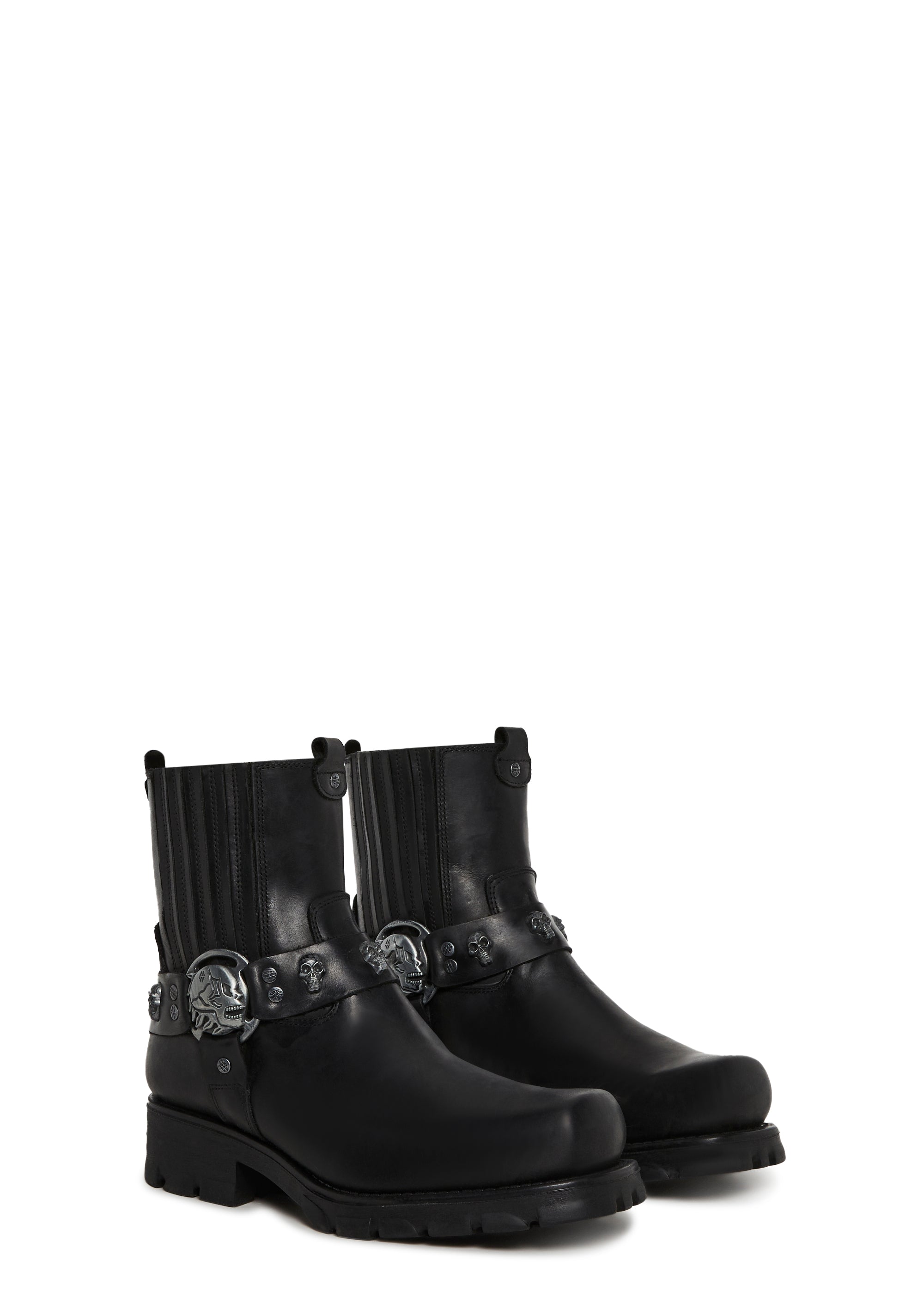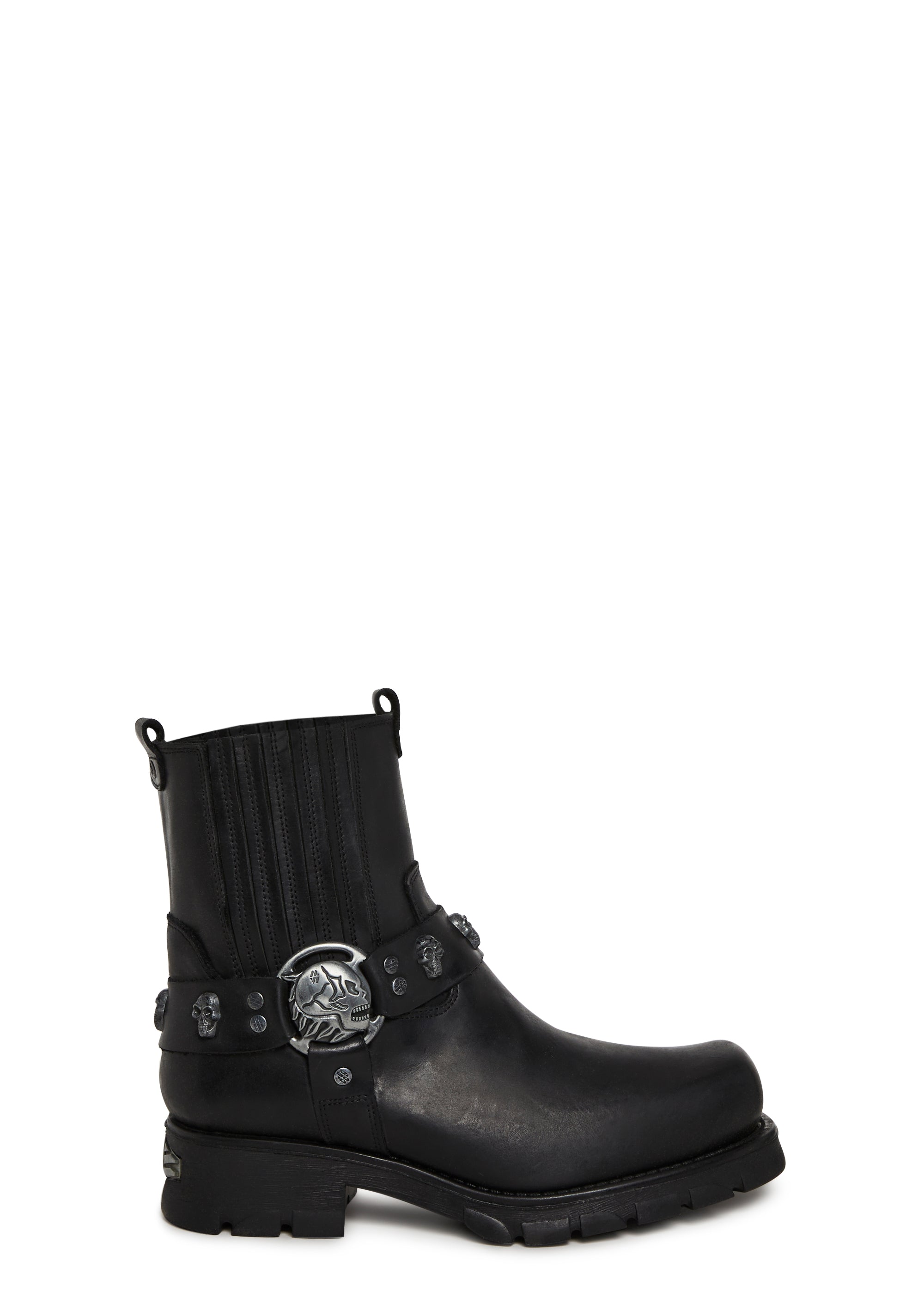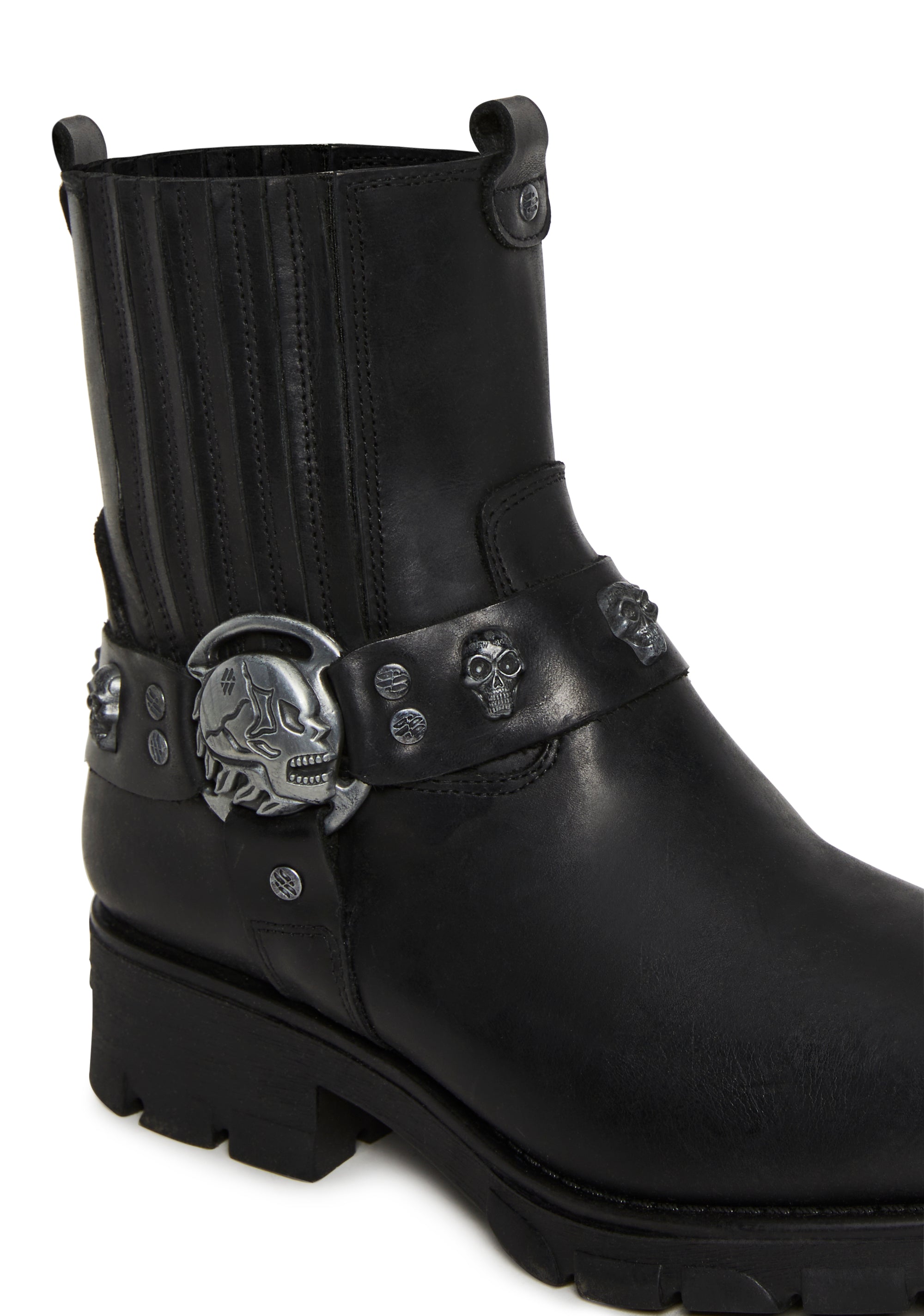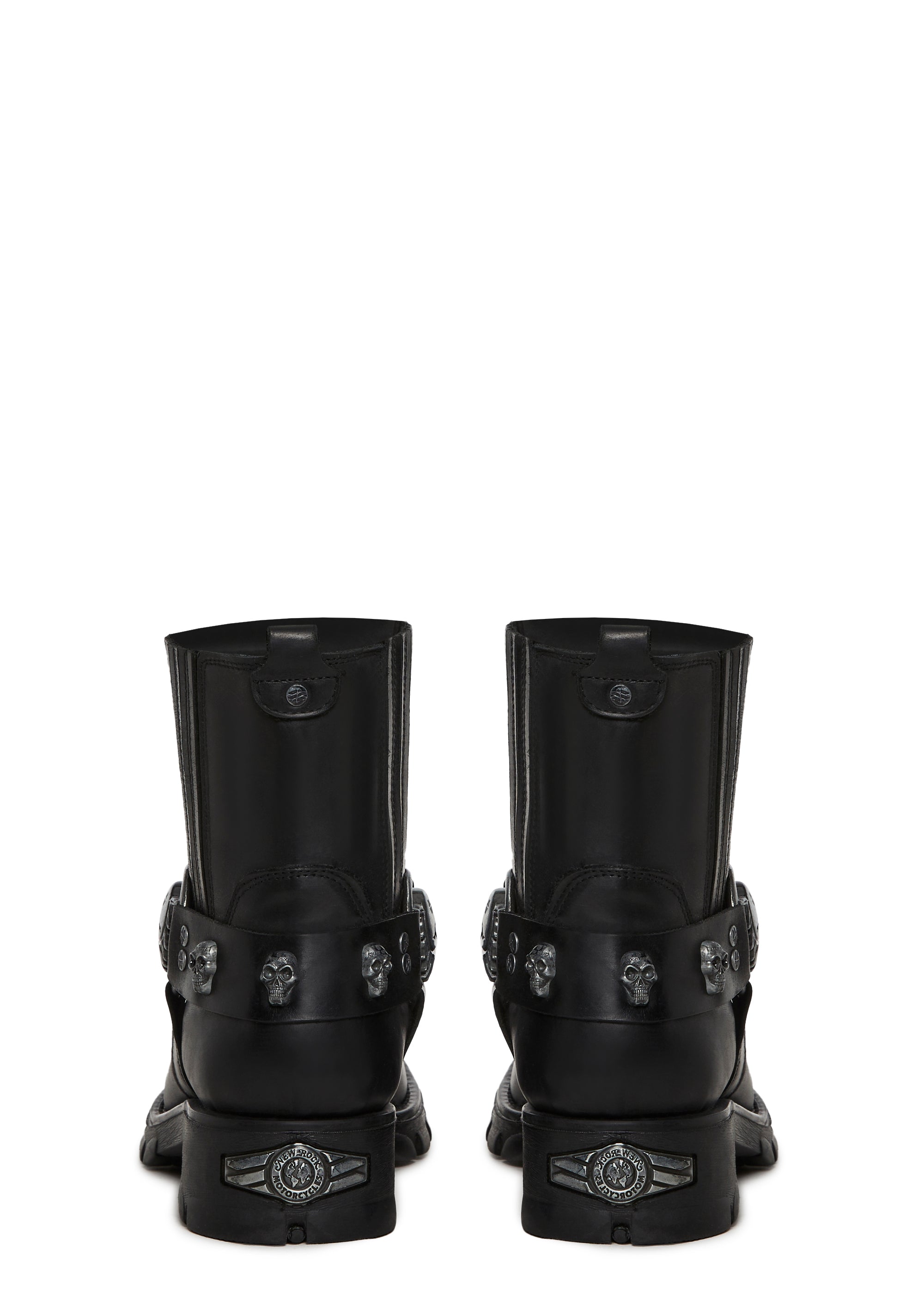 These boots have a genuine leather construction, elastic side panels, O-ring hardware, brand logo on the back heel,skull head charm details, and a metal skull charm on the sides.