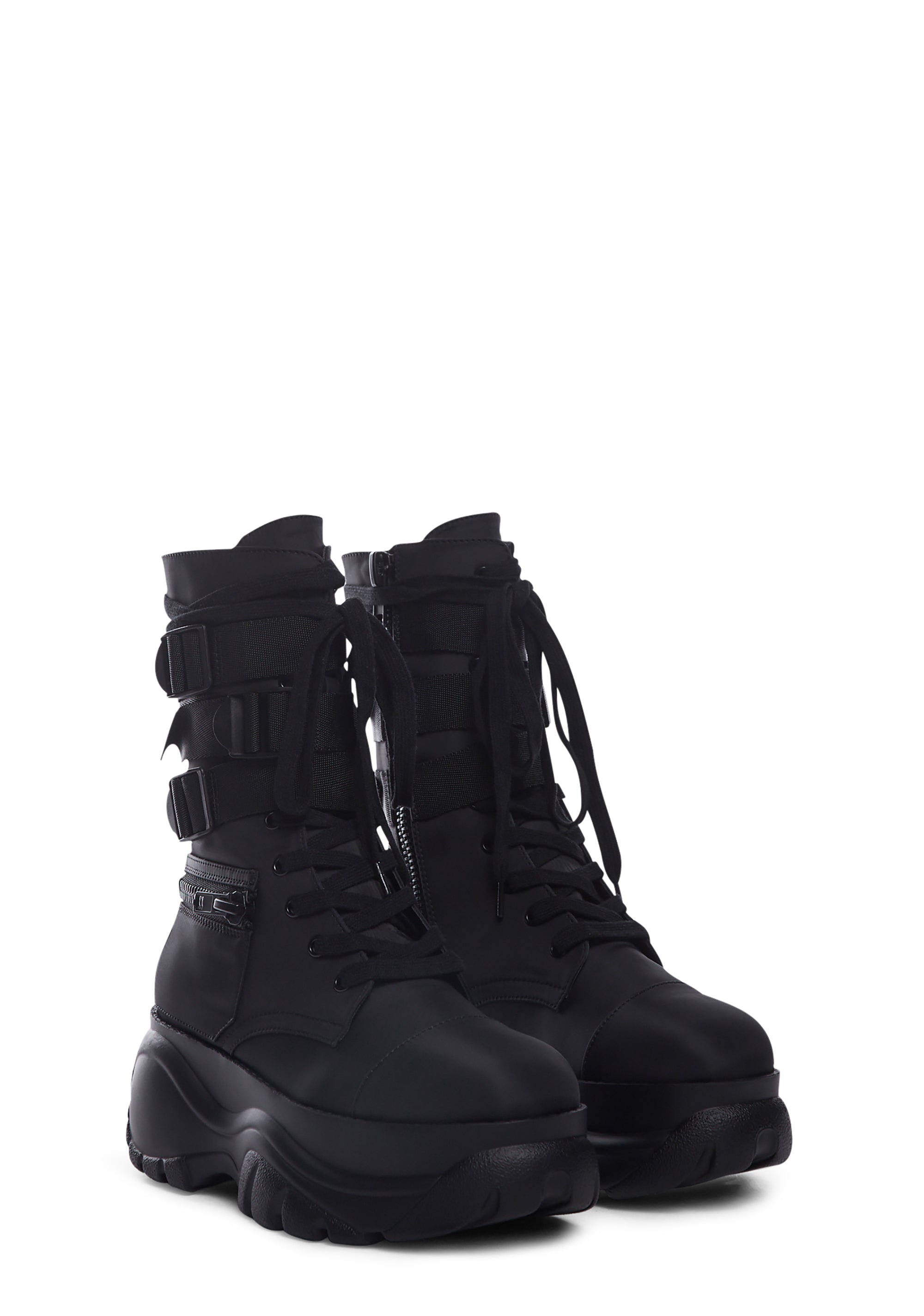 cuz you don't fumble the bag! These chunky platform combat boots have zipper pocket details, adjustable lace-ups, triple buckled straps, and side zip closures.