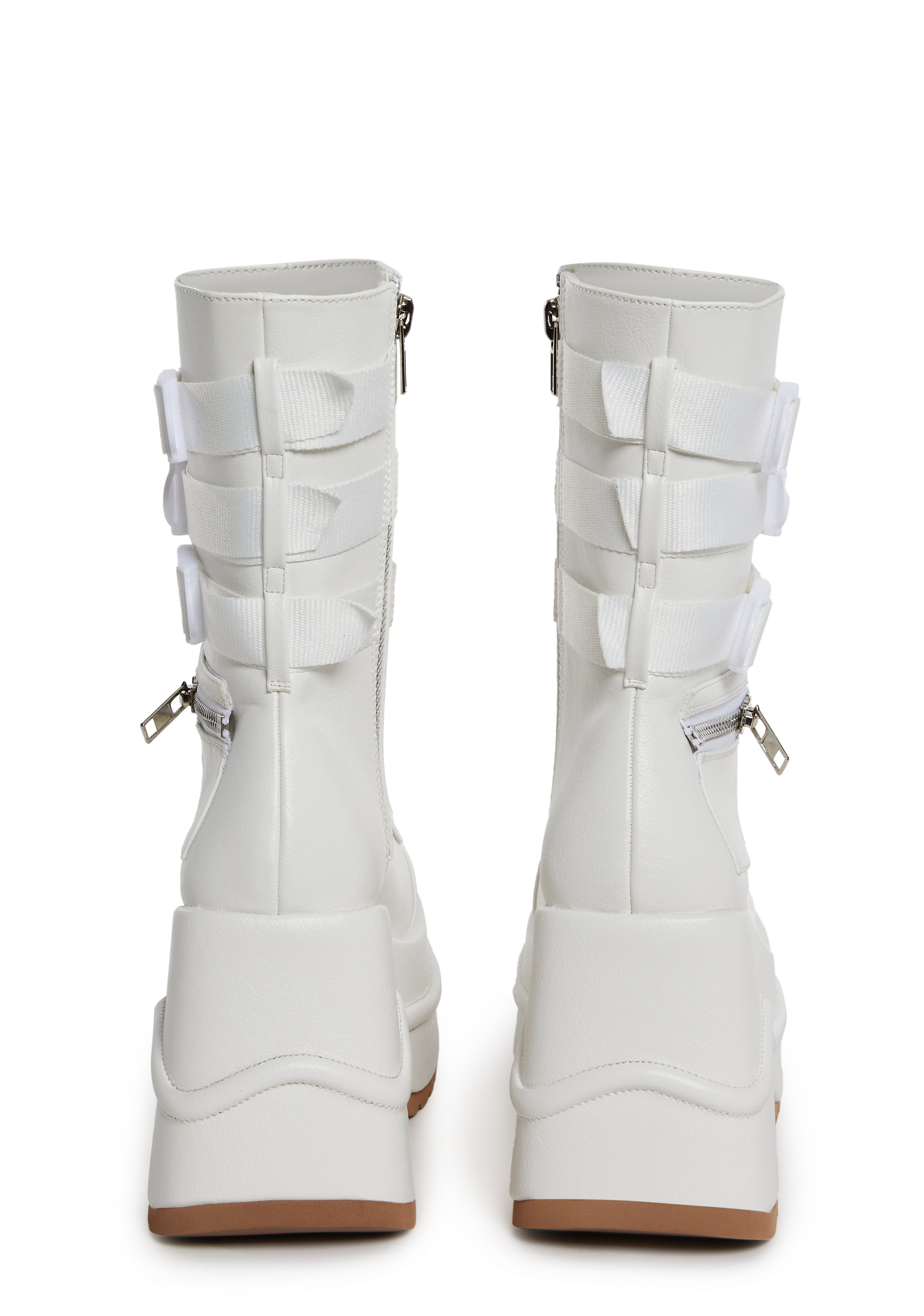 These chunky platform wedge boots have a matte vegan leather construction, zipper pocket details, adjustable lace-ups, triple buckled straps, and side zip closures.