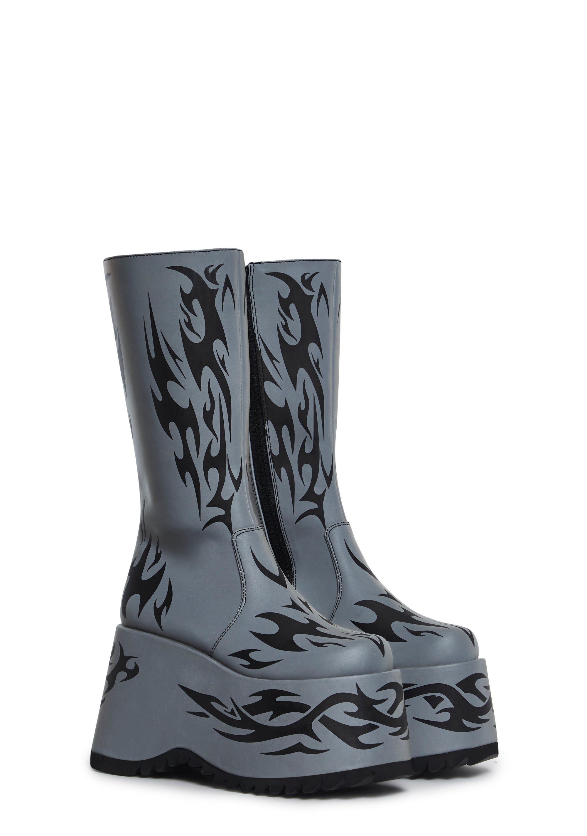 Attack at night in these reflective knee high platform boots that have rubber treaded soles, side zip closures, and a tattoo print all over.