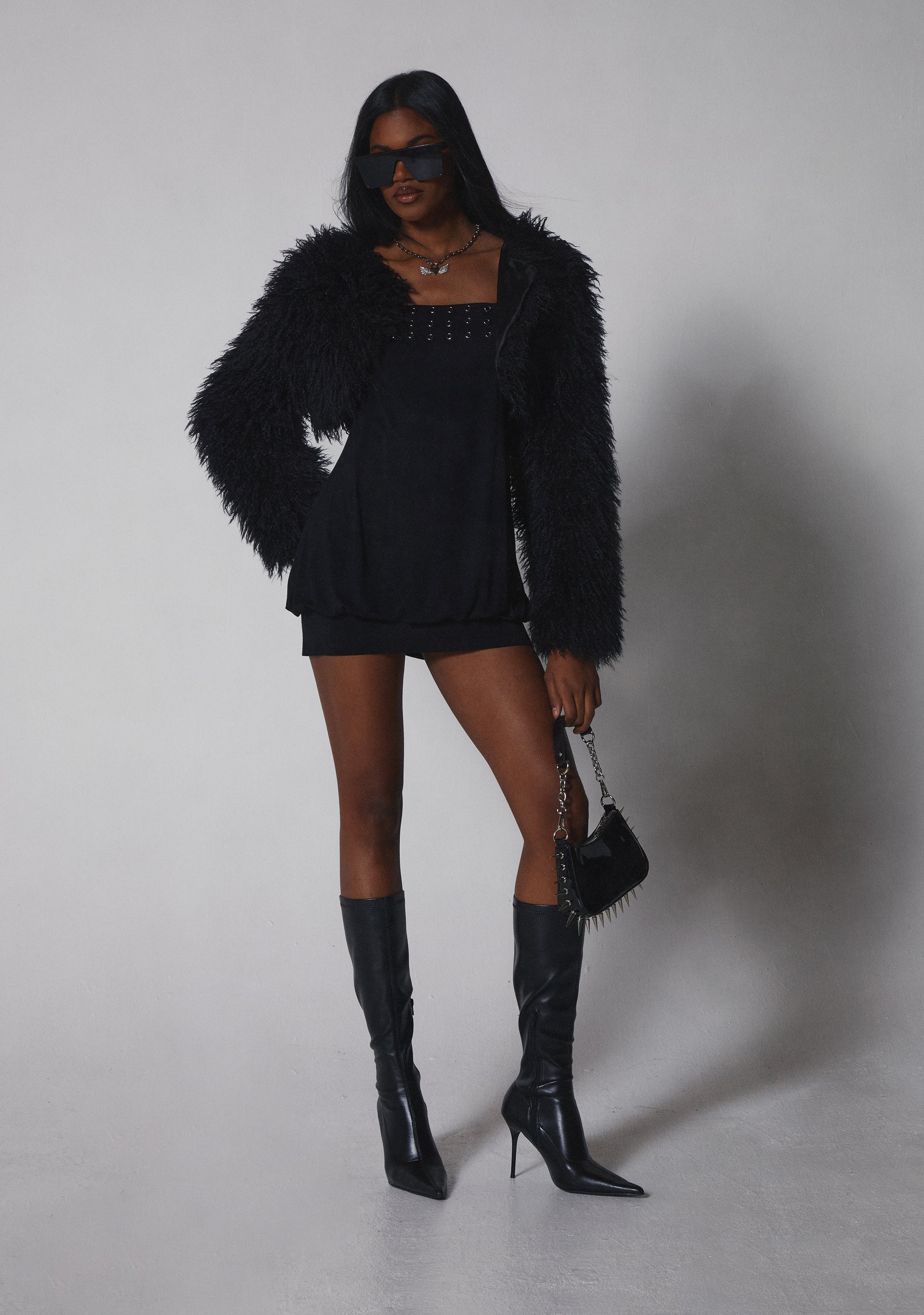 This shrug has a shaggy faux fur construction with a satin lining, long sleeves, and a front hook closure.