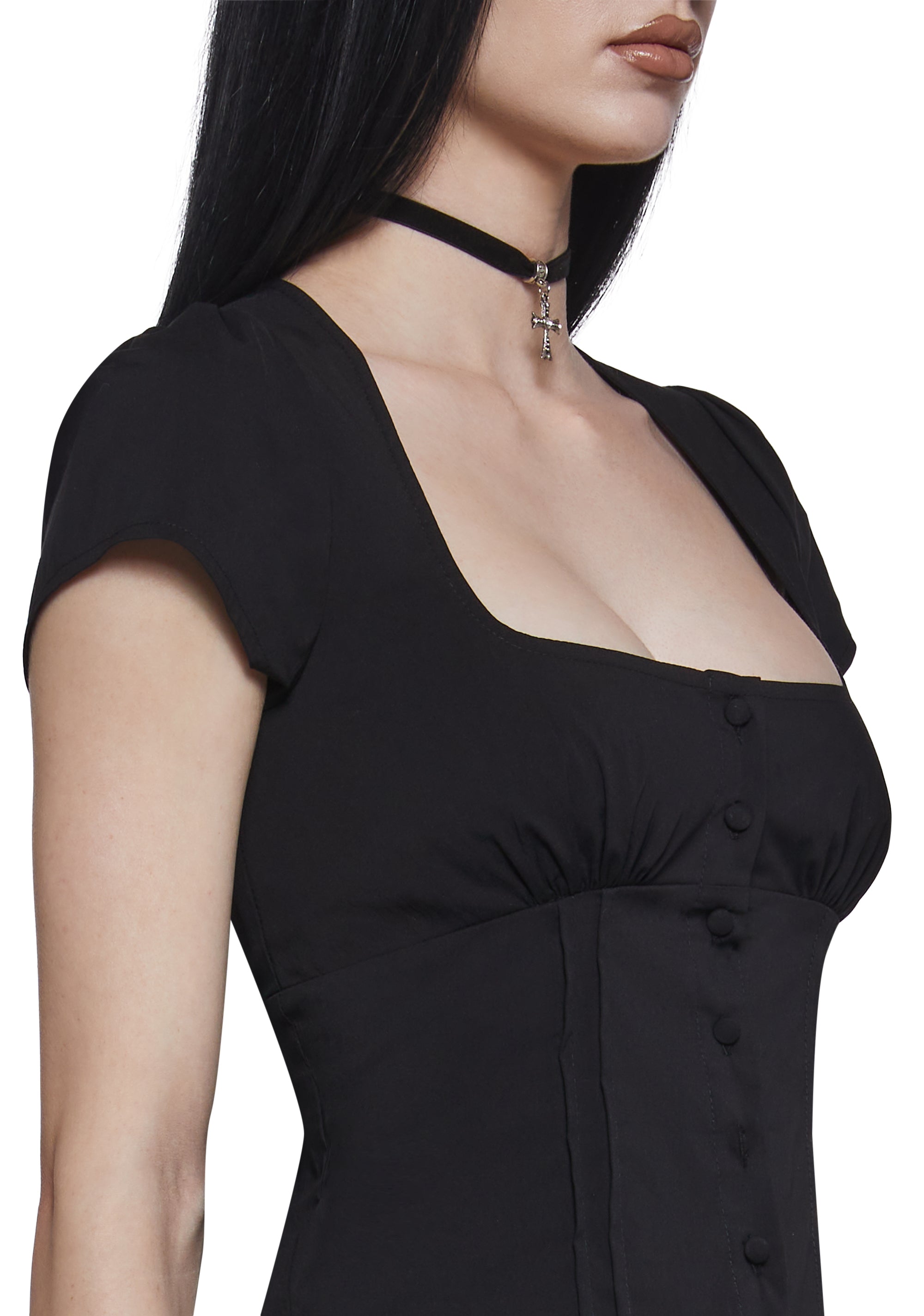 Soft, sultry, and irresistibly feminine, this is your go-to piece for romantic after-dark looks. Designed with a flattering square neckline and a corset-inspired bodice, this blouse sculpts the waist while highlighting the décolletage. Covered buttons down the front and a subtle peplum hem add vintage charm with a modern edge—perfect for nights when you want to feel confident and captivating.