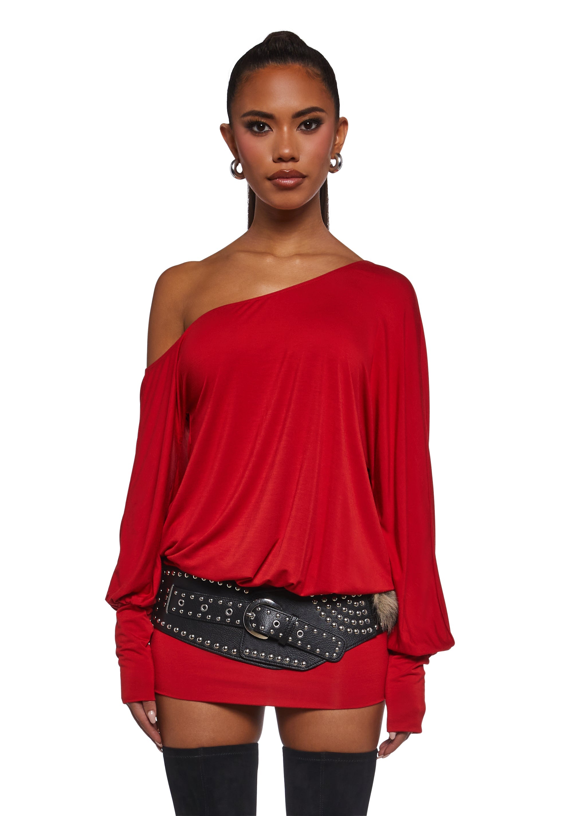 Turn up the heat in this vibrant red mini dress featuring a slouchy off-the-shoulder neckline, billowy long sleeves, and a fitted skirt that highlights your curves. Its soft, stretchy fabric delivers effortless comfort with a bold, chic finish.