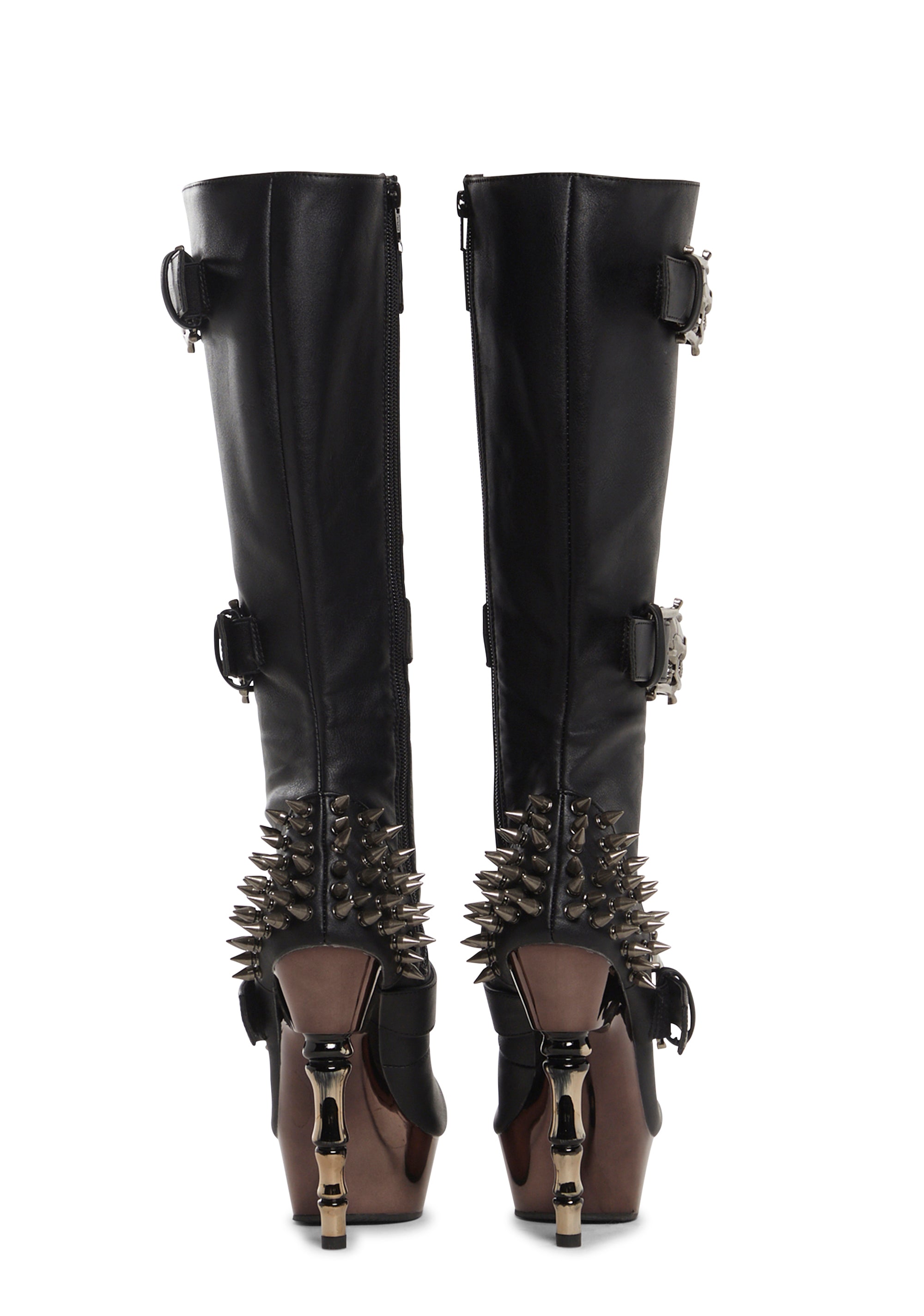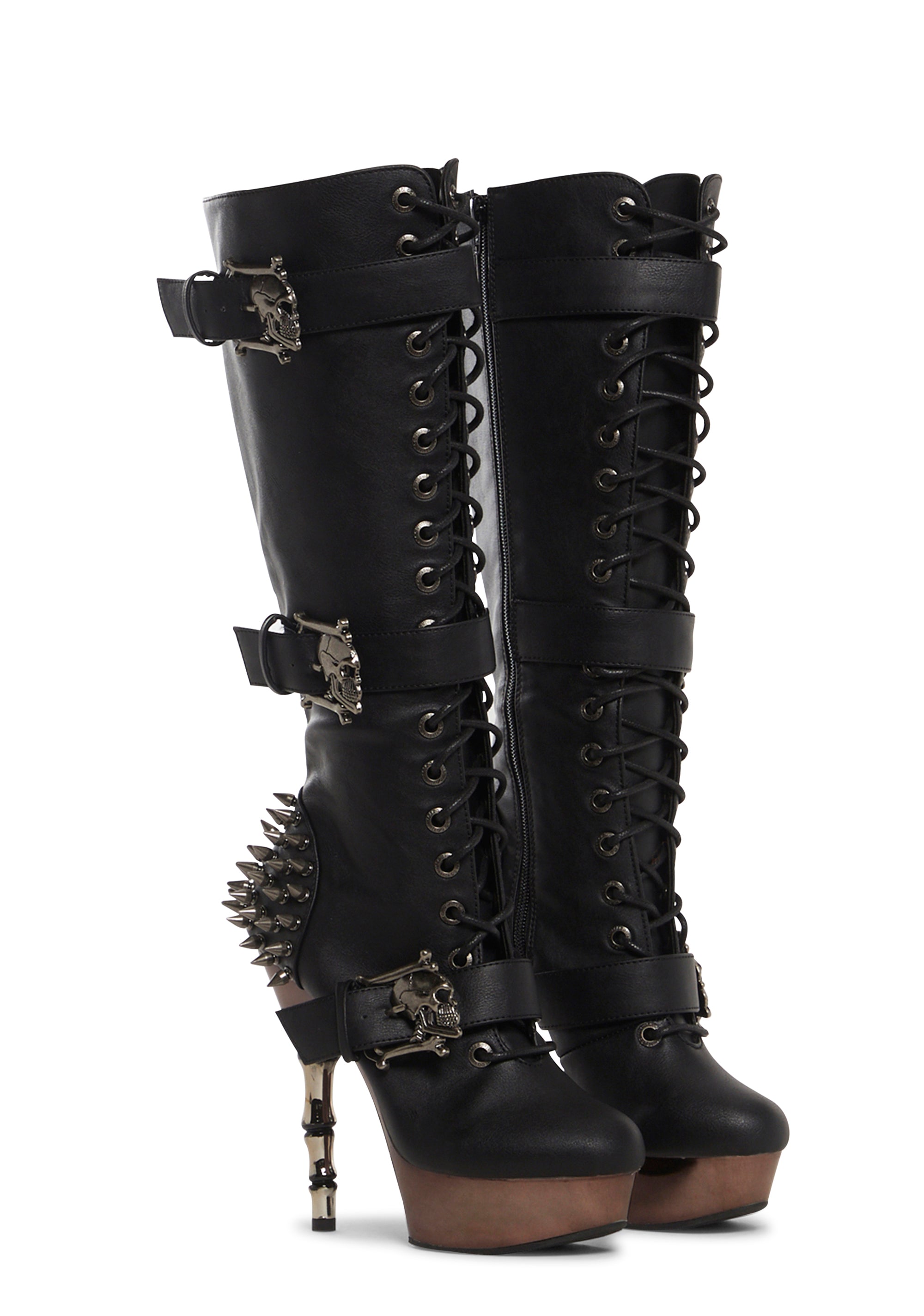 Make an impression with these shoes that have a matte vegan leather construction, spiked stud detailing on the back of the ankle, pewter chrome accents, platform soles, “finger bone” stiletto heels, front lace-ups, skull shaped buckle fasteners, and side zipper closures.