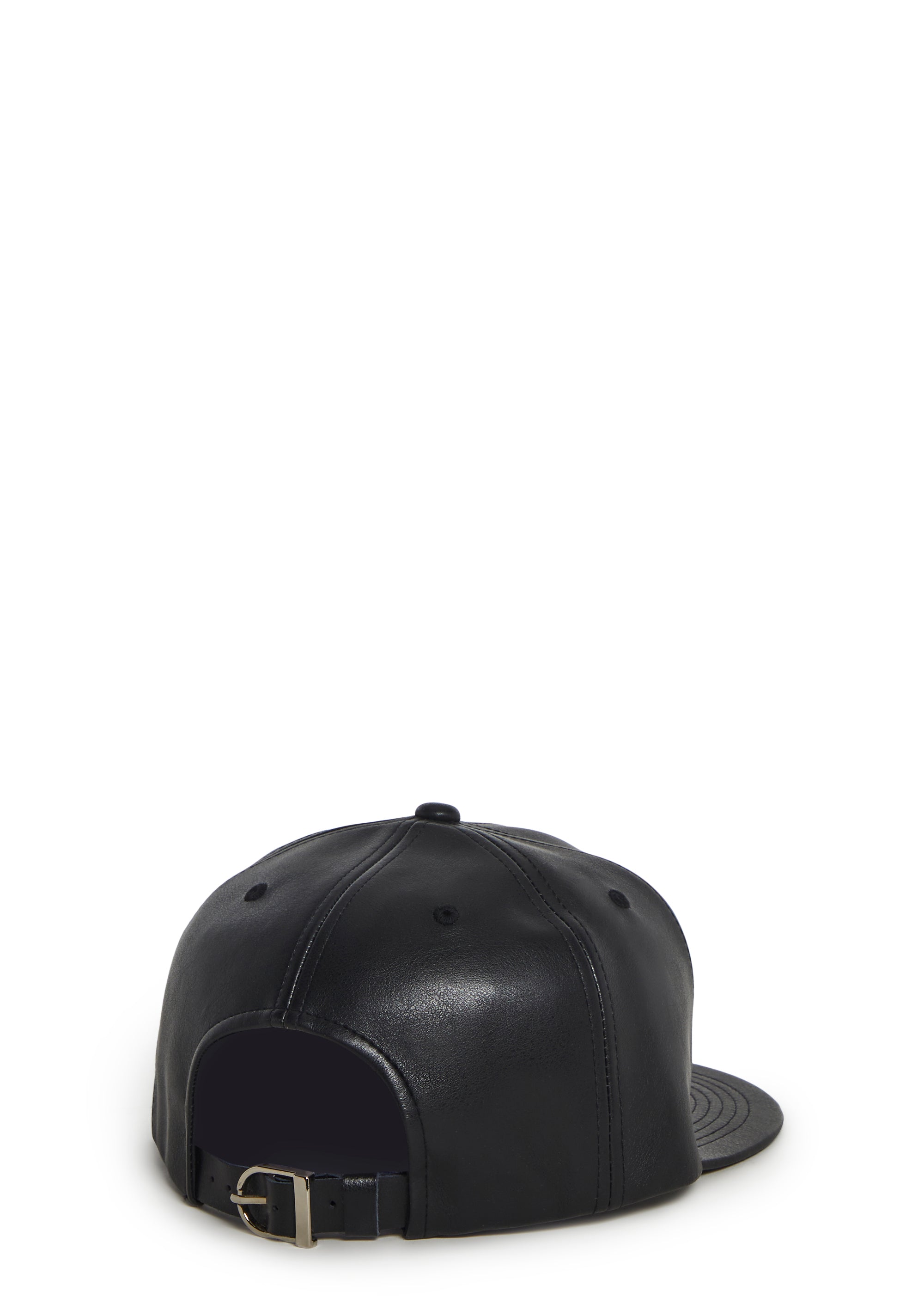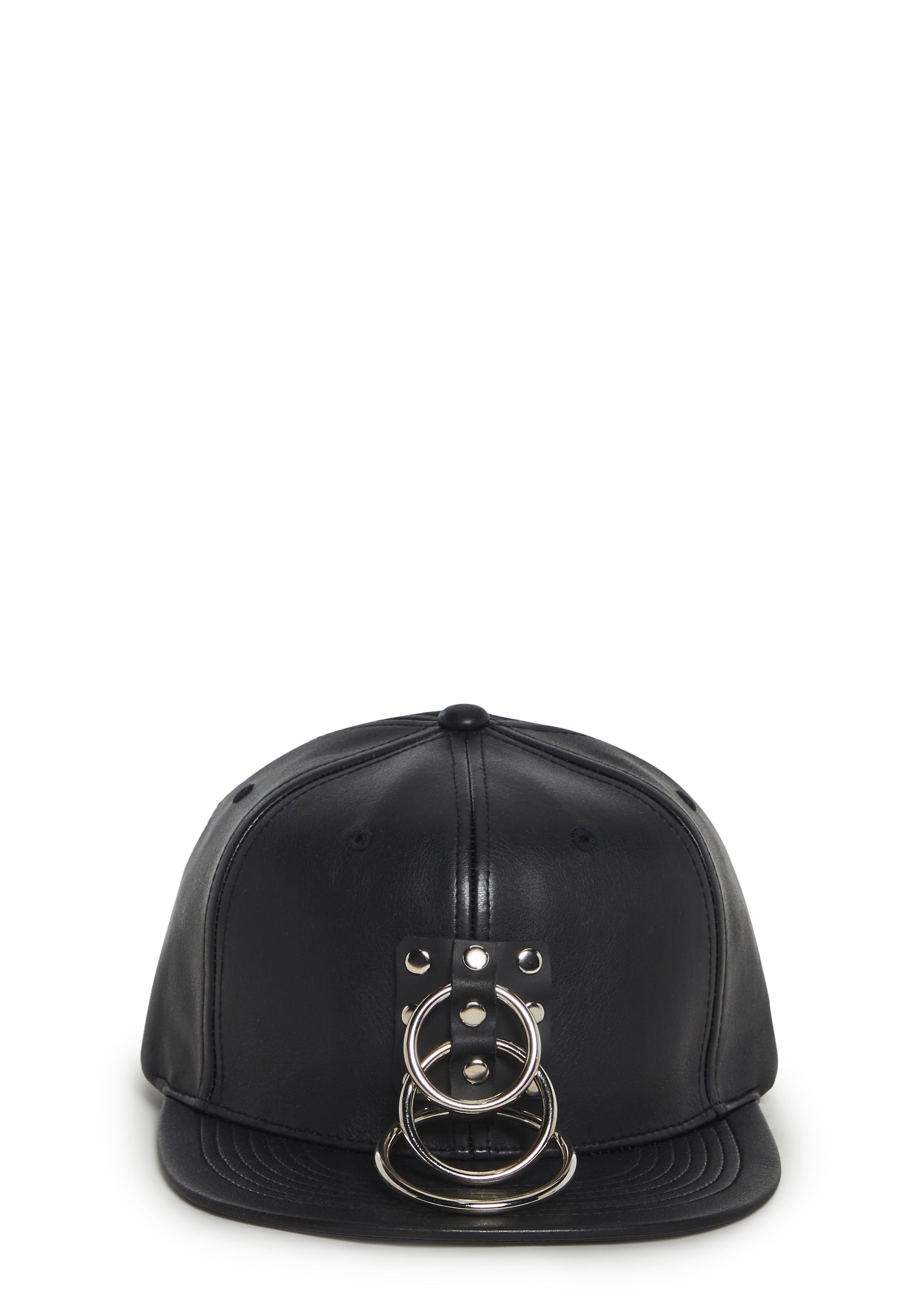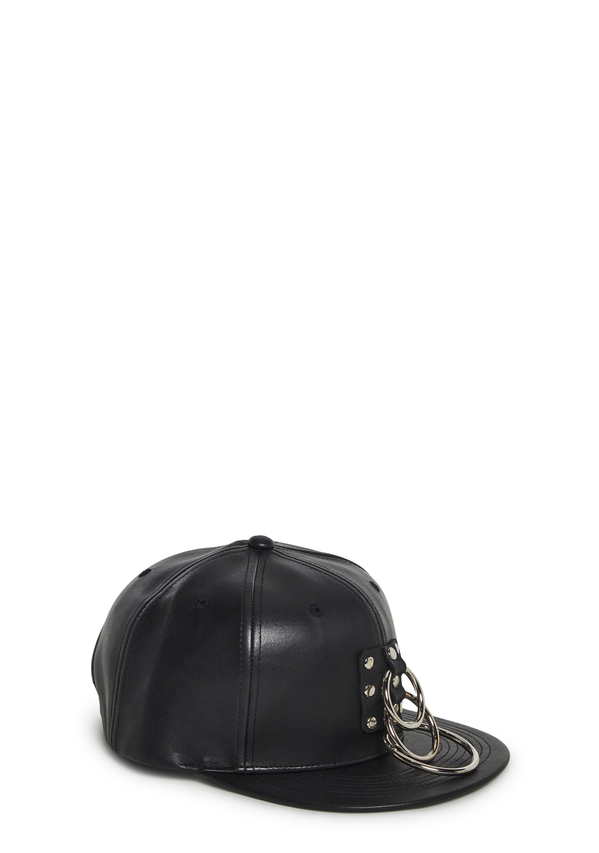 This flat brim baseball hat has a vegan leather construction, punk o-ring hardware on the front and an adjustable back closure on the back.