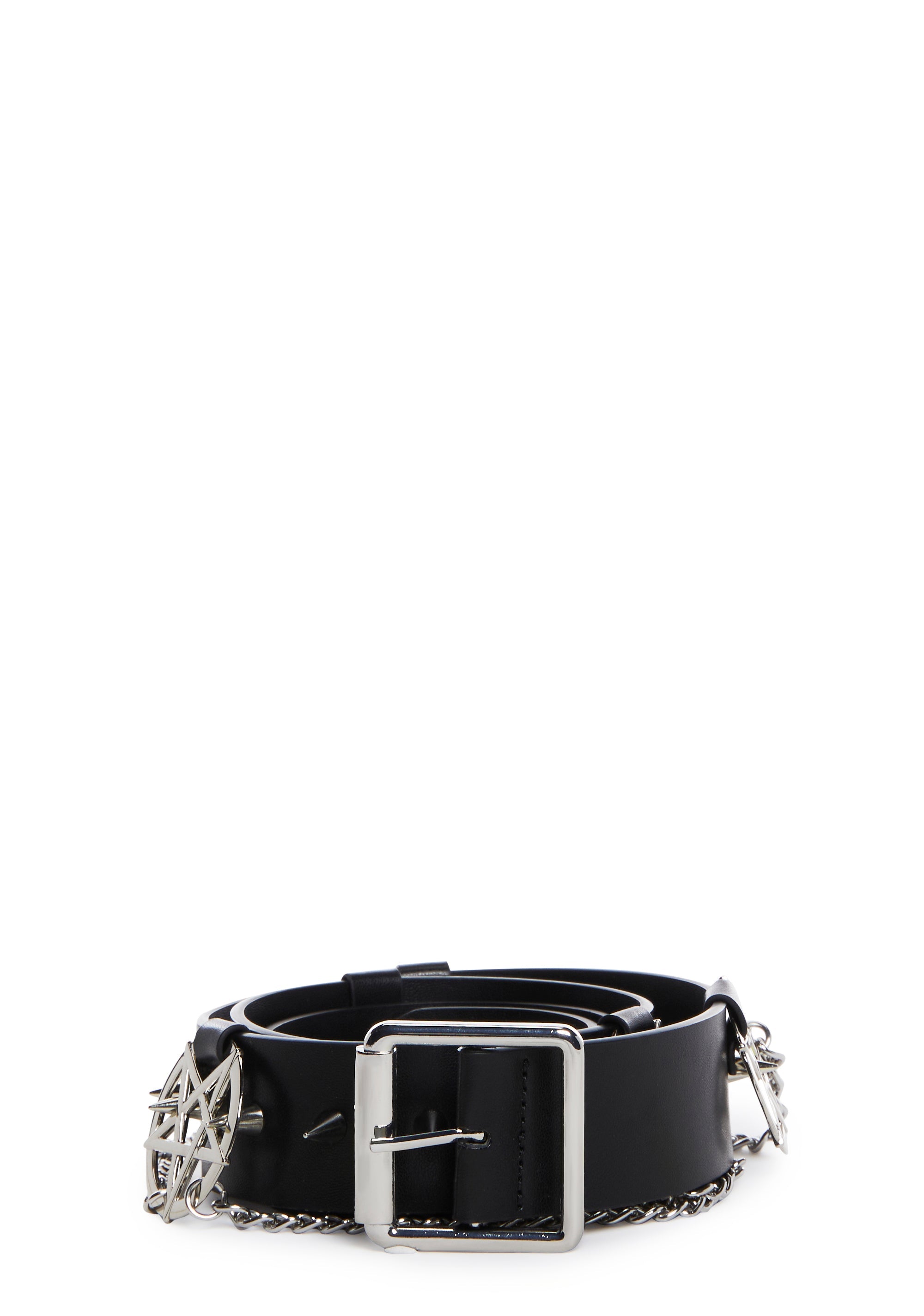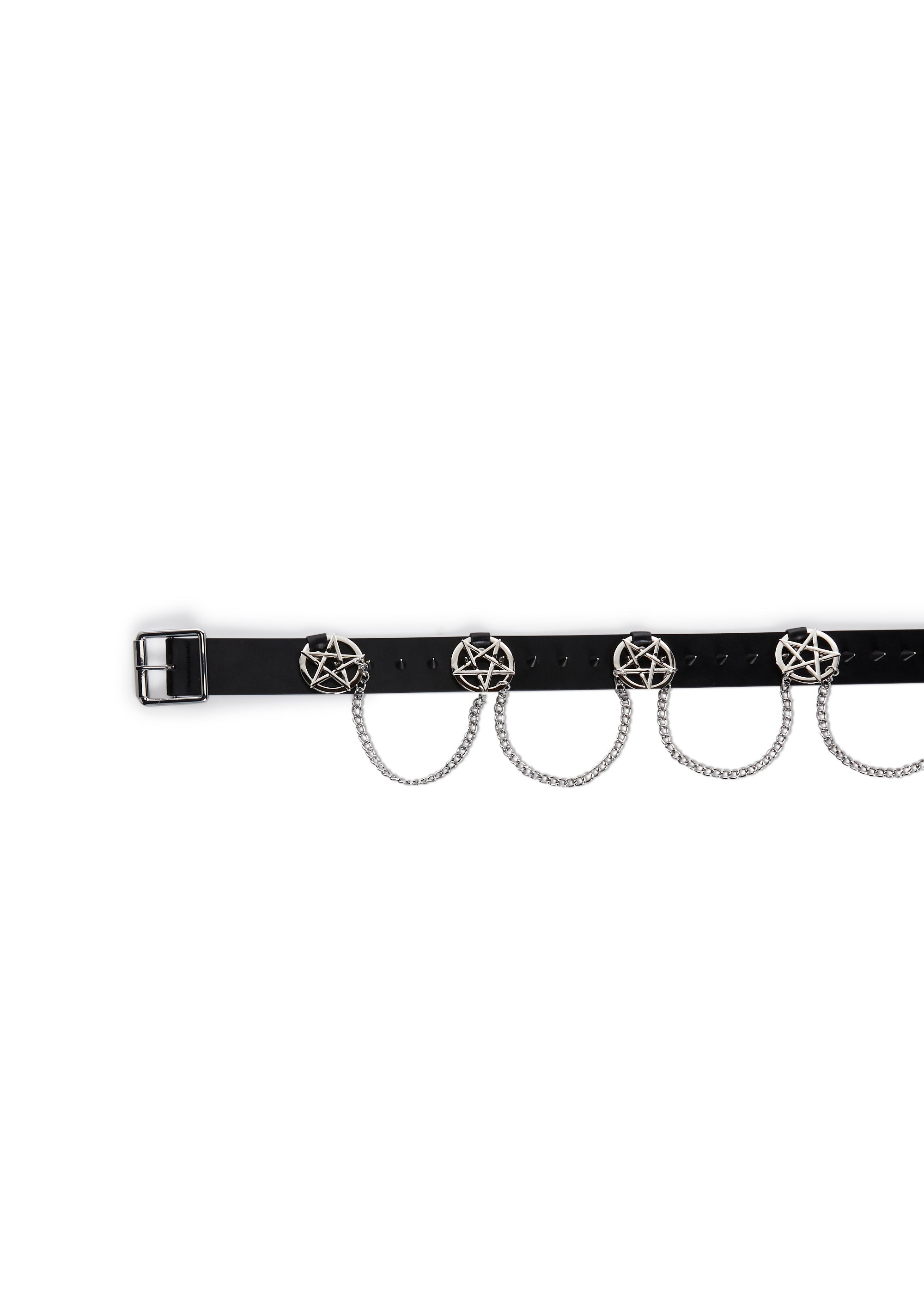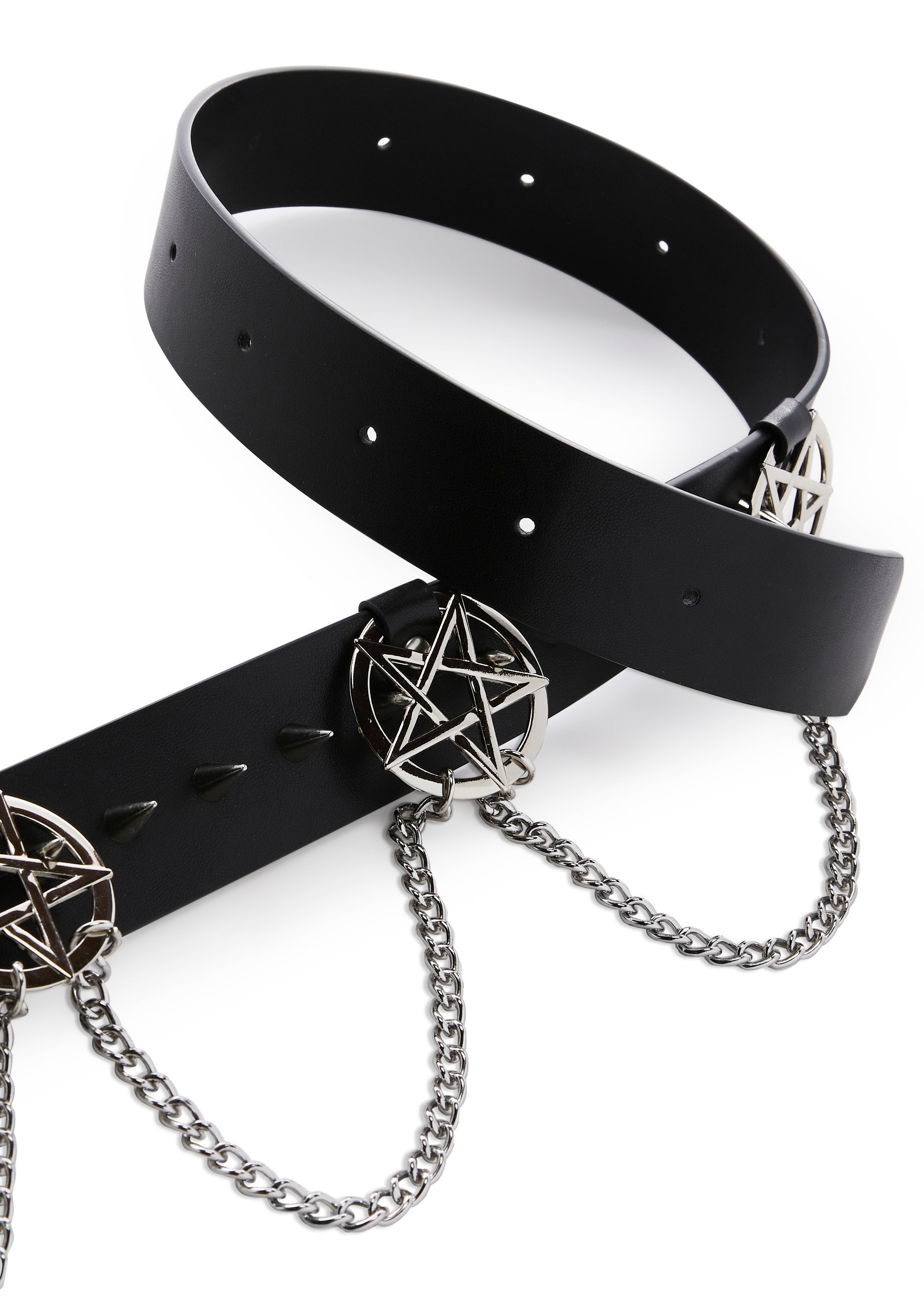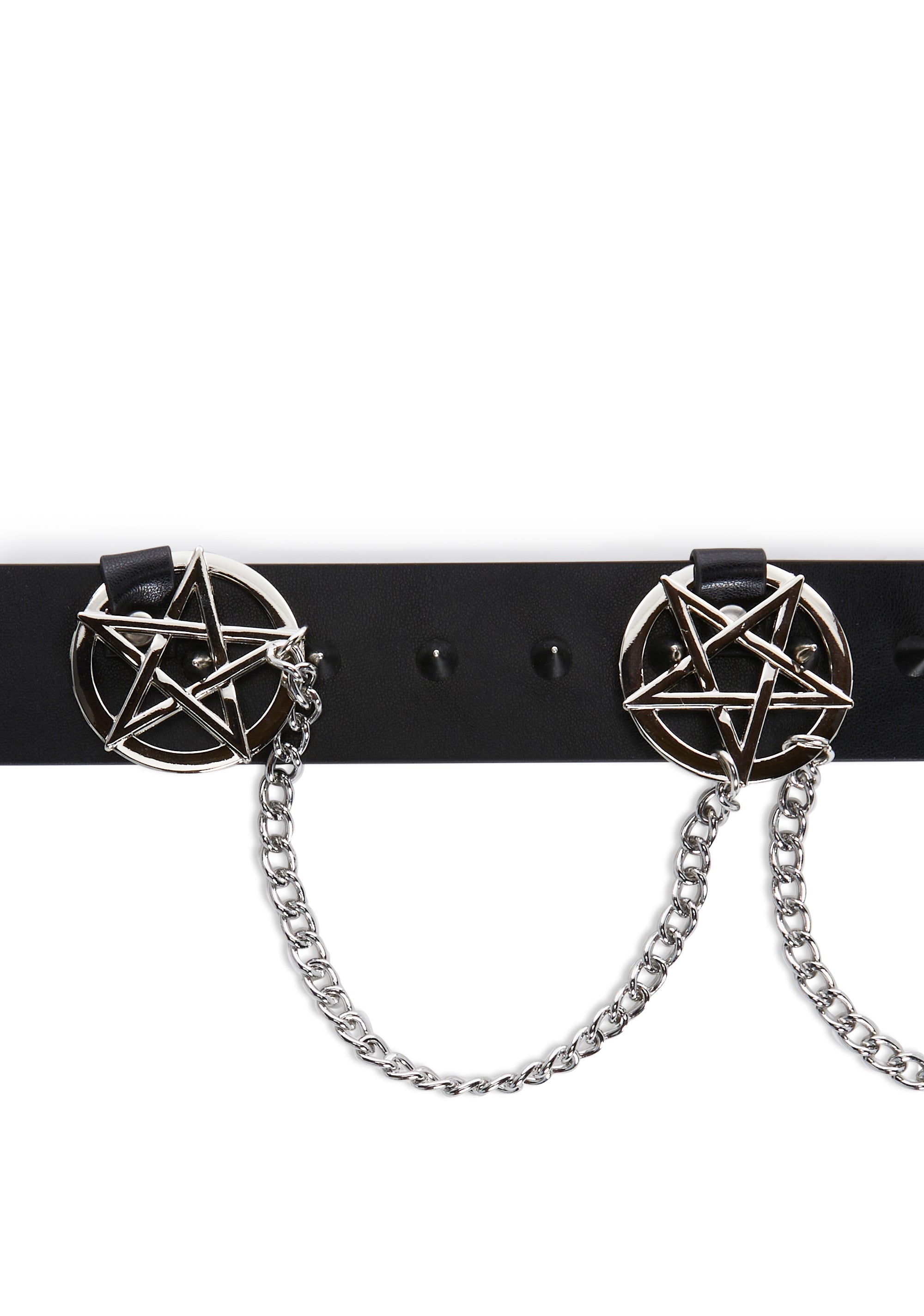 to wreak your havoc. This belt has a vegan leather construction with a draped chain design, spiked details, pentagram shaped hardware, and an adjustable buckle closure.