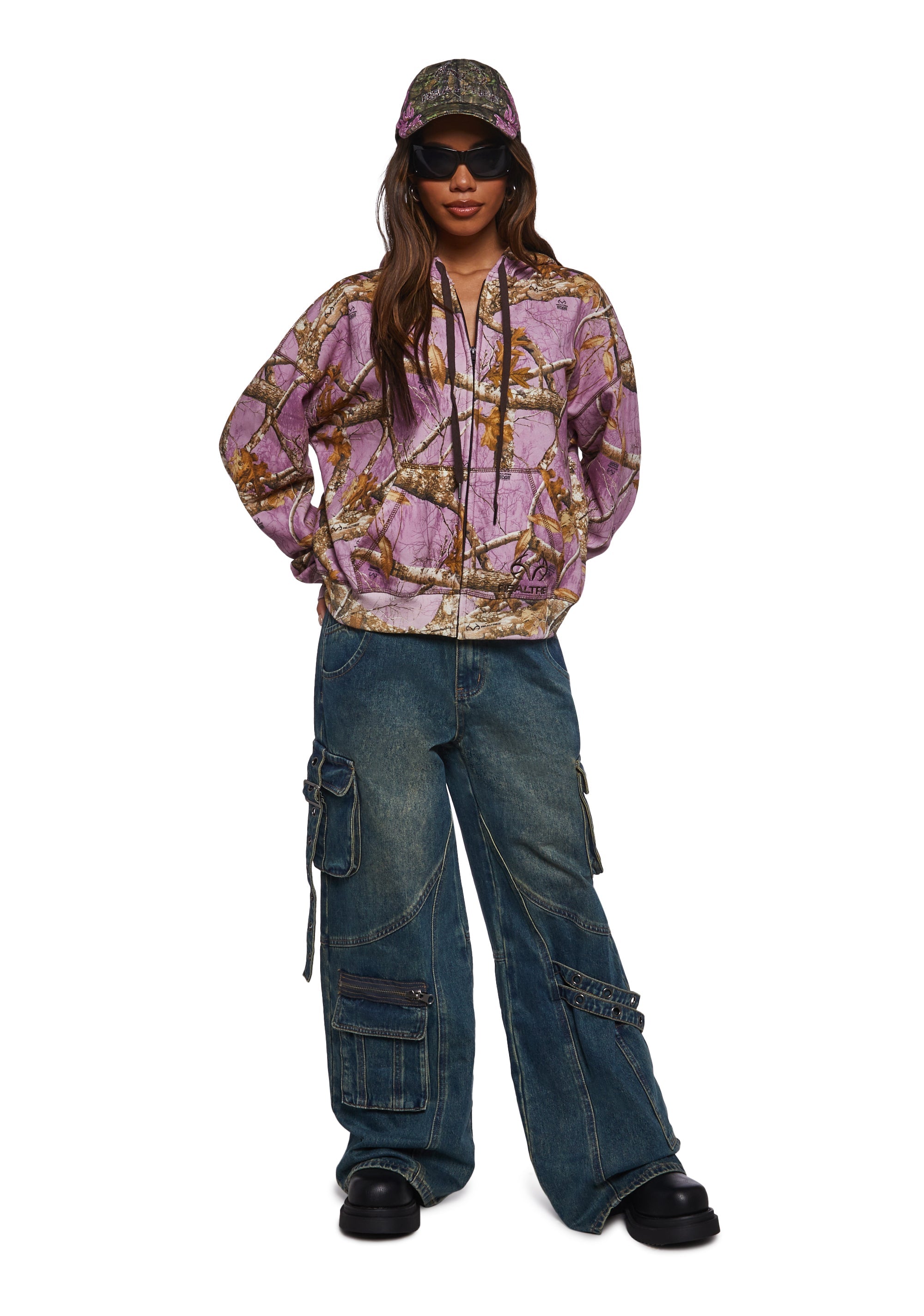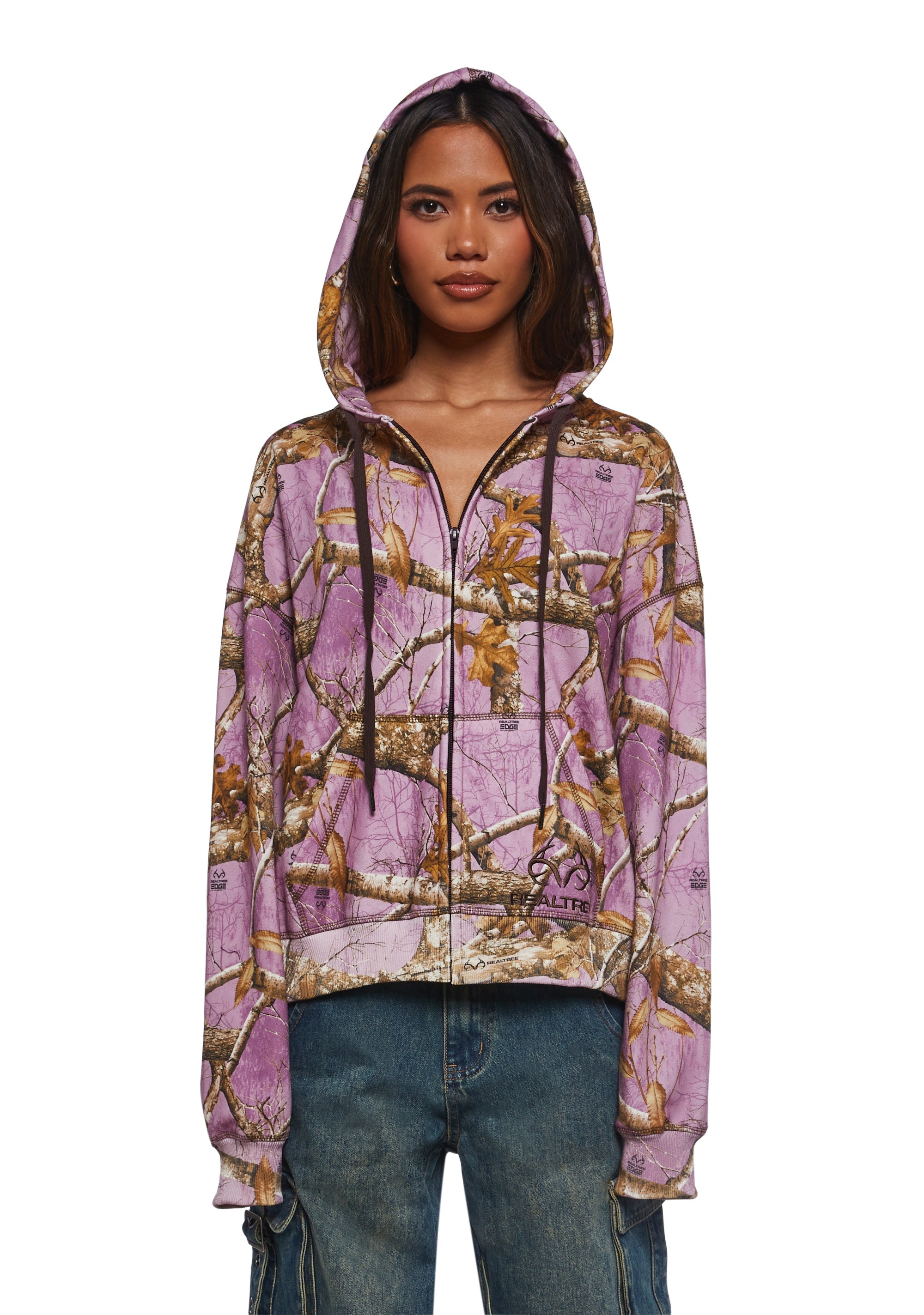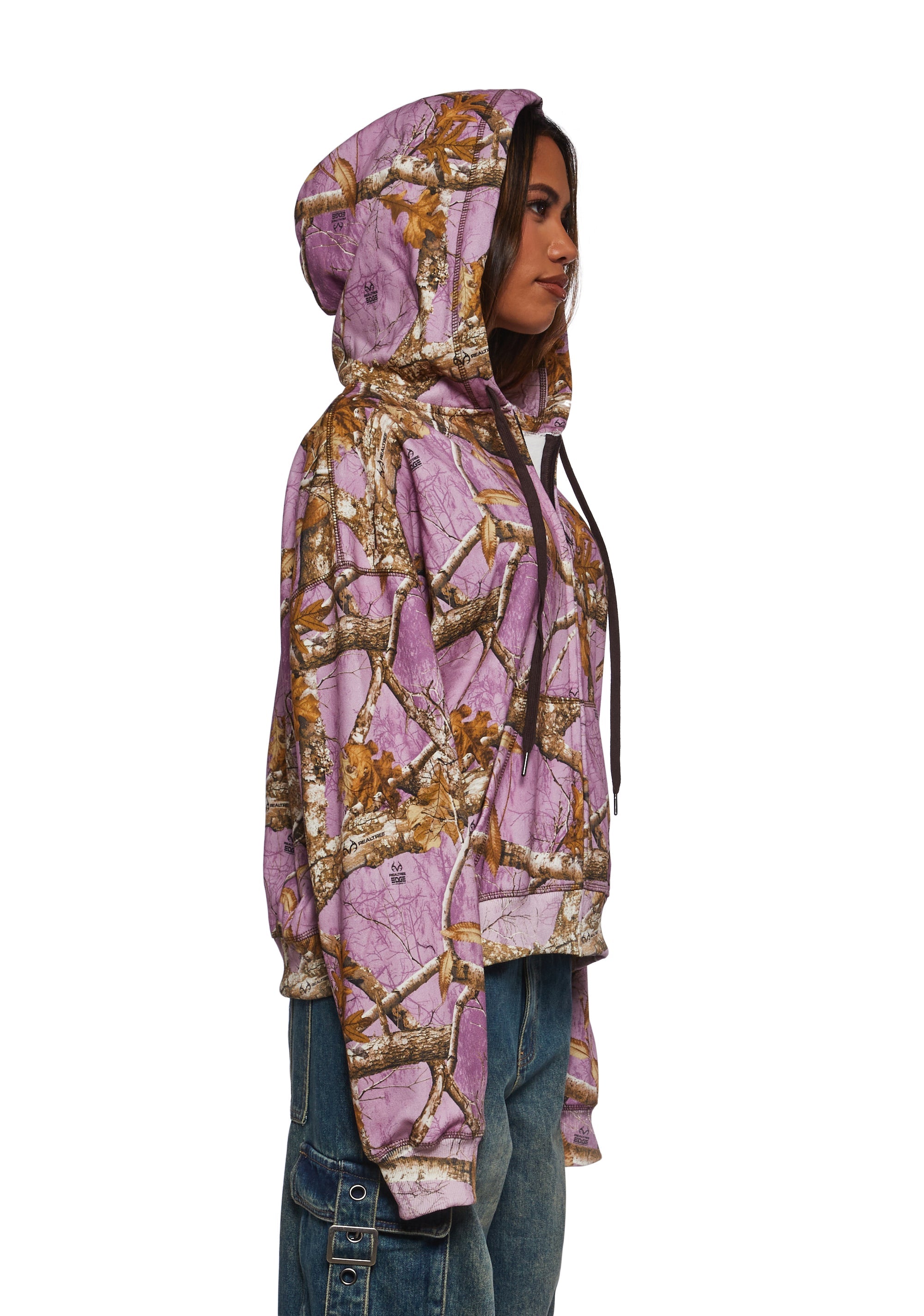 This hoodie has the signature realistic all over camo pattern against a pink background, kangaroo pockets, RealTree embroidered logo on the front, and attached hoodie with adjustable drawstrings.