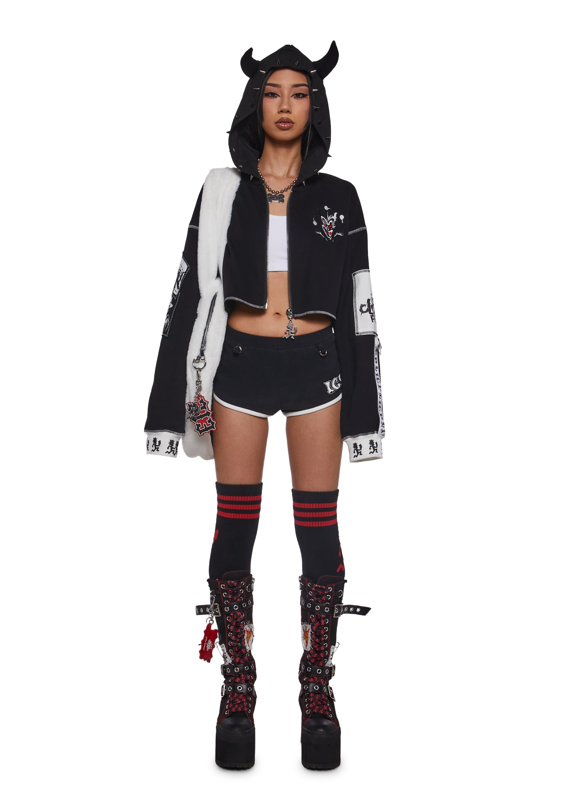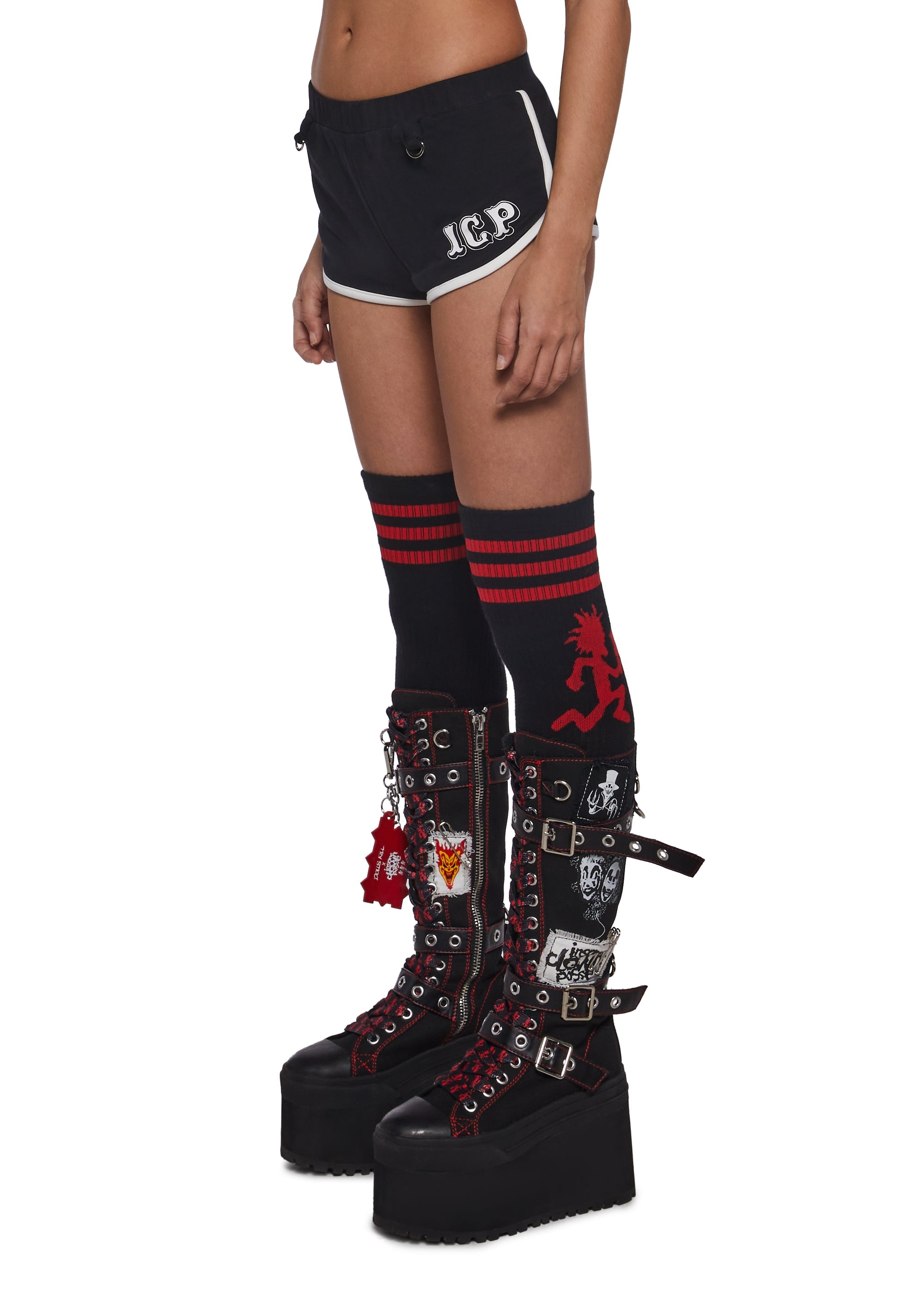 These booty shorts have a stretchy cotton construction, an elastic waistband, D-ring hardware, ICP logo on the front, a contrast colored trim, and Violent J and Shaggy 2 Dope graphics on the front.