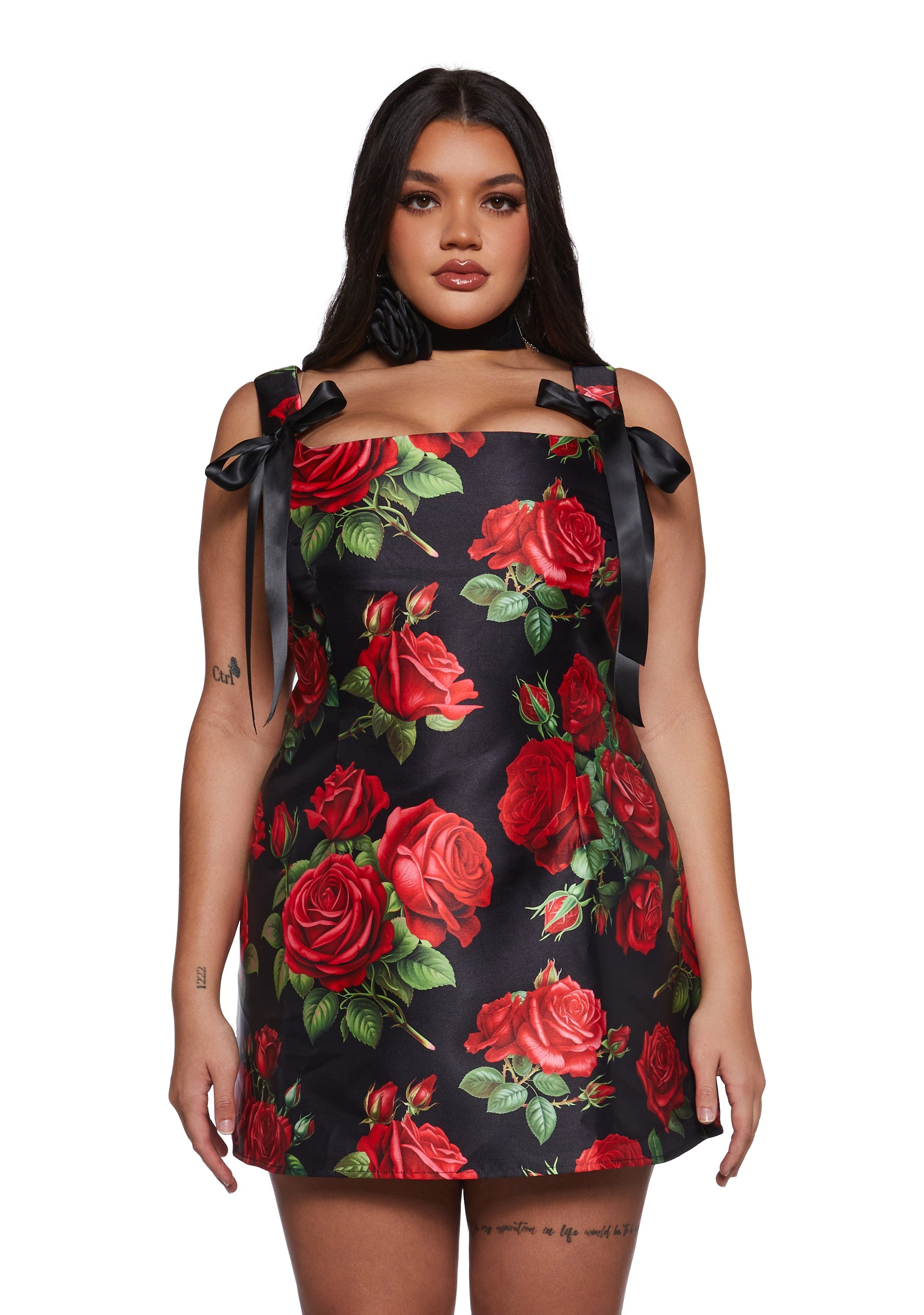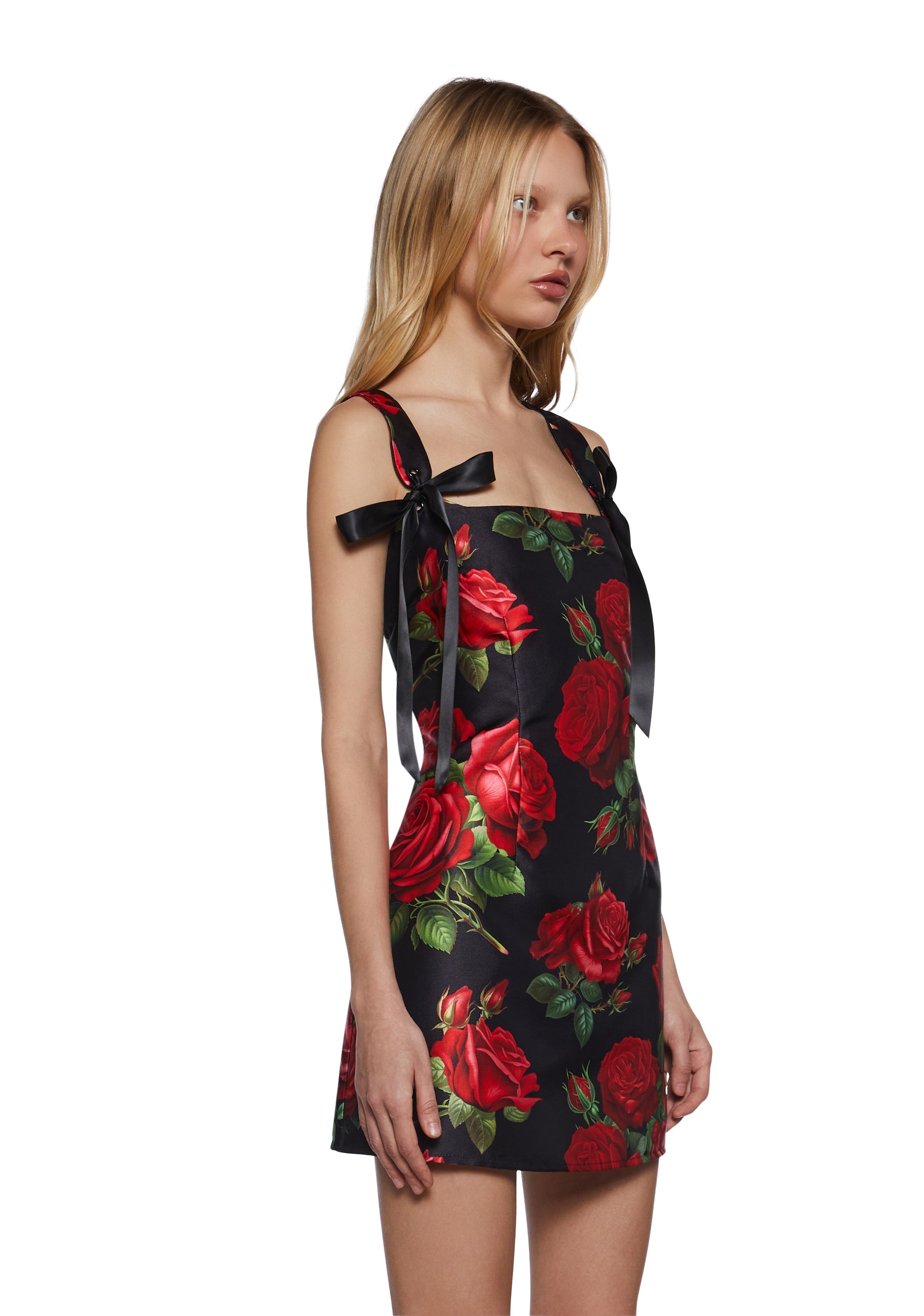 This mini dress has a non-stretch taffeta construction, an all-over rose print, adjustable ribbon shoulder ties, a fit-and-flare silhouette, and a back zip closure.