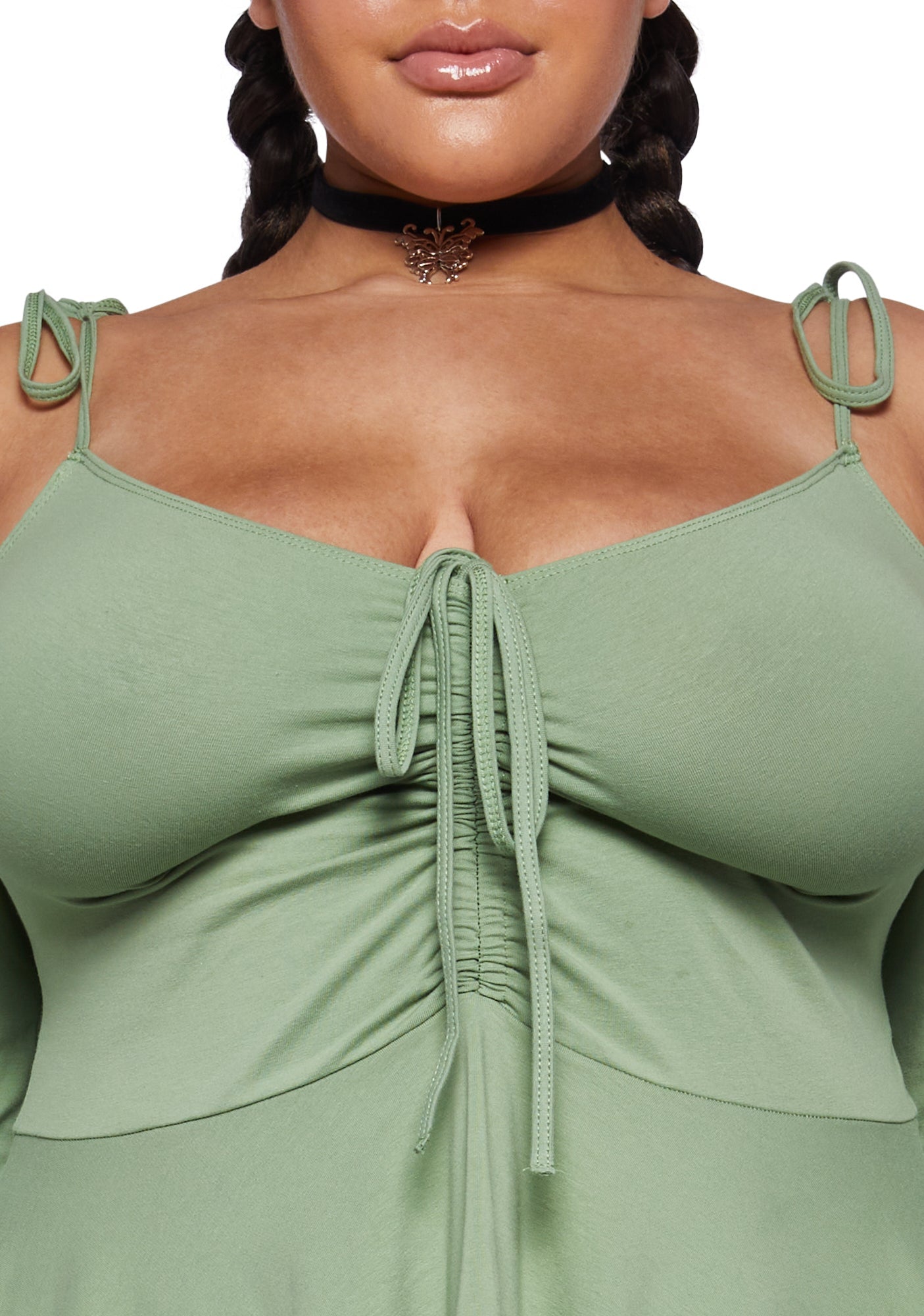 cuz you make this world magical. This mini dress comes with off the shoulder sleeves, spaghetti straps with tie closures, ruching at the chest with a tie closure, and a handkerchief detail, hem, and cuffs.